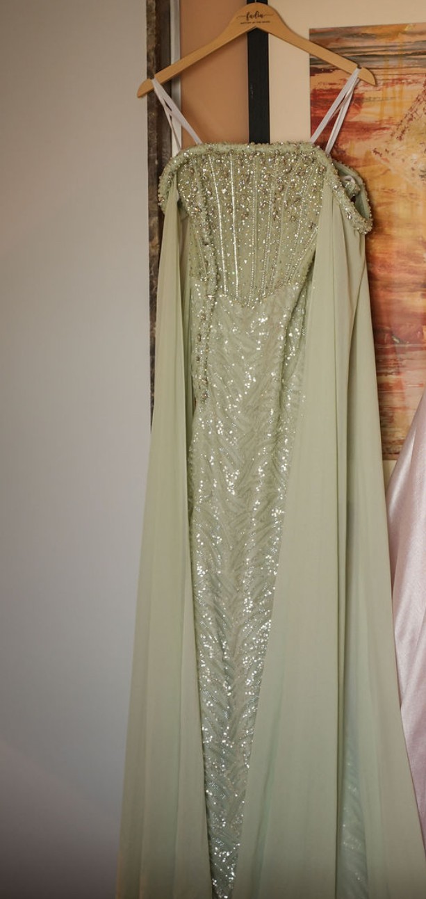 This dress is not only comfortable but also lightweight, allowing you to move with grace as you glide down the aisle. The intricate beading and crystals add a touch of sparkle, catching the light beautifully as you celebrate your love. With a daring high slit, this dress offers a modern twist, letting you showcase your shoes and adding a bit of excitement to your look.