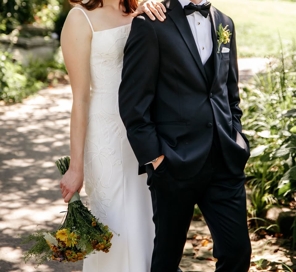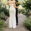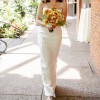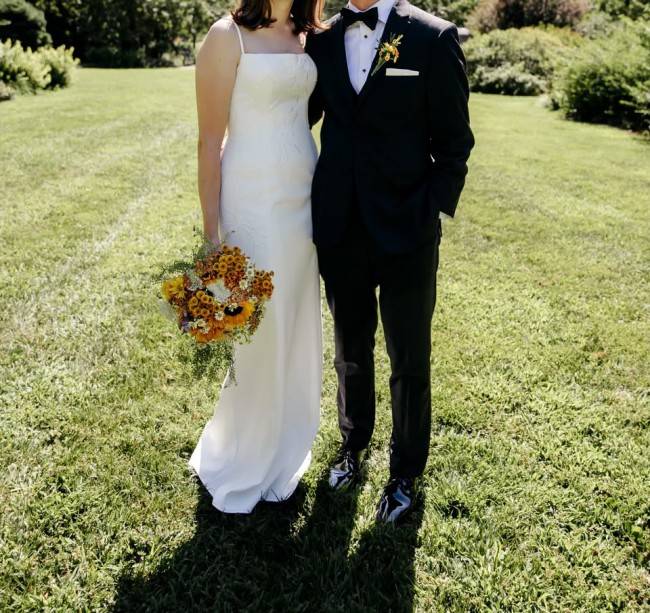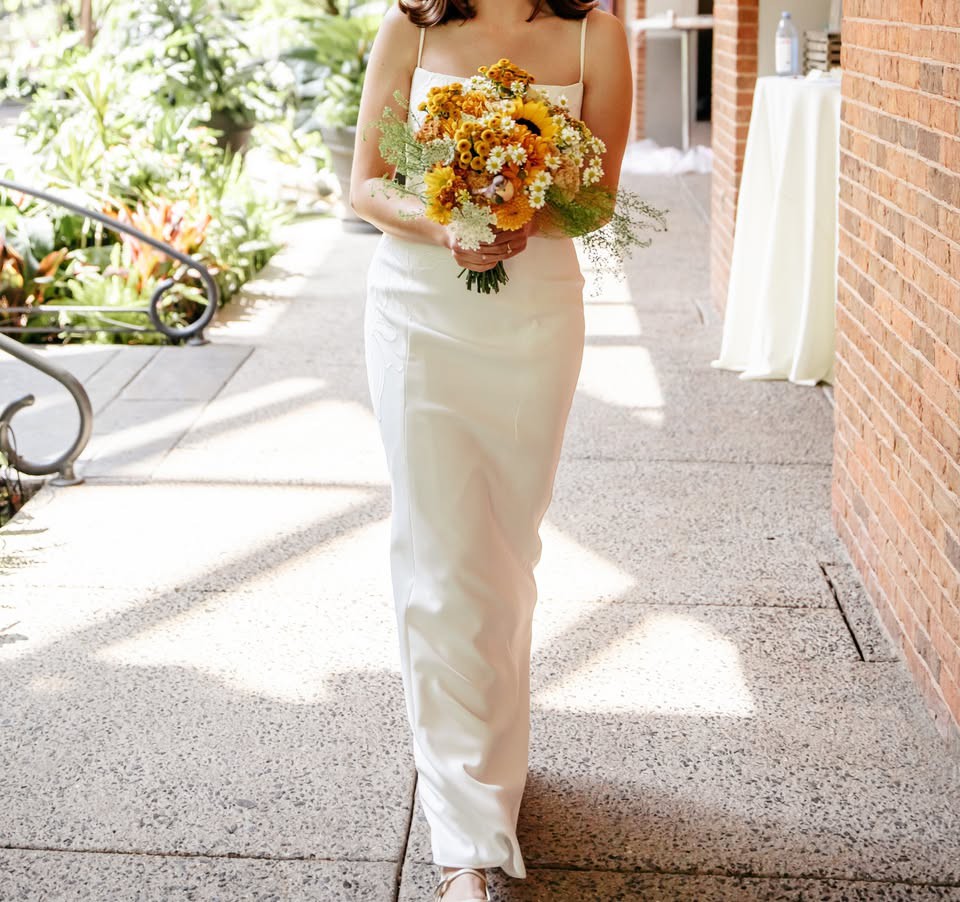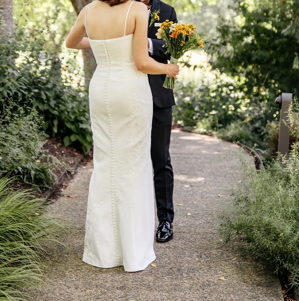- Removed train, took in sides for a straight silhouette, hemmed to 5'7" with flat shoes, sewed on straps that came with dress, sewed in bra cups
