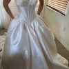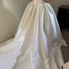 This is a gorgeous ivory satin cat eye ball gown. The luxurious satin fabric drapes beautifully, creating a stunning silhouette that highlights the natural curves of the body.