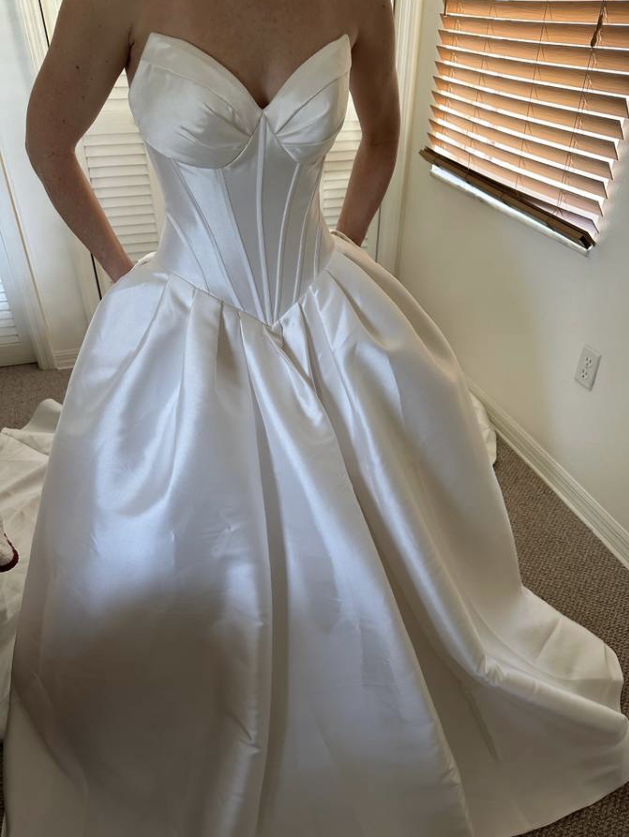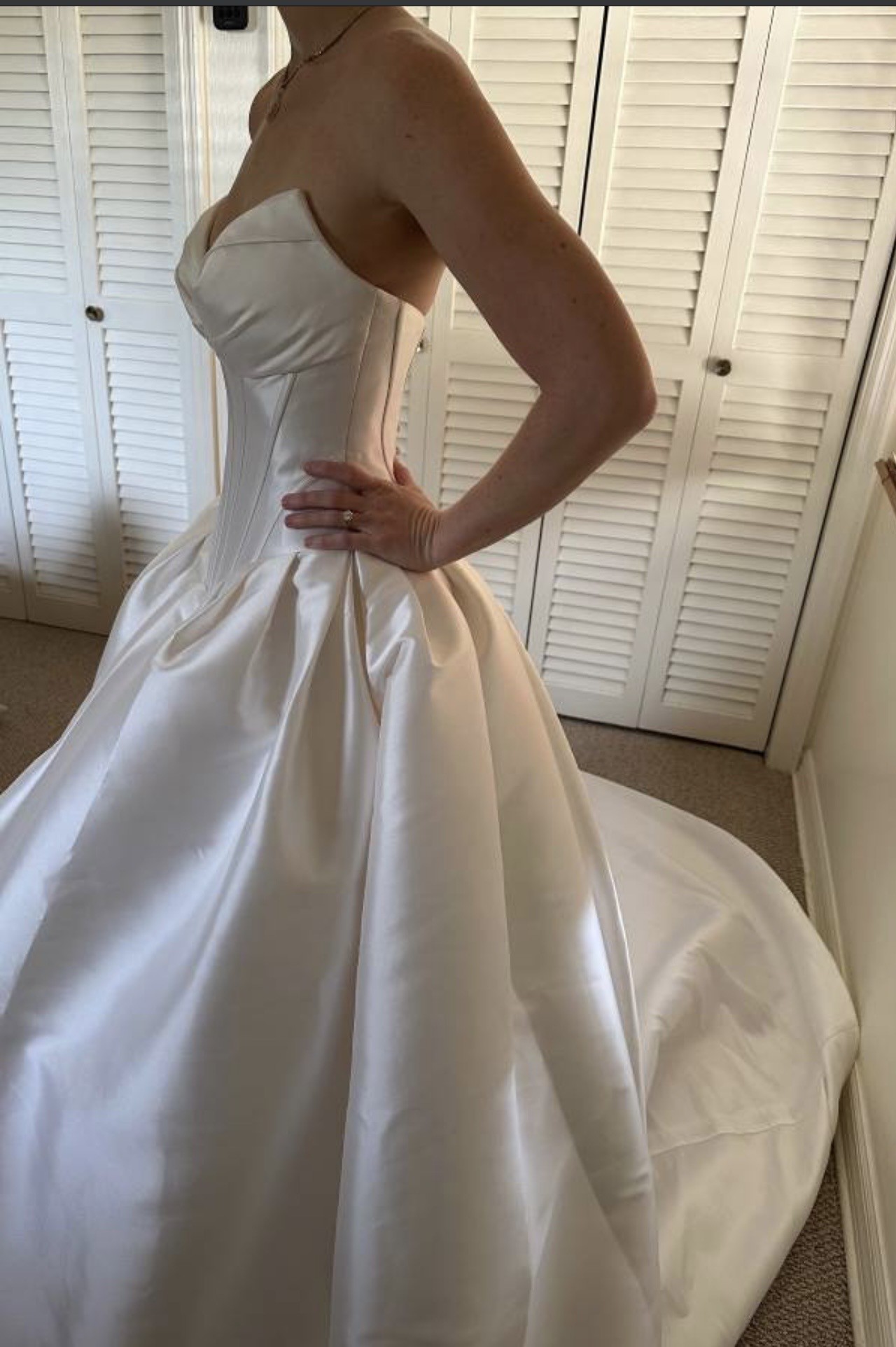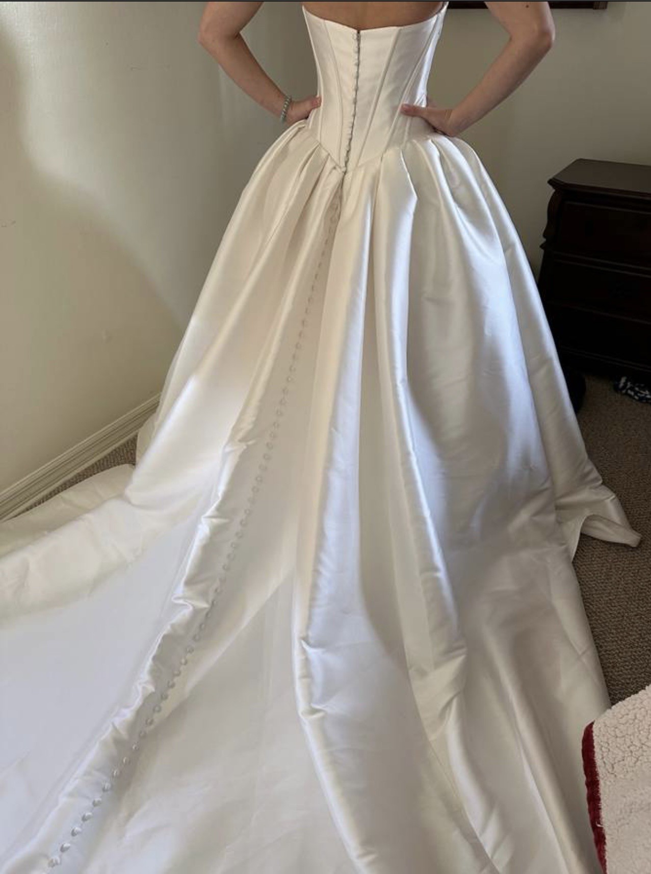 This dress has never been worn other than to take the photos displayed. It has never been altered and there are absolutely no tears or stains of any kind.