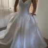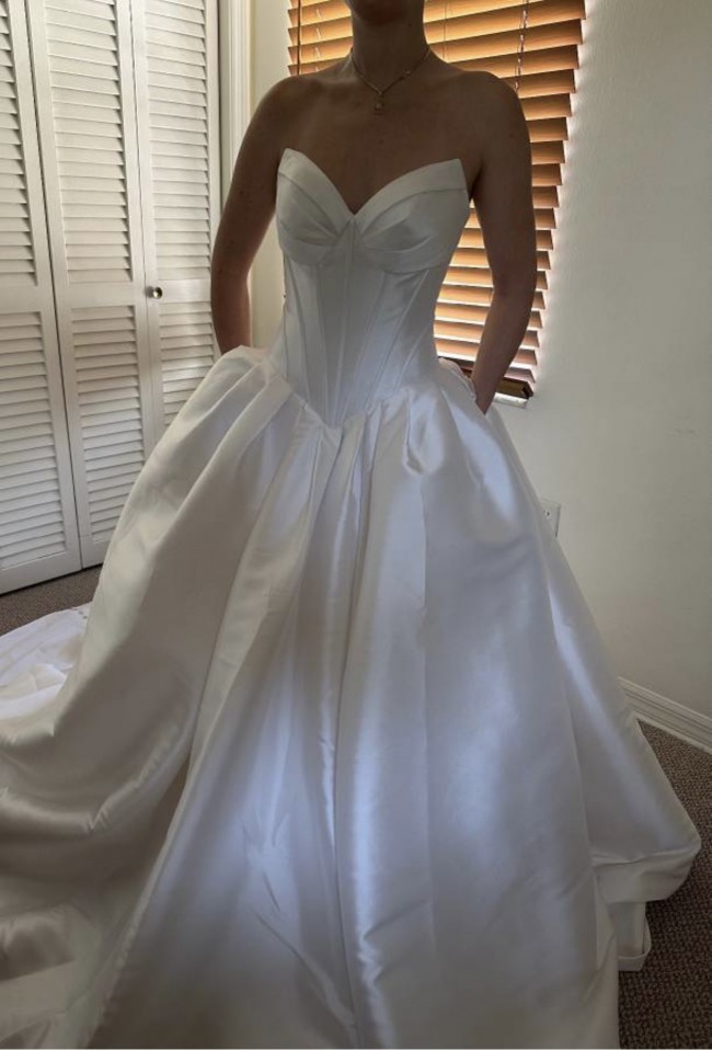 The dropped waist design offers a unique twist to the classic ballgown look, giving it a modern edge without compromising on sophistication. The mid back and strapless neckline create a flattering, timeless feel, making it perfect for any romantic setting, from grand ballrooms to intimate garden ceremonies.