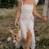 - hand draped faux wrap skirt with front split