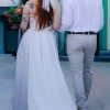 Crafted in a timeless white, the gown features a straight neckline that has a beautiful sheer fabric feature.