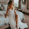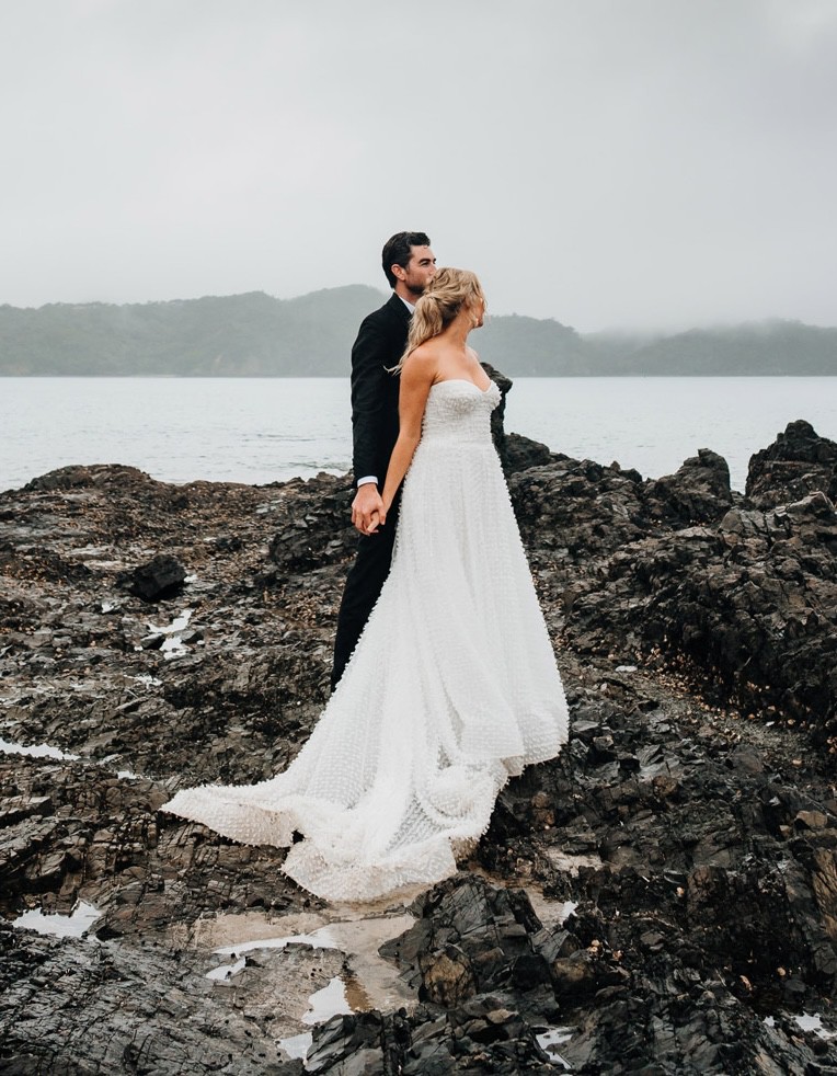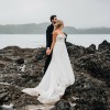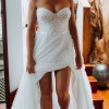 Beautiful, ethereal Billie gown in ivory by Anna Campbell with long train and slightly transparent, textured outer layer which looks incredible in photos with the light shining through the outer layer. Super flattering corset and A-line skirt, and also super comfortable and lightweight. Because the corset is short, you can still breath and relax (and eat!) while still looking slim thanks to the A-line skirt!