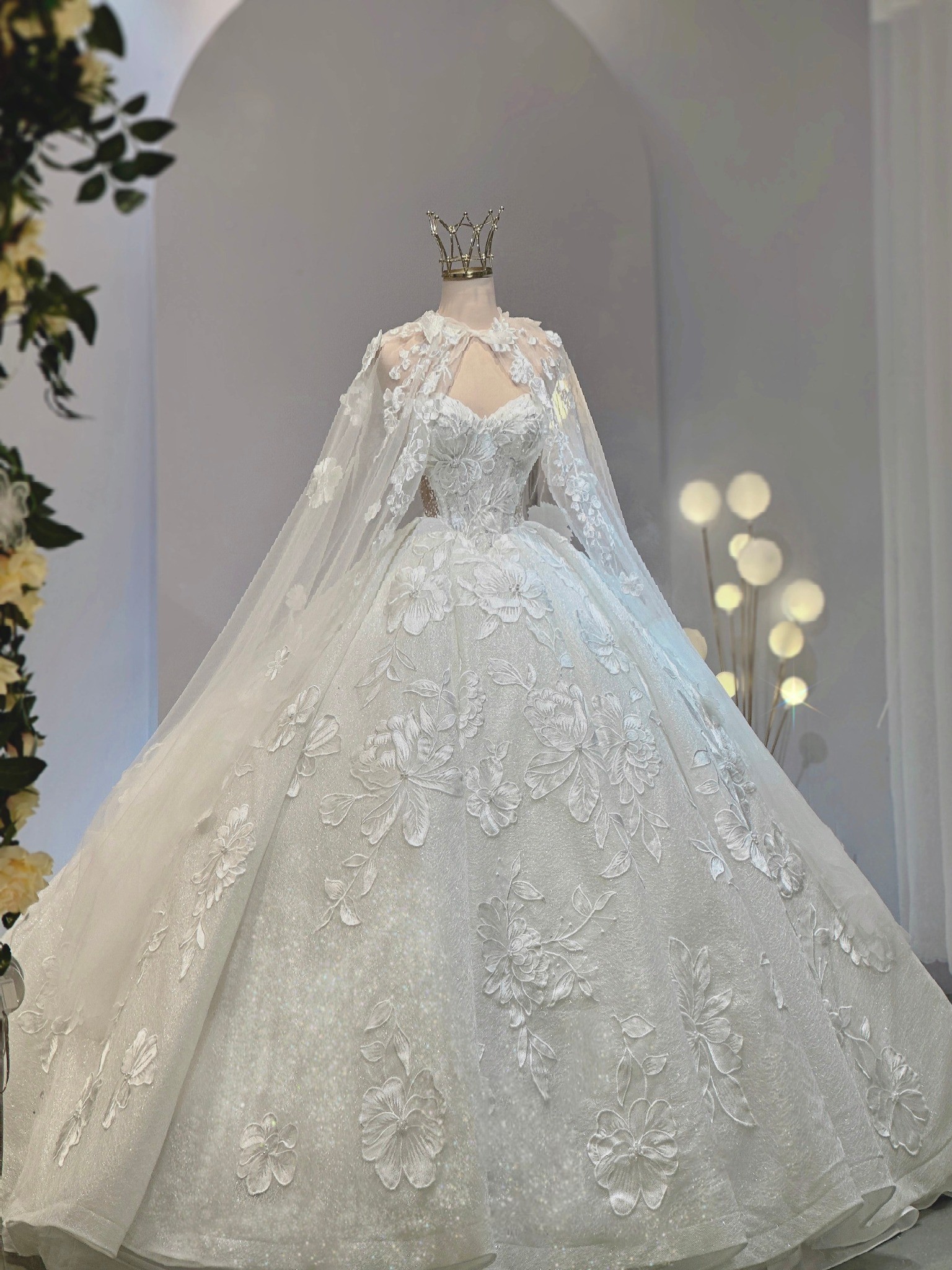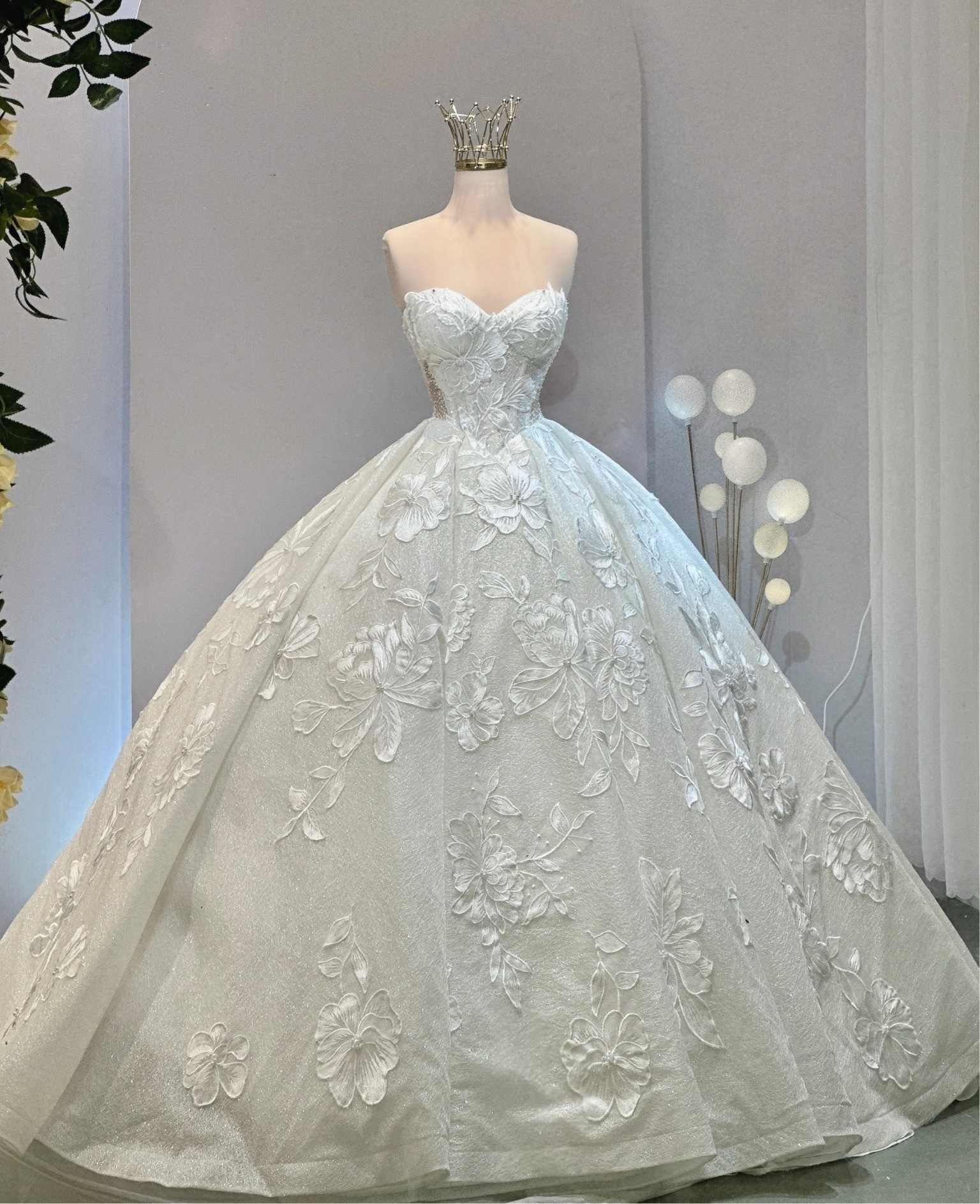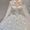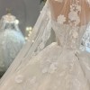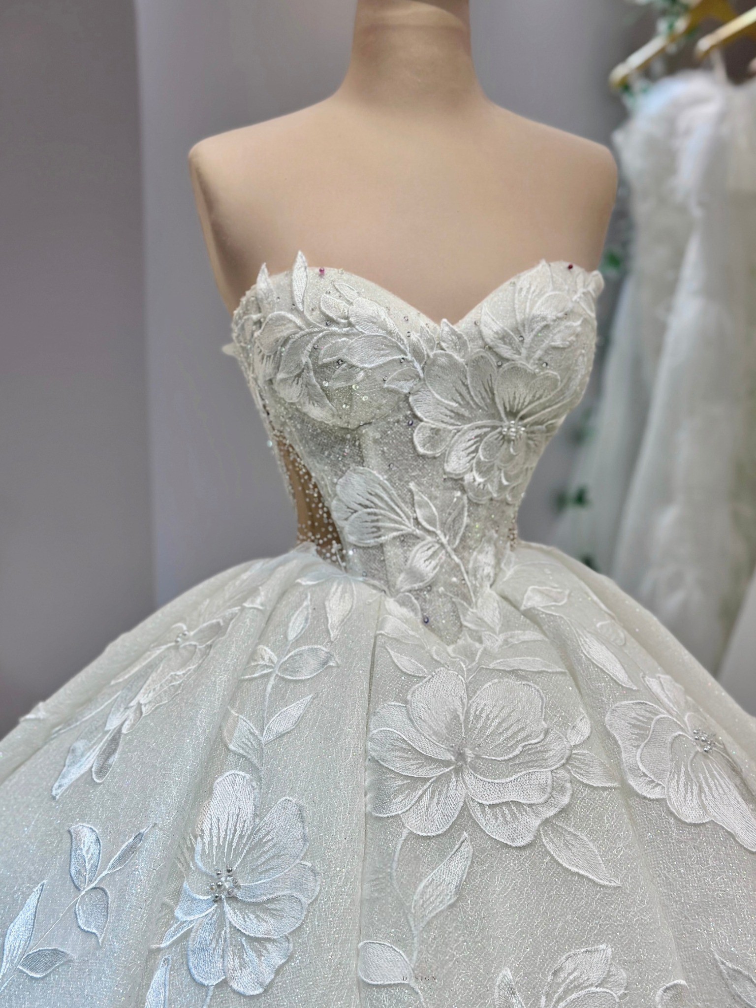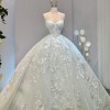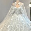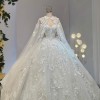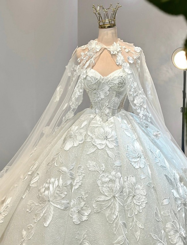 As you glide down the aisle, the floor-length design flows gracefully, adorned with exquisite 3D flowers, delicate beading, and shimmering crystals. Each intricate detail is thoughtfully placed, catching the light during every moment of your special day. The sequins add a touch of sparkle, ensuring you glimmer with joy as you celebrate the beginning of your new journey.