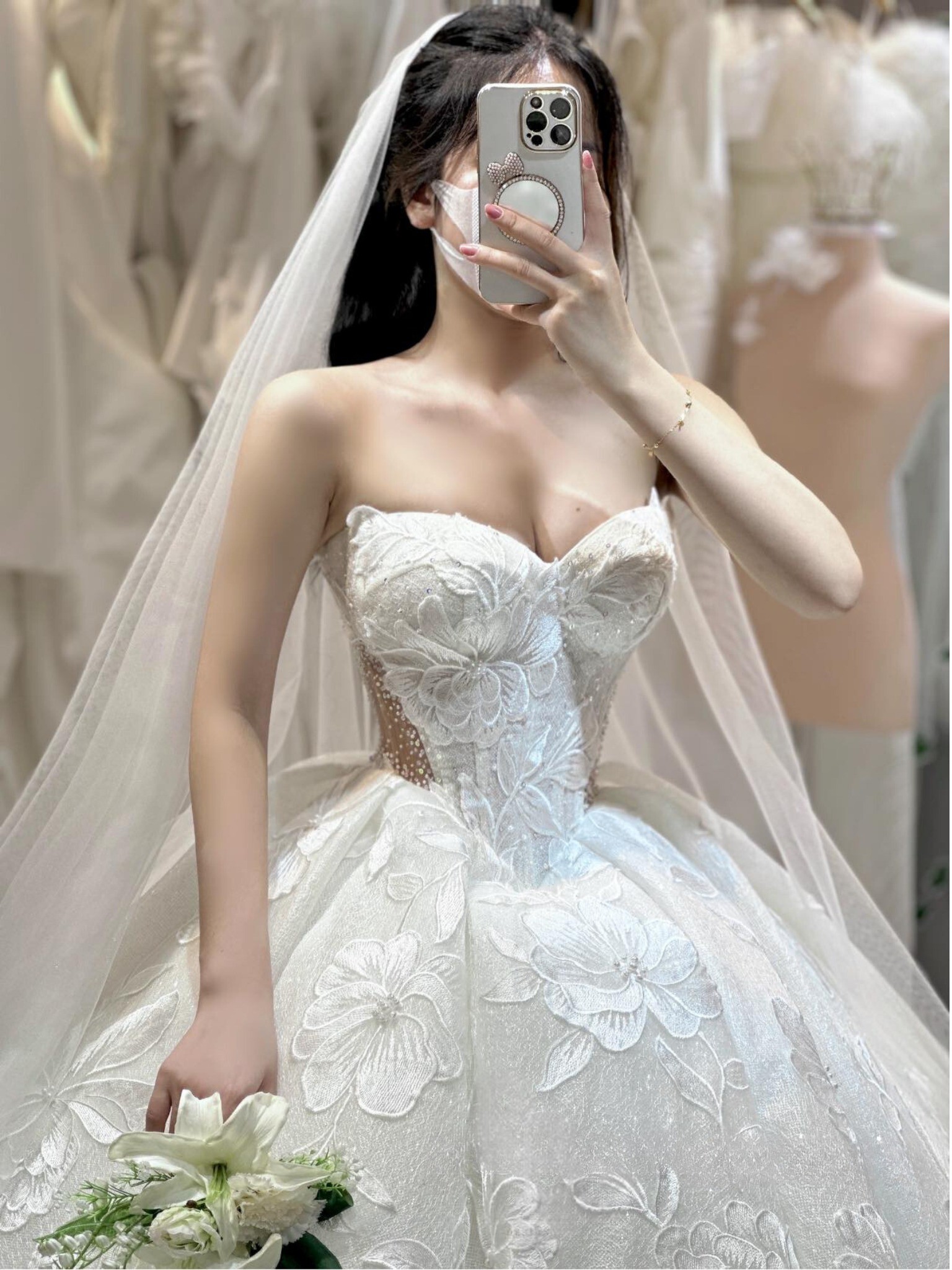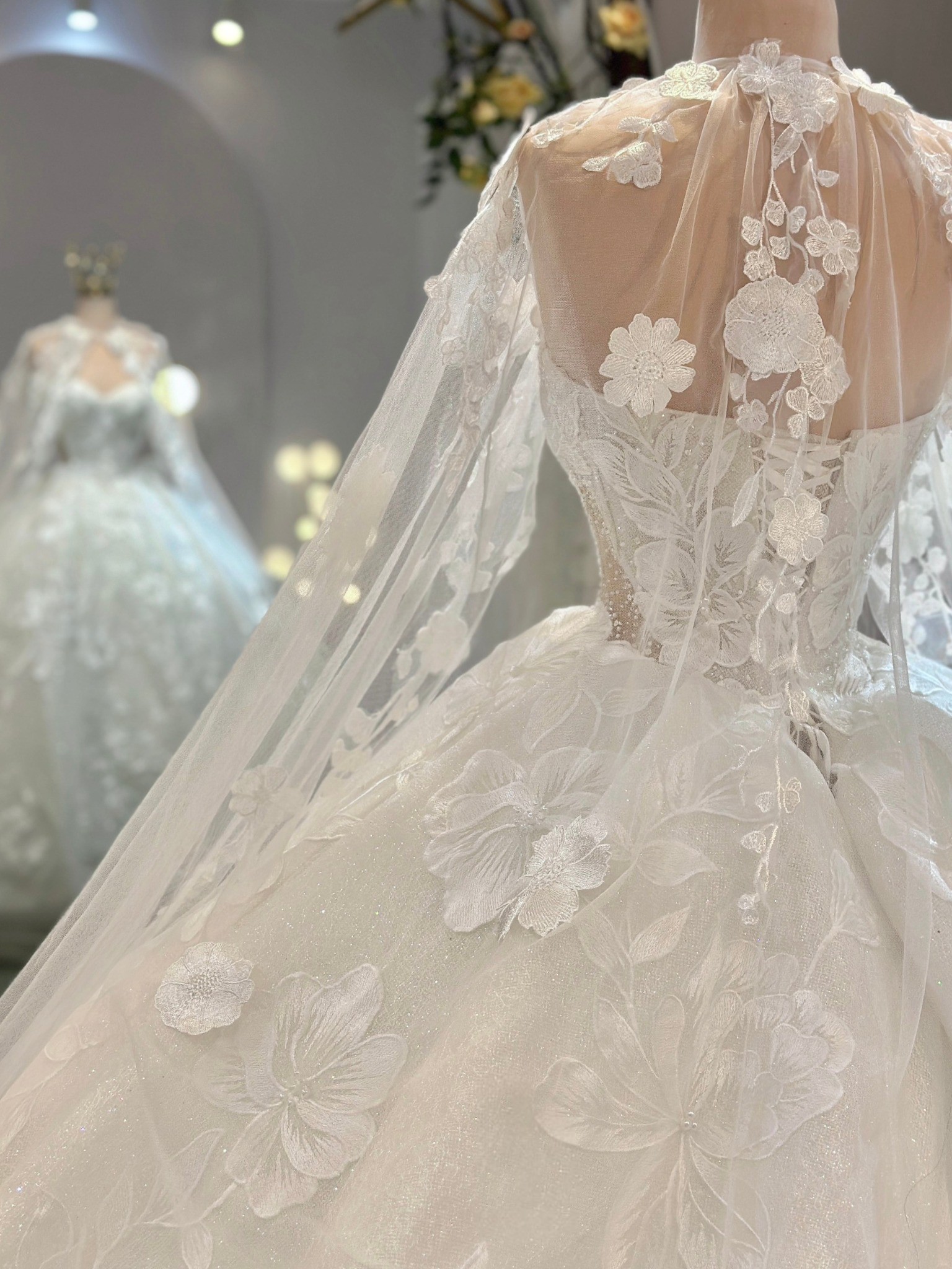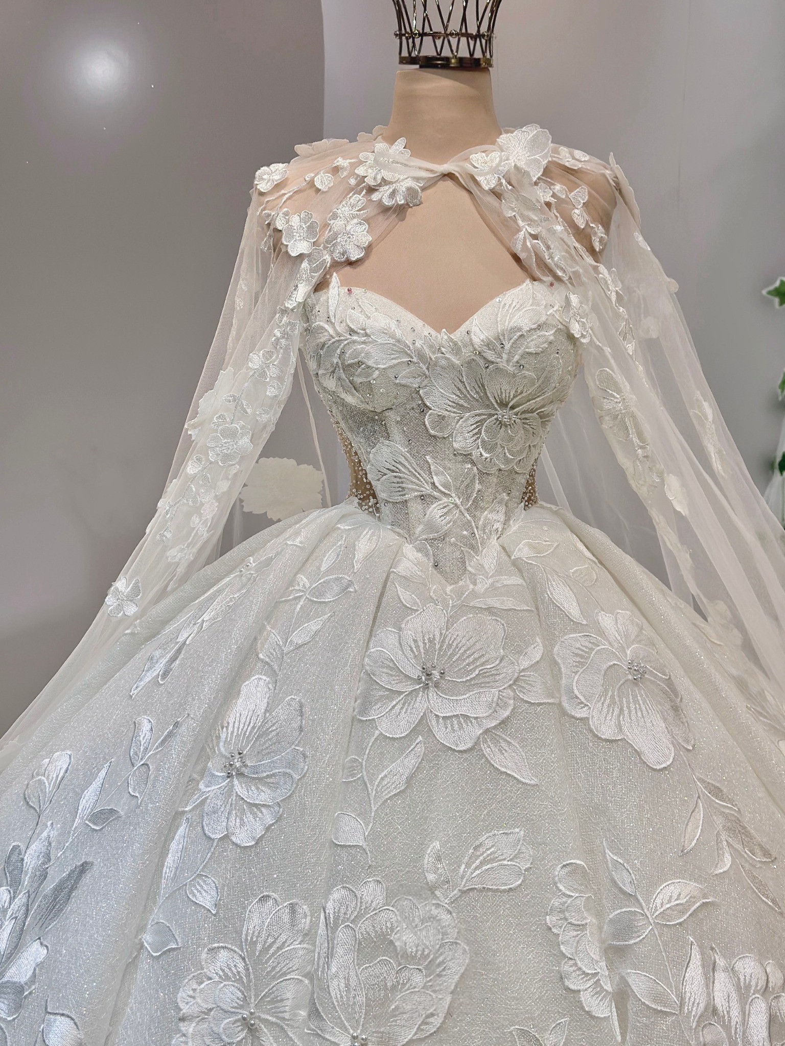 As you glide down the aisle, the floor-length design flows gracefully, adorned with exquisite 3D flowers, delicate beading, and shimmering crystals. Each intricate detail is thoughtfully placed, catching the light during every moment of your special day. The sequins add a touch of sparkle, ensuring you glimmer with joy as you celebrate the beginning of your new journey.