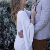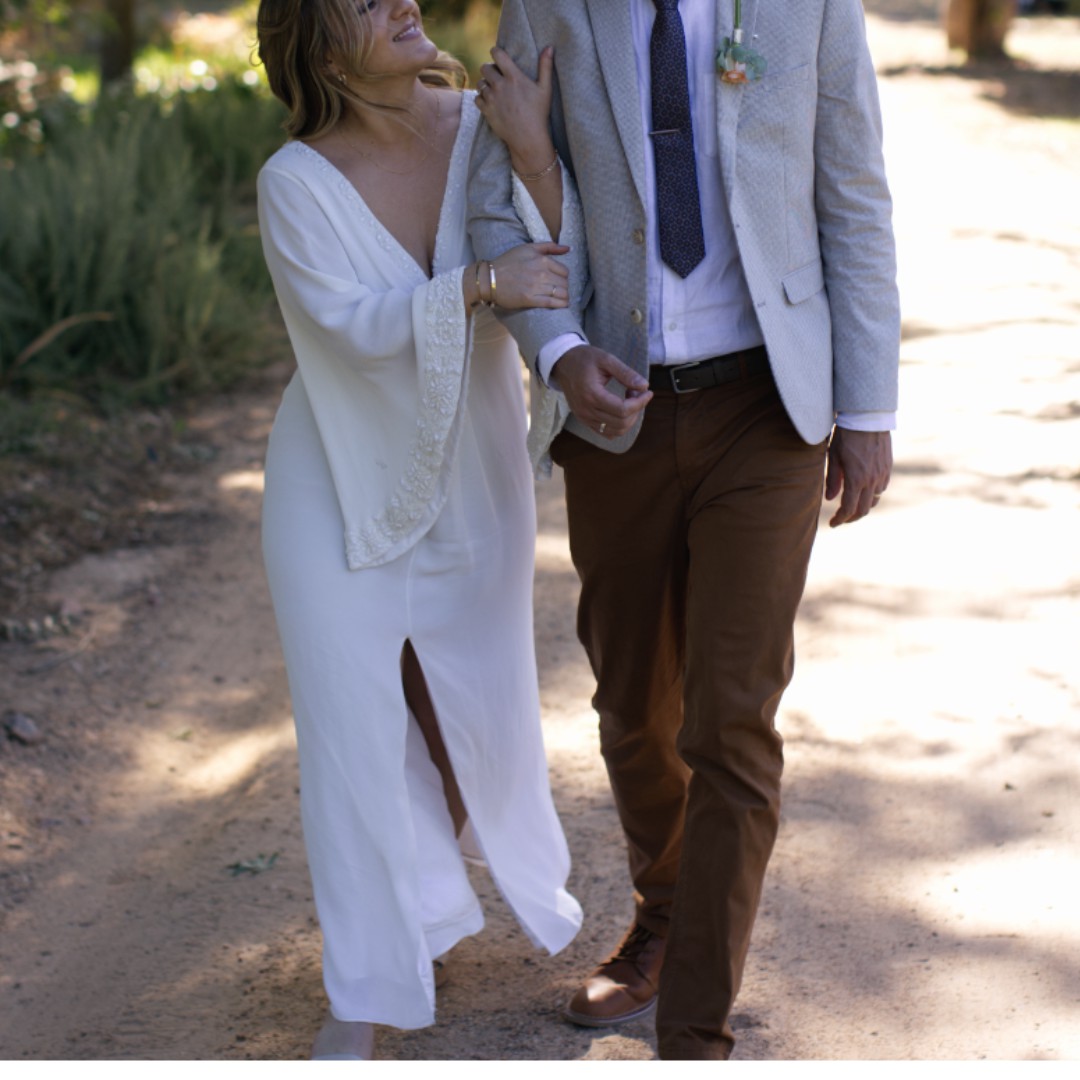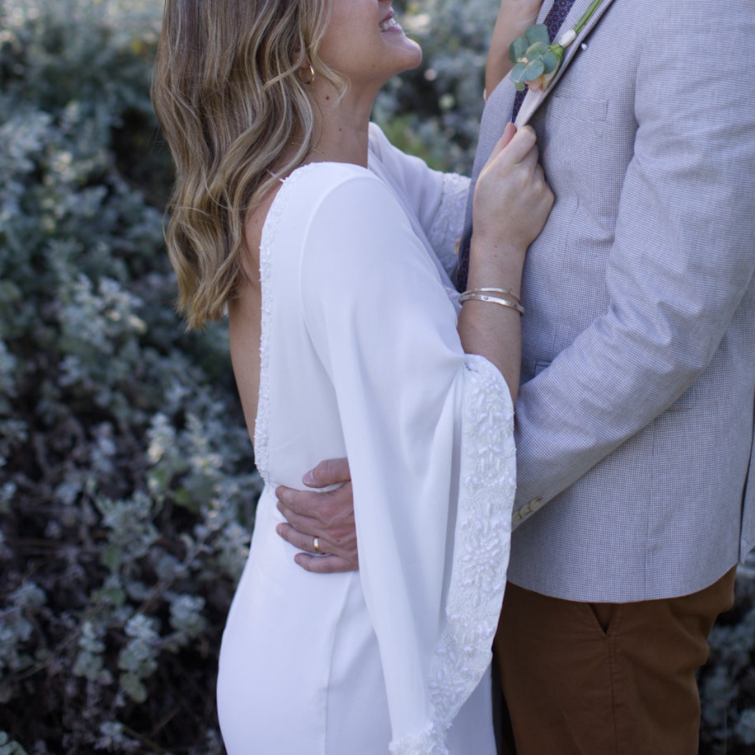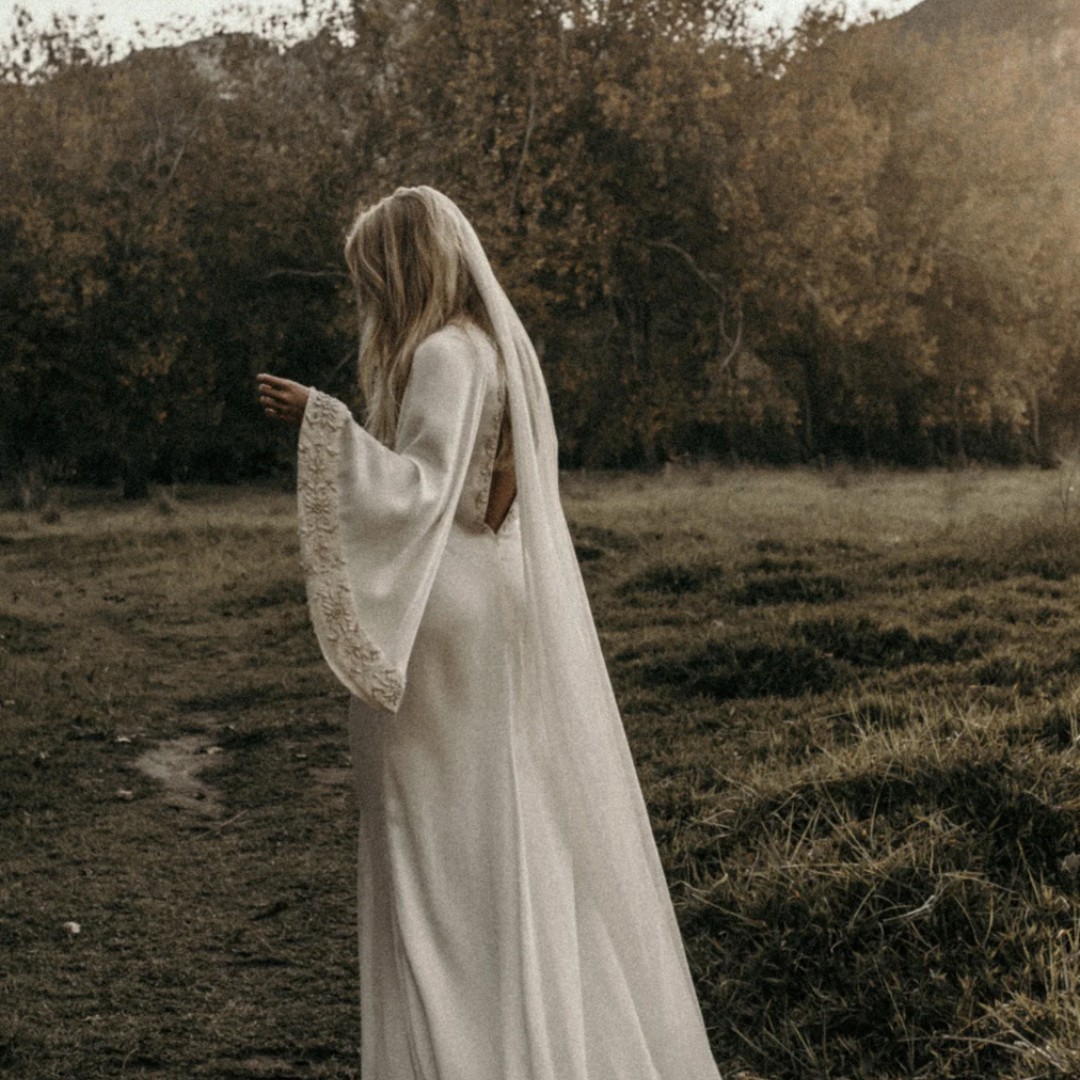 The Hudson Gown is divinely bohemian. Grafted from the softest georgette, the elegantly draped twist knots at the waist and falls open in a thigh-high split at the skirt. The plunging V-neck and striking trumpet sleeves are edged with a hand-beaded floral border rendered in semi-precious stones, faceted crystals and glass beads in shades of ivory and pale silver. The skirt fans out to form a regal train and is fastened at the centre back with an invisible zip. Two fine rouleau ties finished with handmade petals secure the open back.