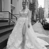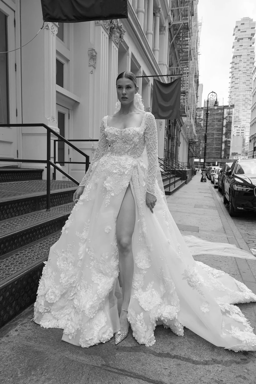 Breathtaking and ethereal, this custom Pallas Couture Rivetta gown is the ultimate blend of modern structure and romantic detail. Featuring the signature Pallas sheer boned corset, the dress is adorned with intricate 3D floral appliqués, delicate beadwork, and hand-placed pearls.