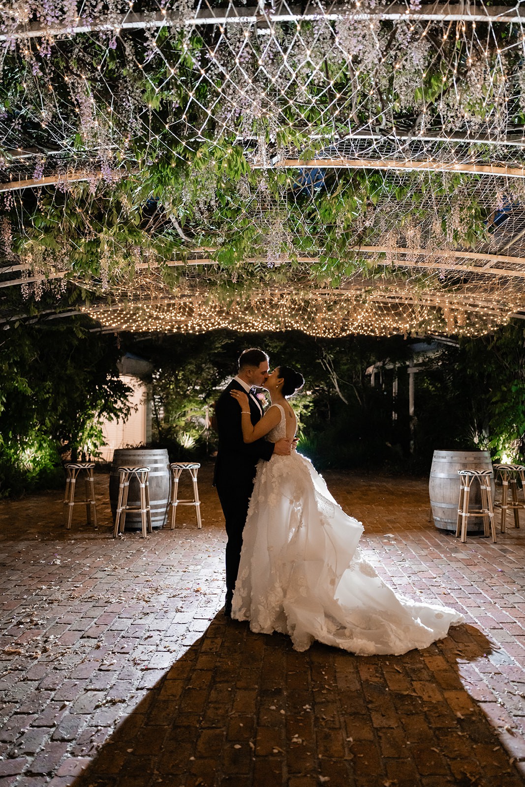 Five-Ribbon Bustle: A custom bustle featuring 5 reinforced ribbons was added underneath the skirt, allowing the 3m train to be pinned up elegantly for dancing.