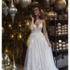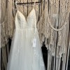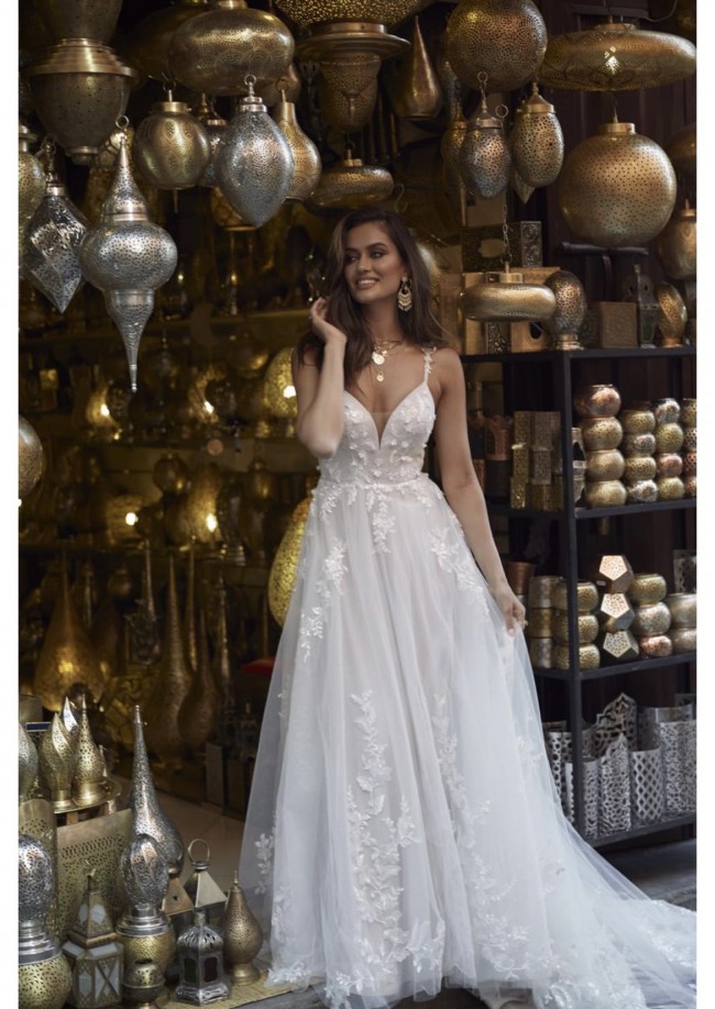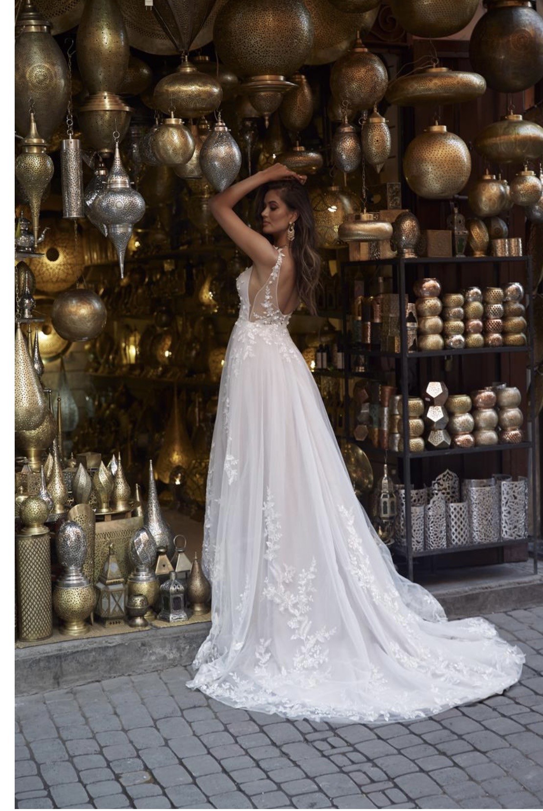This enchanting Aria wedding dress by designer Madi Lane is a stunning embodiment of romance and elegance. Crafted from exquisite lace, this floor-length A-line silhouette effortlessly blends classic charm with modern flair, making it the perfect choice for the bride who dreams of a fairy-tale wedding.