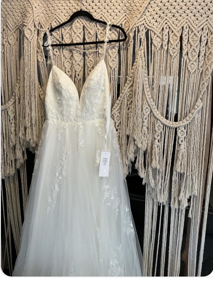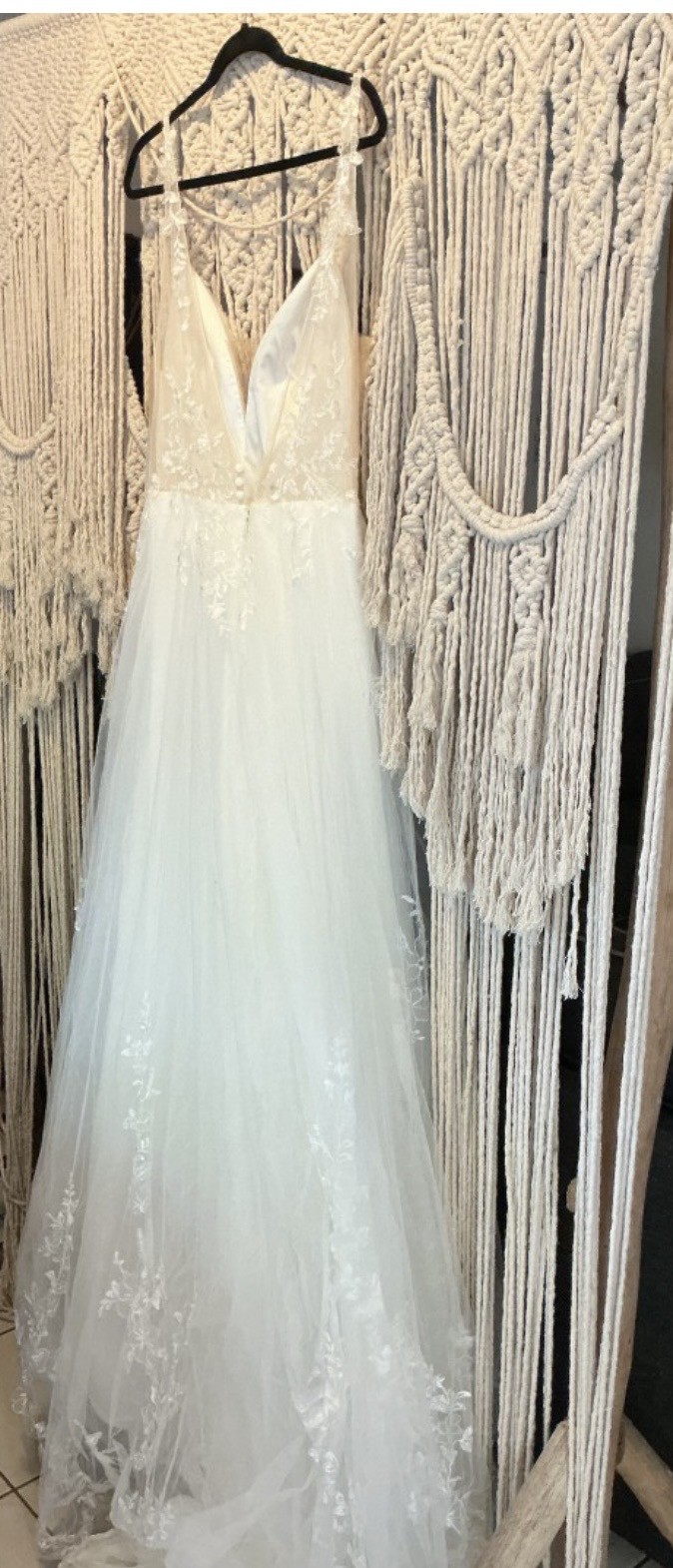In a pure white hue, this dress embodies purity and grace, allowing you to shine as the centerpiece of your celebration. Whether exchanging vows in a grand cathedral or a charming garden, the Aria dress promises to make your wedding dreams come true, enveloping you in a timeless elegance that will leave every guest in awe. Please note one button hole elastic needs repair