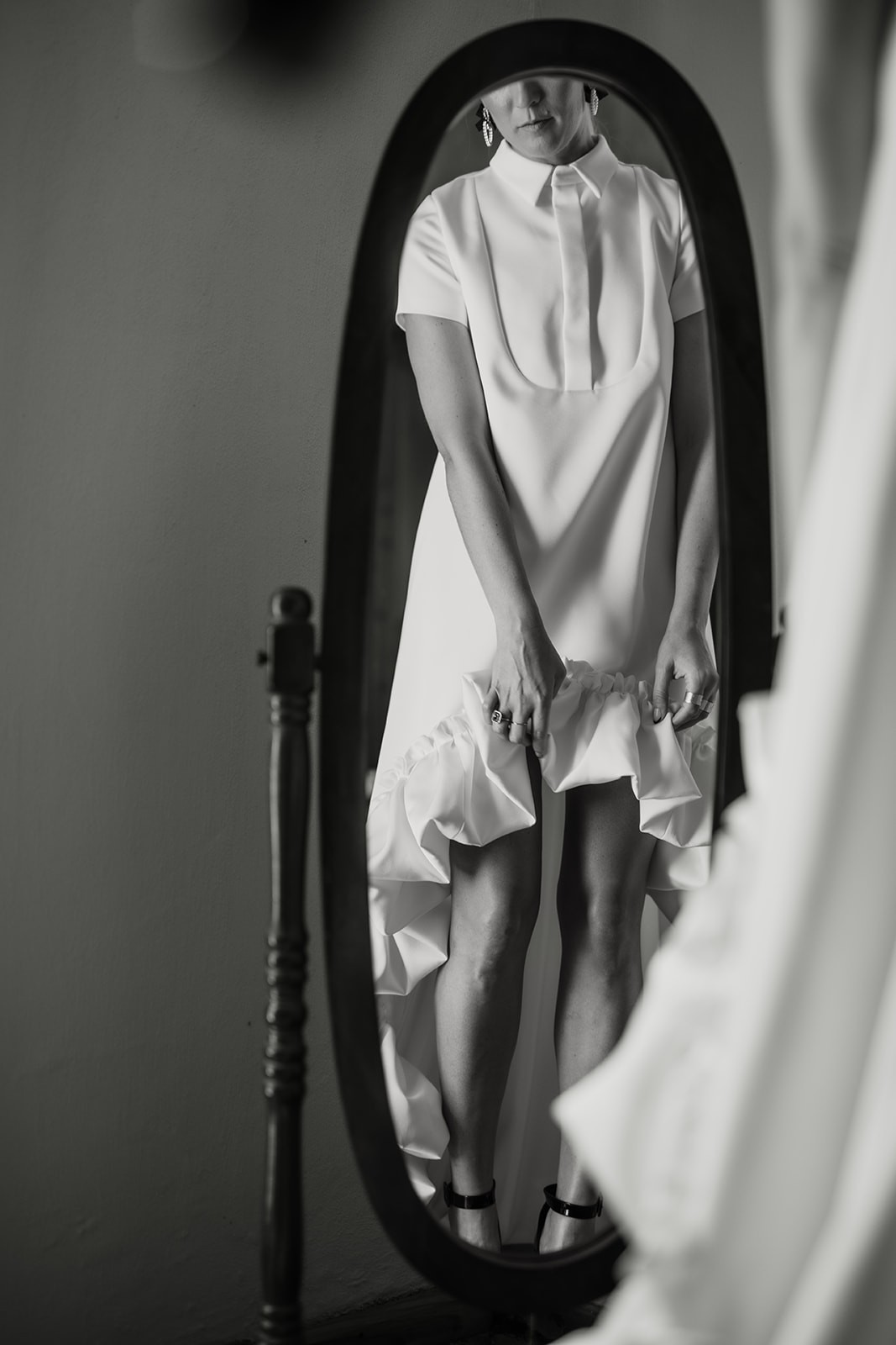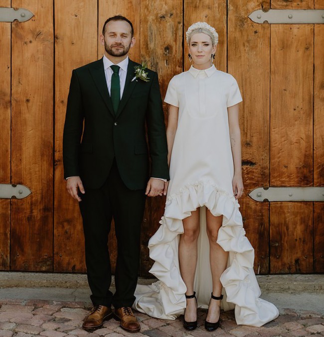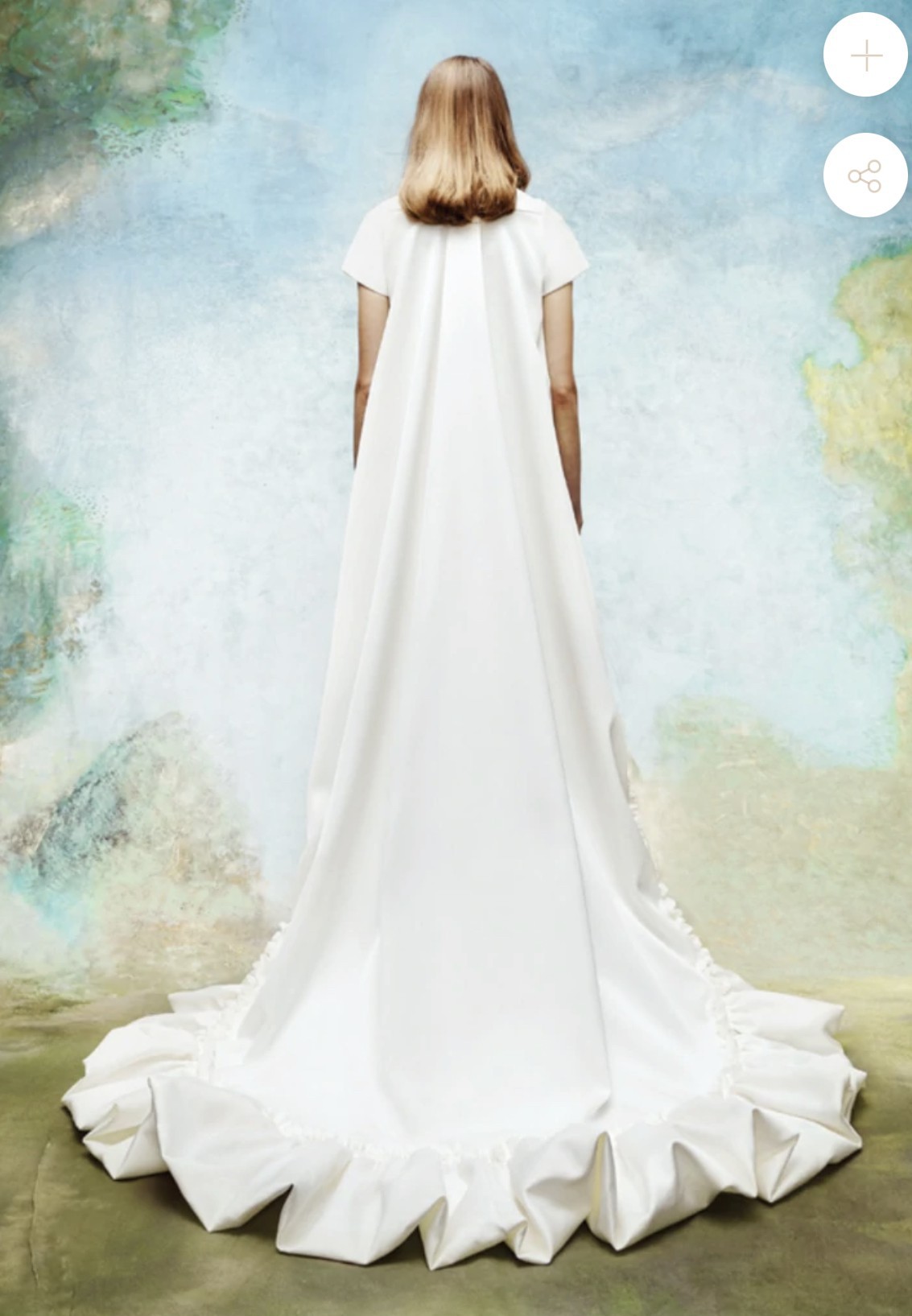 A truly unique and fashion-forward bridal piece from the Viktor & Rolf Bridal Fall 2020 runway collection, as featured in Vogue Runway. This striking mini high-low design perfectly captures the house’s signature sculptural aesthetic, blending playful proportions with couture craftsmanship. The silhouette is modern and editorial, with a shorter front hem that elongates the legs and a dramatic longer back for added impact and movement. Crafted in structured ivory crepe with architectural volume, the fabric holds its shape beautifully while still feeling refined and luxurious. It’s the ultimate statement dress for a bride who wants something directional, chic and unforgettabl. Ideal for a contemporary ceremony, reception change, or stylish city wedding.