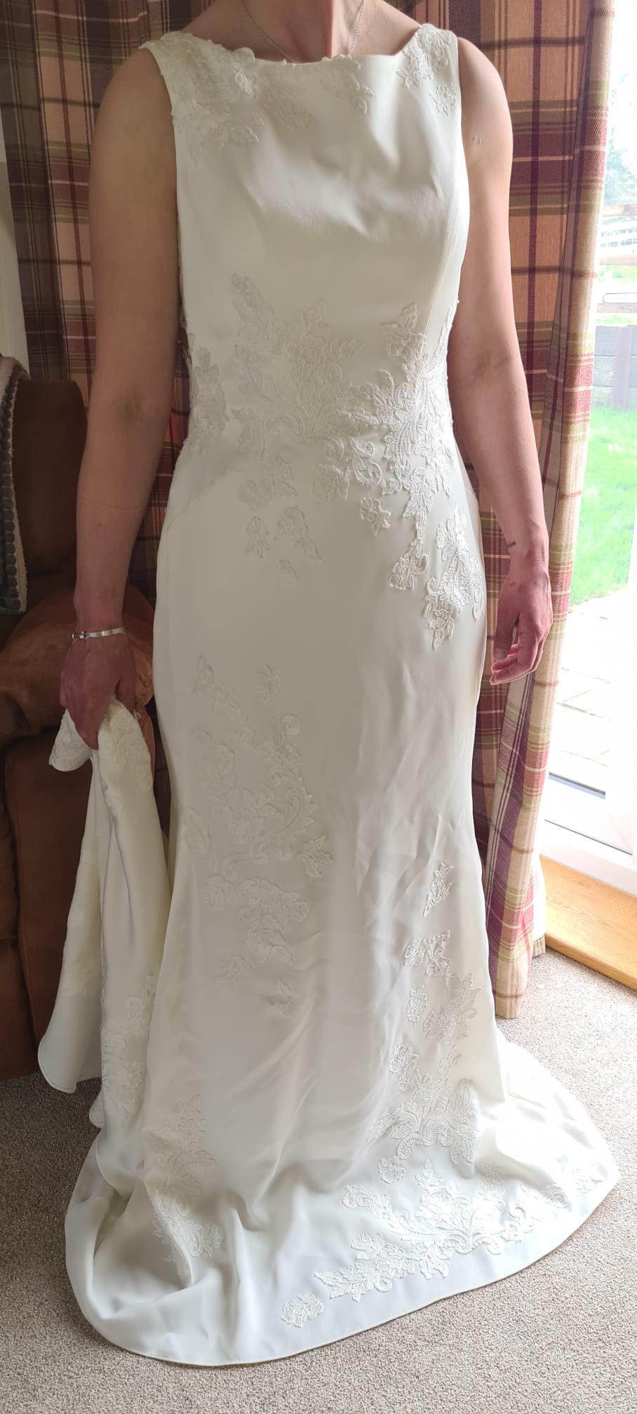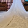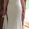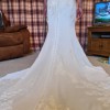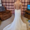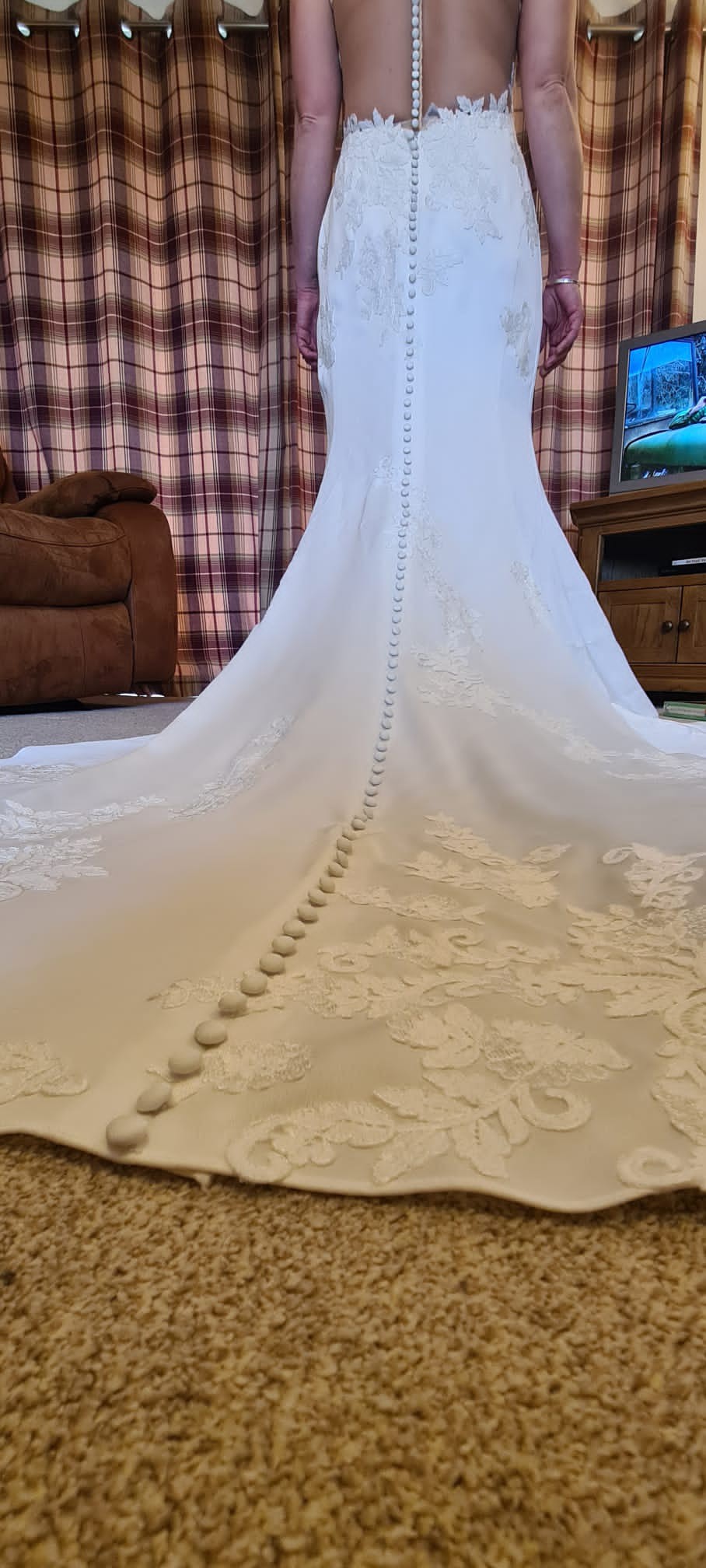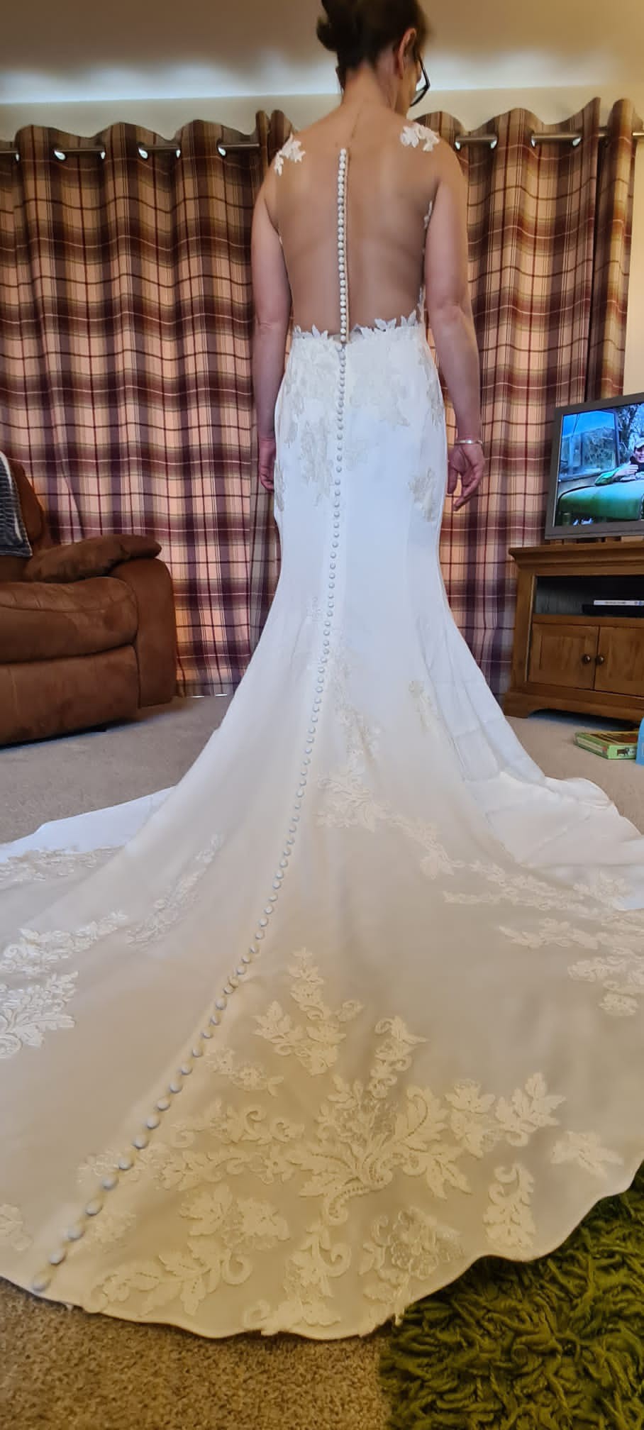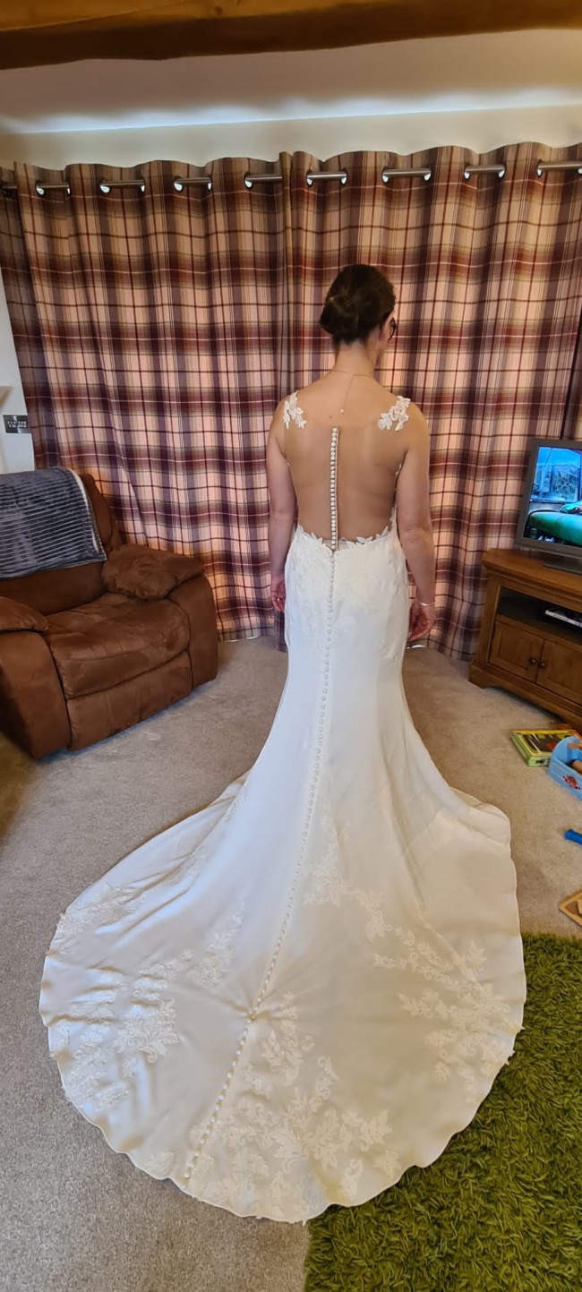 Beautiful Ivory, fitted dress that flares at the bottom. Has a clear, low back with bead buttons and the underlay is silk which makes the dress fall perfectly!