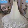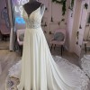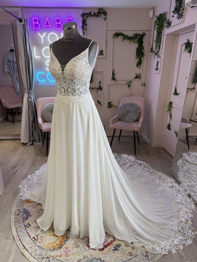This soft chiffon gown features an A-line silhouette with a lace and tulle illusion bodice. The neckline is a soft plunge with delicate beadwork on the spaghetti straps and detachable lace off-shoulder pieces. The gown also features a full length statement train with lace illusion detail to compliment the bodice