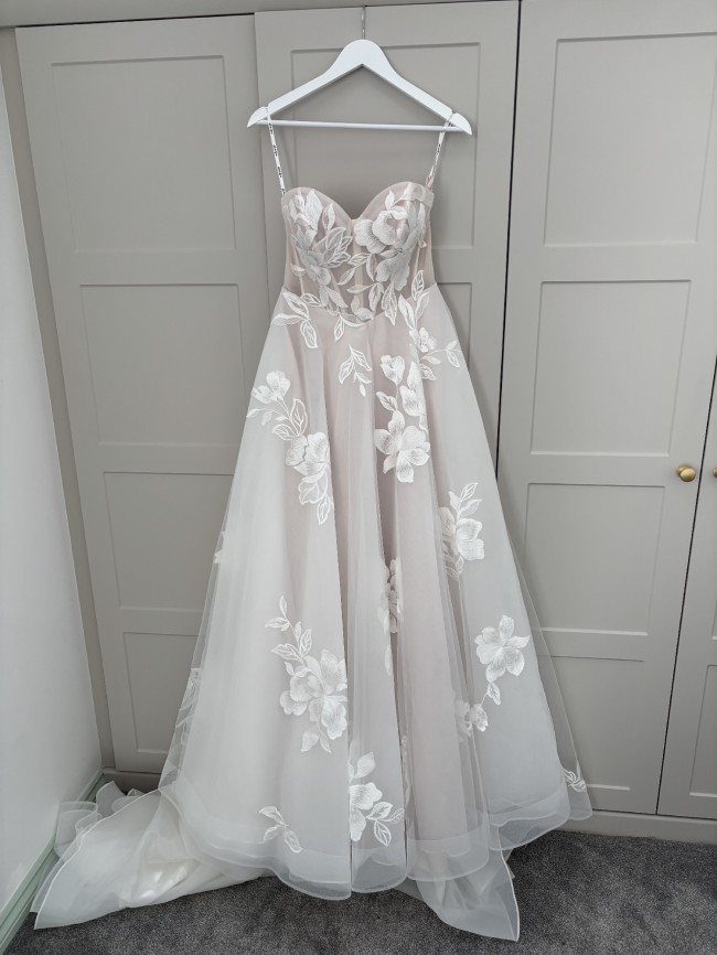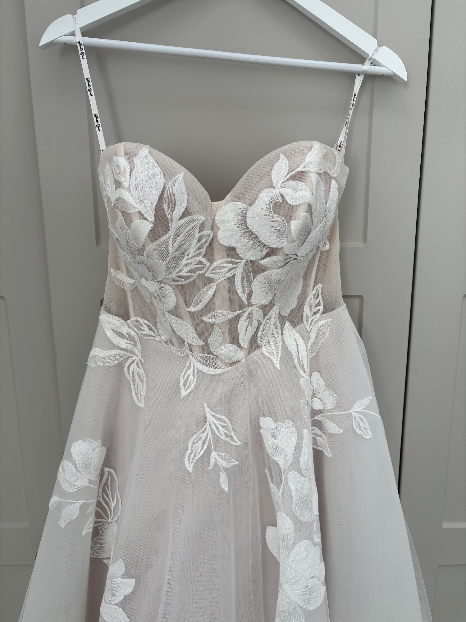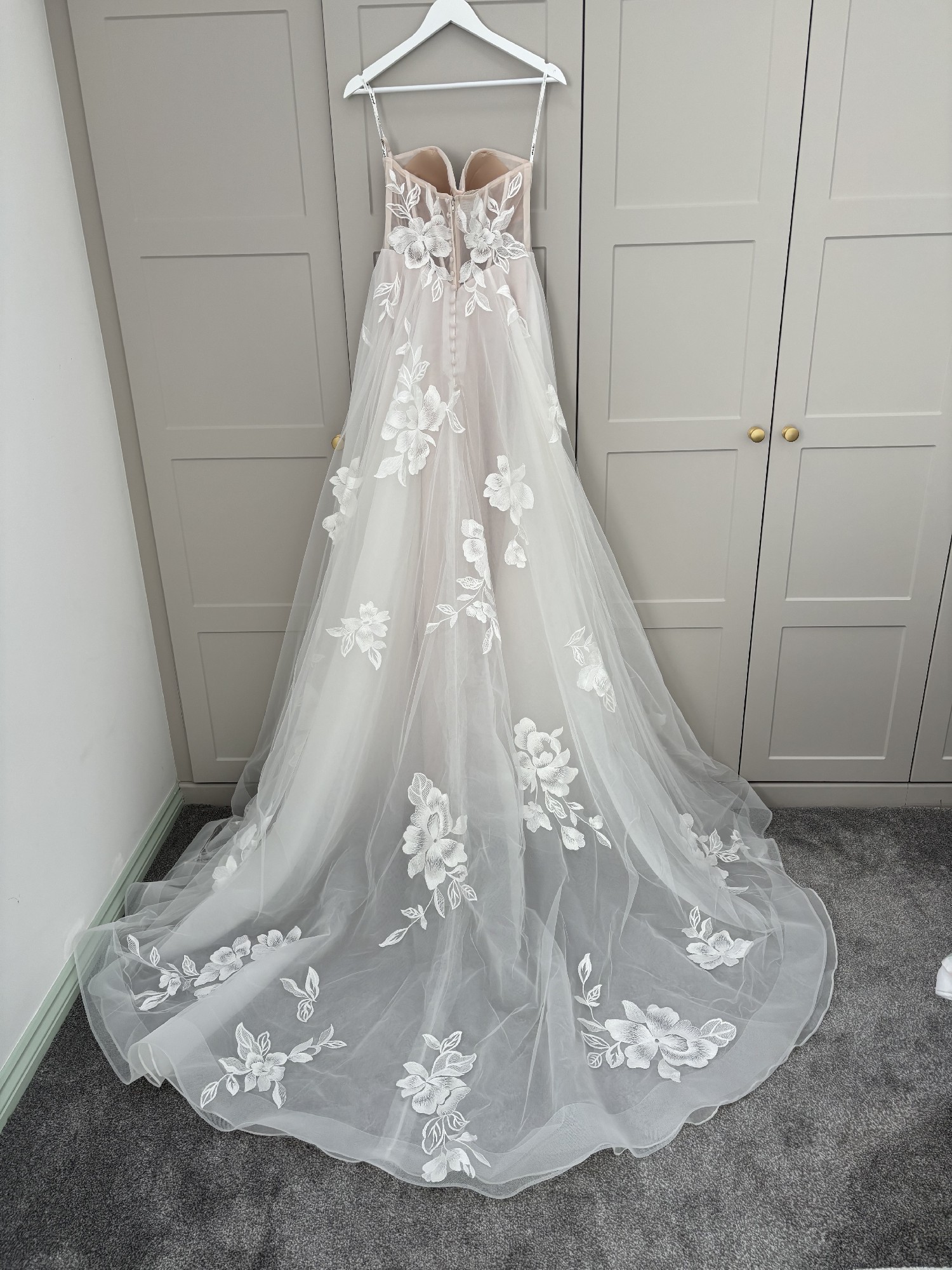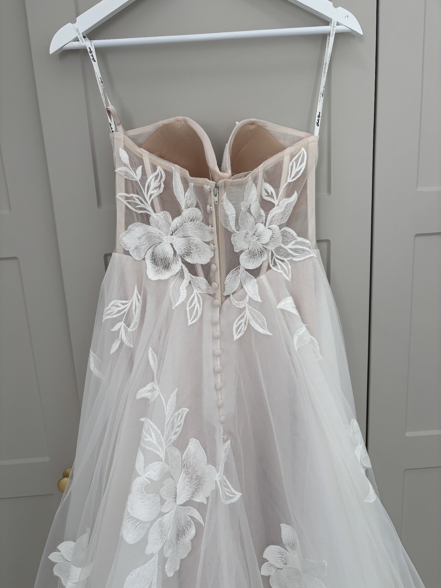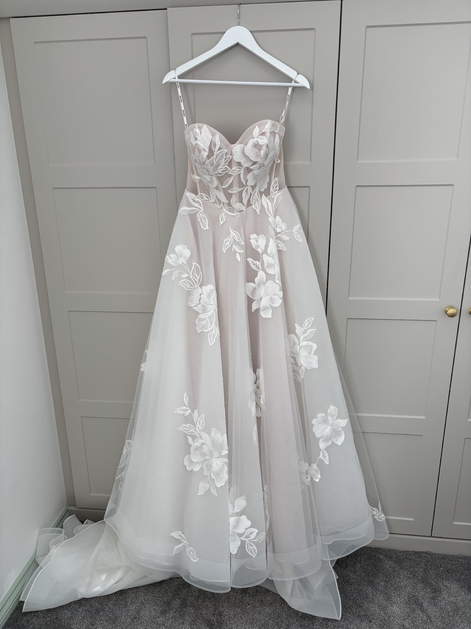 Brand New Stella York dress with tags. Unfortunately, I was unable to use so still has tags on, only worn to try on. Beautiful floral embroidery design with sheer back/bodice. Underskirt in colour Biscotti.