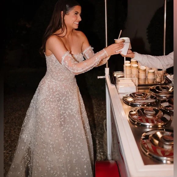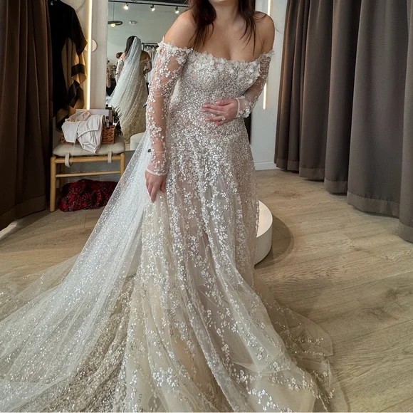 This Milla Nova Coco gown is utterly stunning. It’s nude in color with 3D flowers, sequins and beads throughout. The bottom can be worn to be a bit sheer to show legs or with a nude slip underneath (will be included). Back of dress has corseting, making it ultra convenient when it comes to shifting sizes. Less need for alterations! This dress fit me perfectly at both a size 8 and size 4.