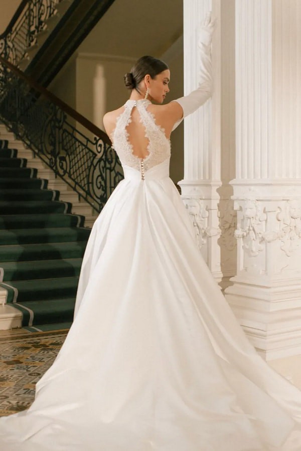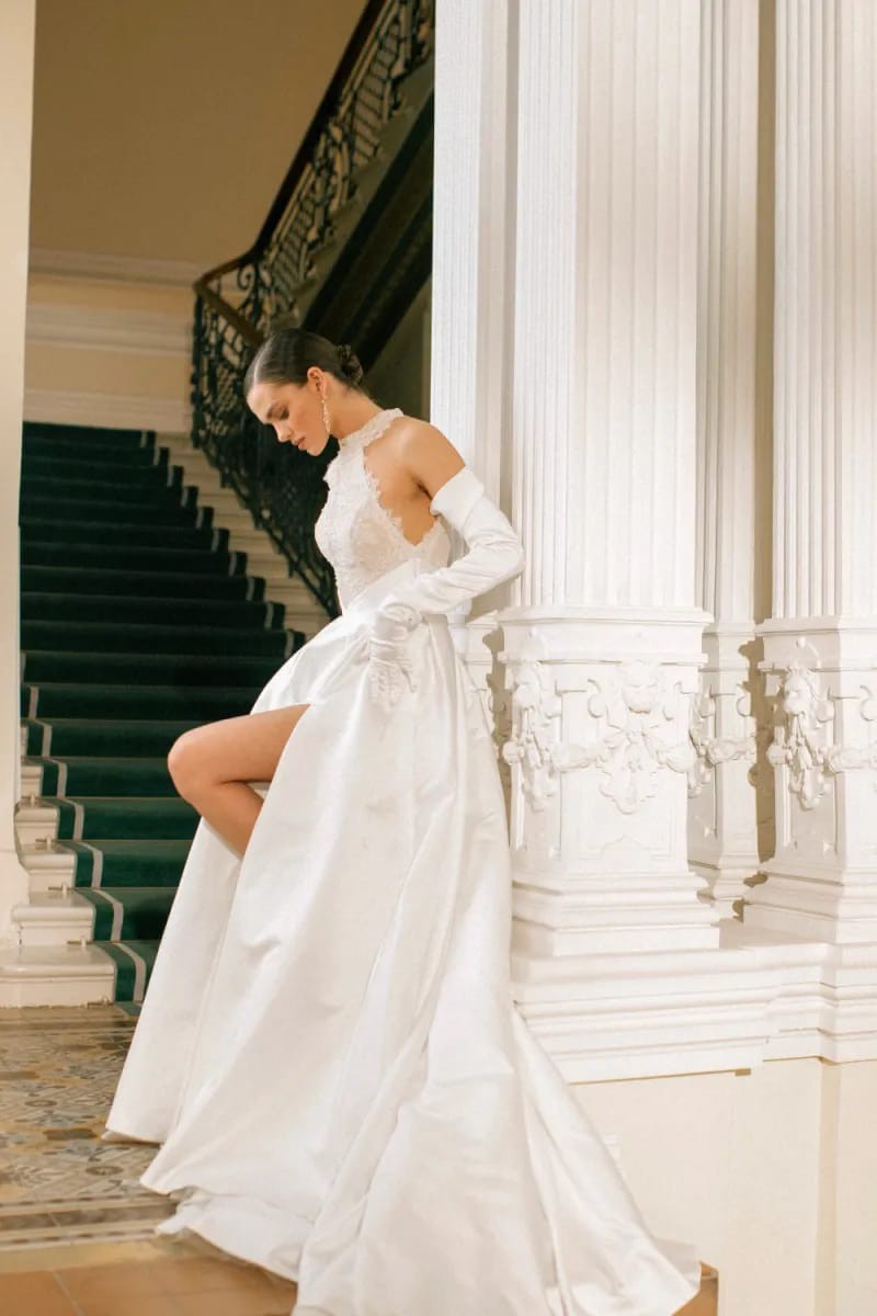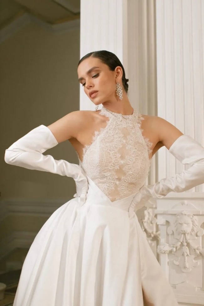 Rara Avis Evin dress sample in a new condition in Ivory skirt and nude colour bodice with ivory lace. Detachable matching long gloves included. No alterations done.