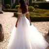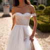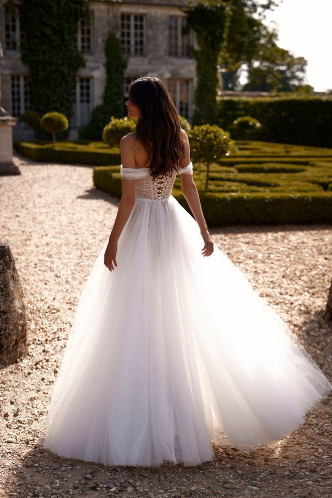 Princessy tulle A-line wedding gown with a draped corset, off-the-shoulder tulle sleeves, embellished with the sequins tender waist belt, and lace-up closure on the back.