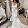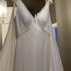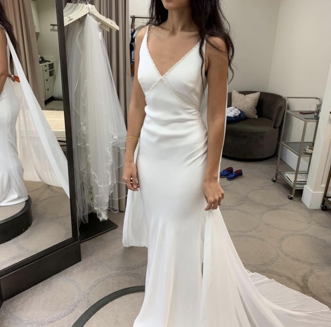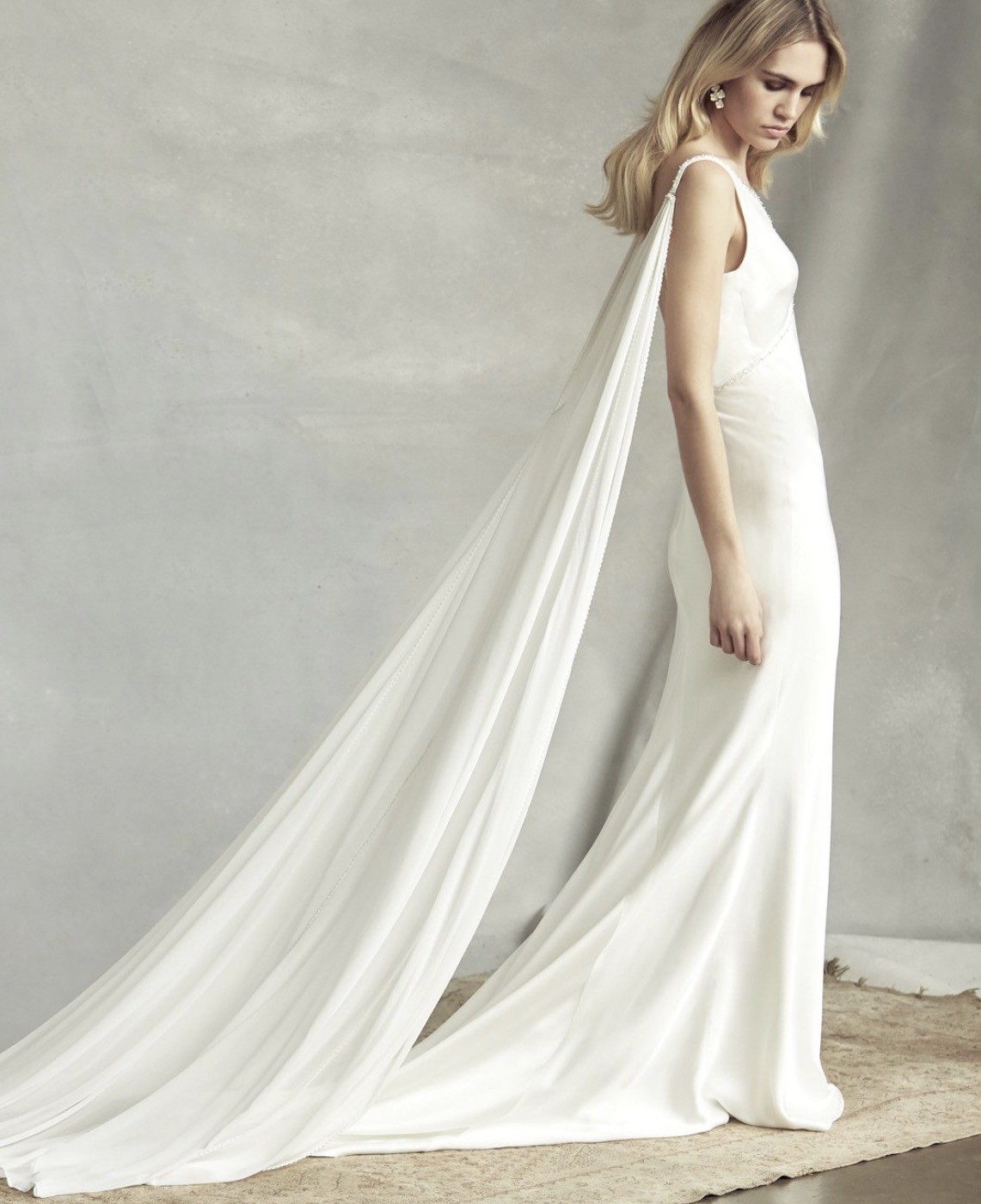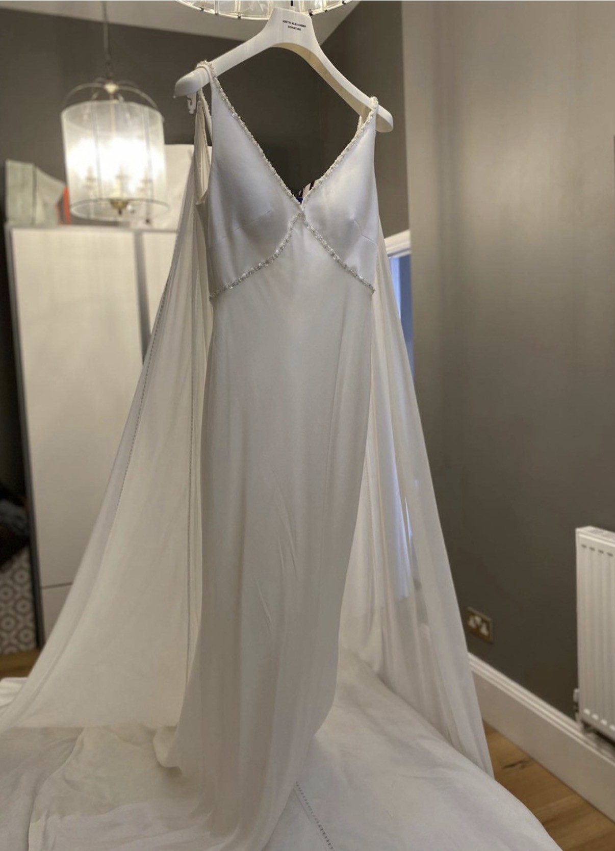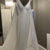 This dress is brand new, unaltered, without flaws. Never been worn. Beaded design, understated and elegant. Original tags and a beautiful cape included.