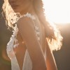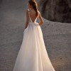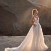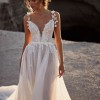 Dreamy wedding gown on straps adorned with volumetric flowers. The gown is lavishly stern with glitter and 3D flowers. Features a plunging V-neckline, V-back, and a midi train.