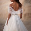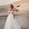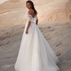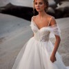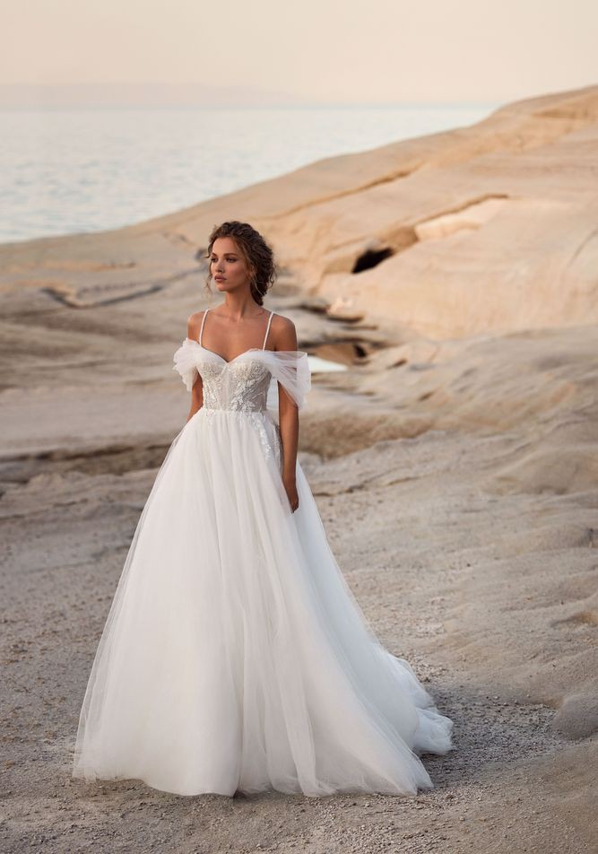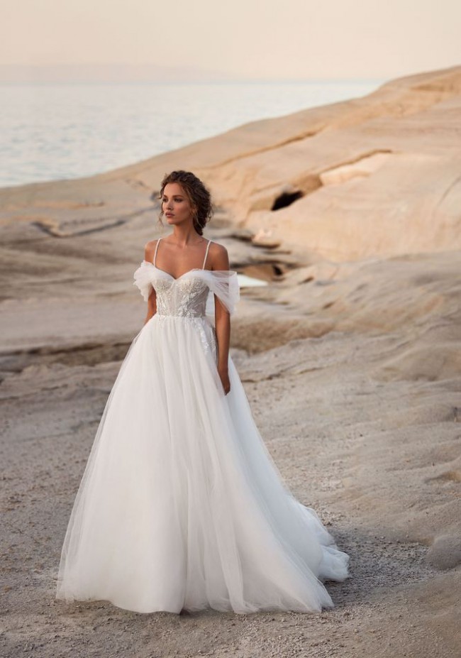 Tender A-line off-the-shoulder tulle gown with a puffy skirt, a midi train, and a sweetheart corset adorned with floral lace applique.