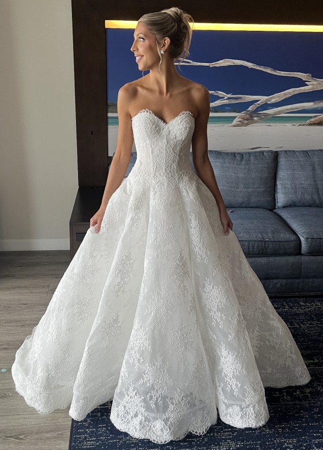 This Alexandria wedding dress by Monique Lhuillier was the gown of my dreams on the most magical day of my life. Crafted with exquisite attention to detail, it features a stunning ballgown silhouette that made me feel like a modern princess as I walked down the aisle. The sweetheart neckline gracefully frames the décolletage, offering a touch of romance, while the low back adds just the right hint of allure.