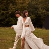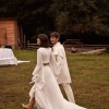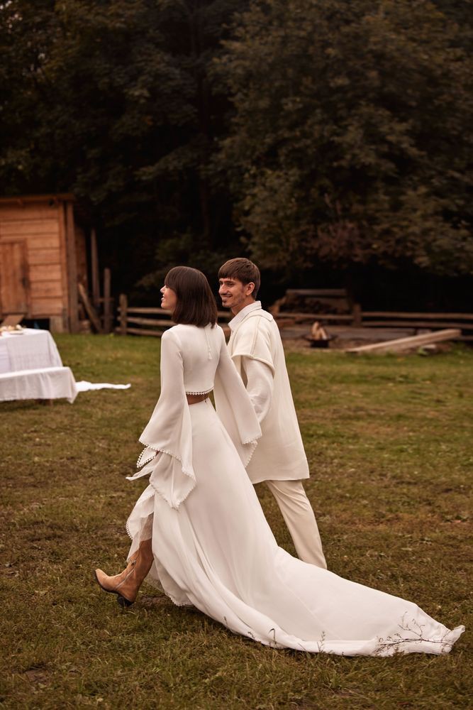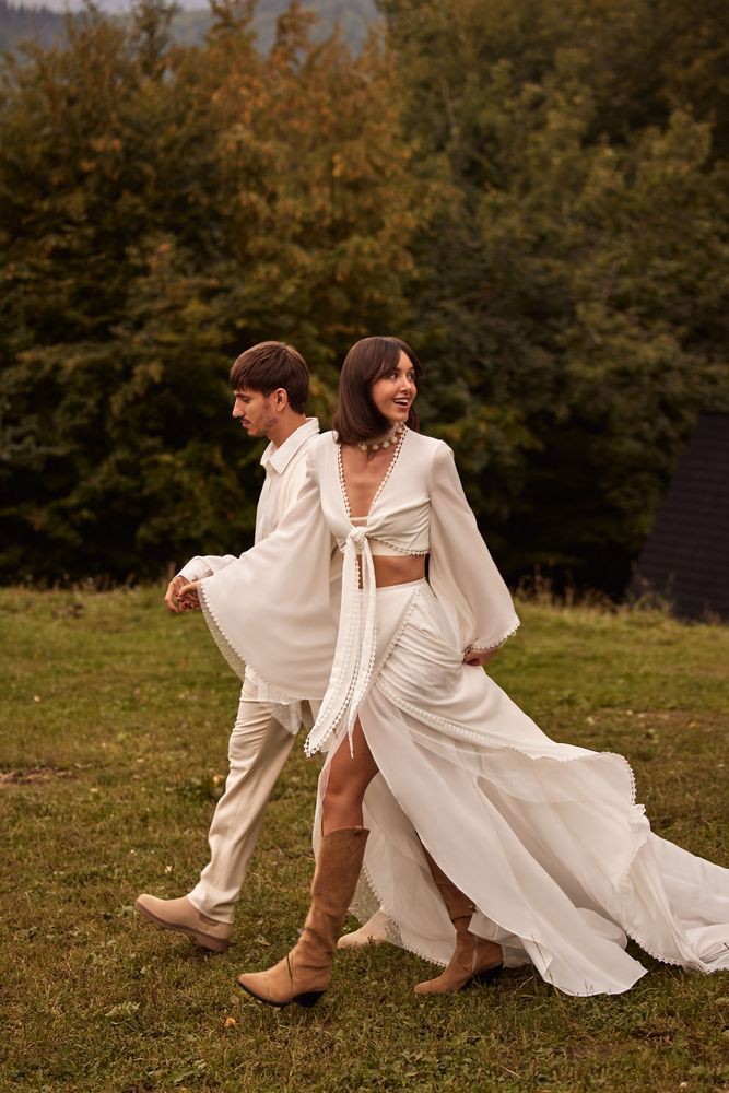Boho-inspired 3-piece combination with an ethereal blouse, a flowy skirt, and a sheer top. The blouse, twisted and tied at the front, boasts delicate embroidery and lush, long wide sleeves. The sheer tulle top is adorned with a polka dot pattern. The maxi fitted skirt is wrapped, showcasing delicate embroidery along the edges and a sheer tulle underskirt with a polka dot pattern.