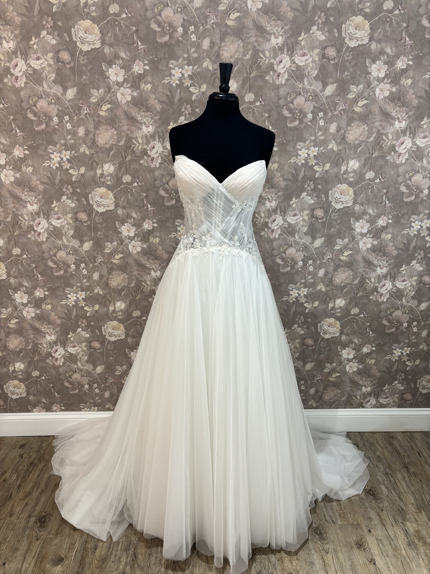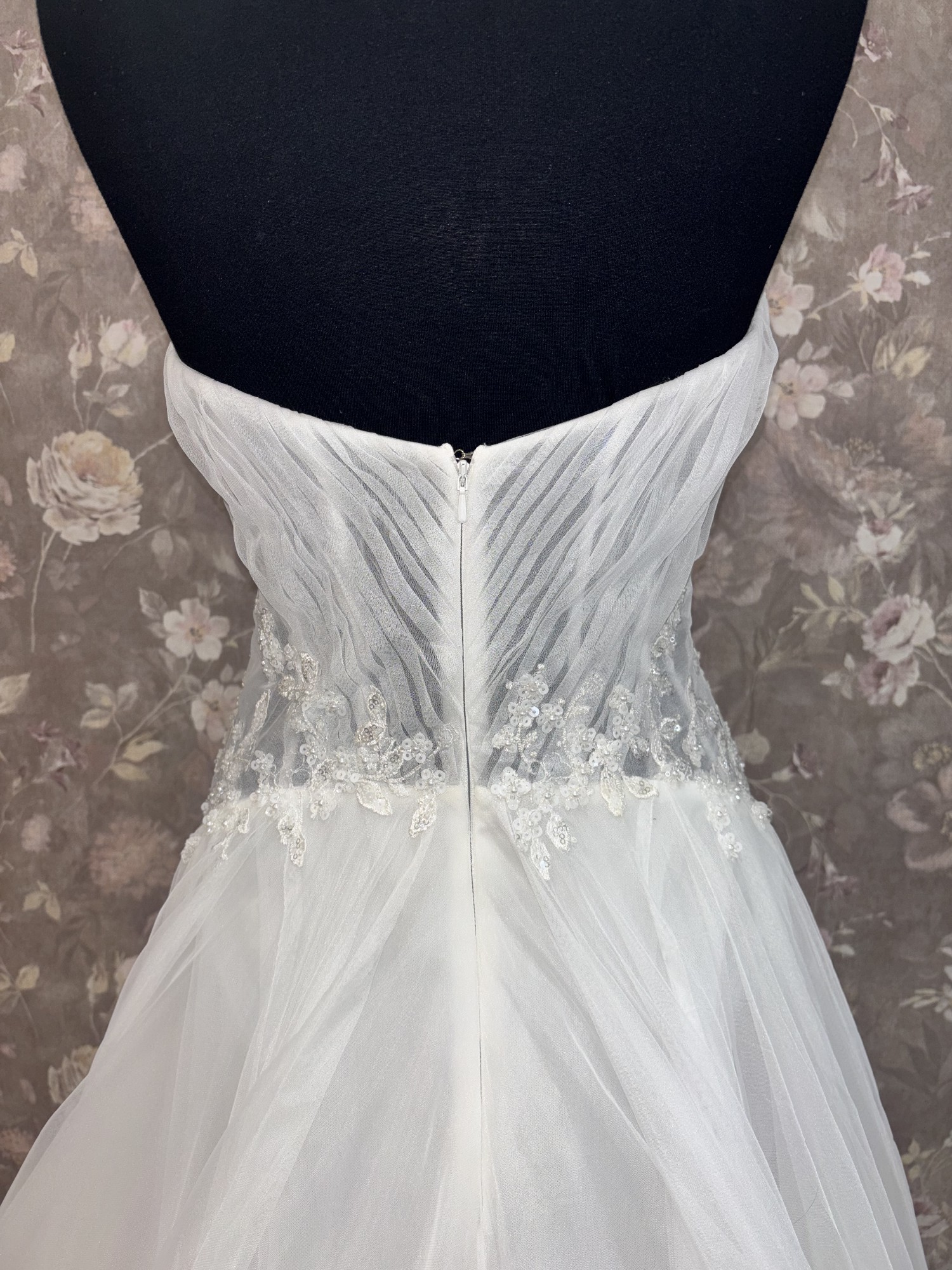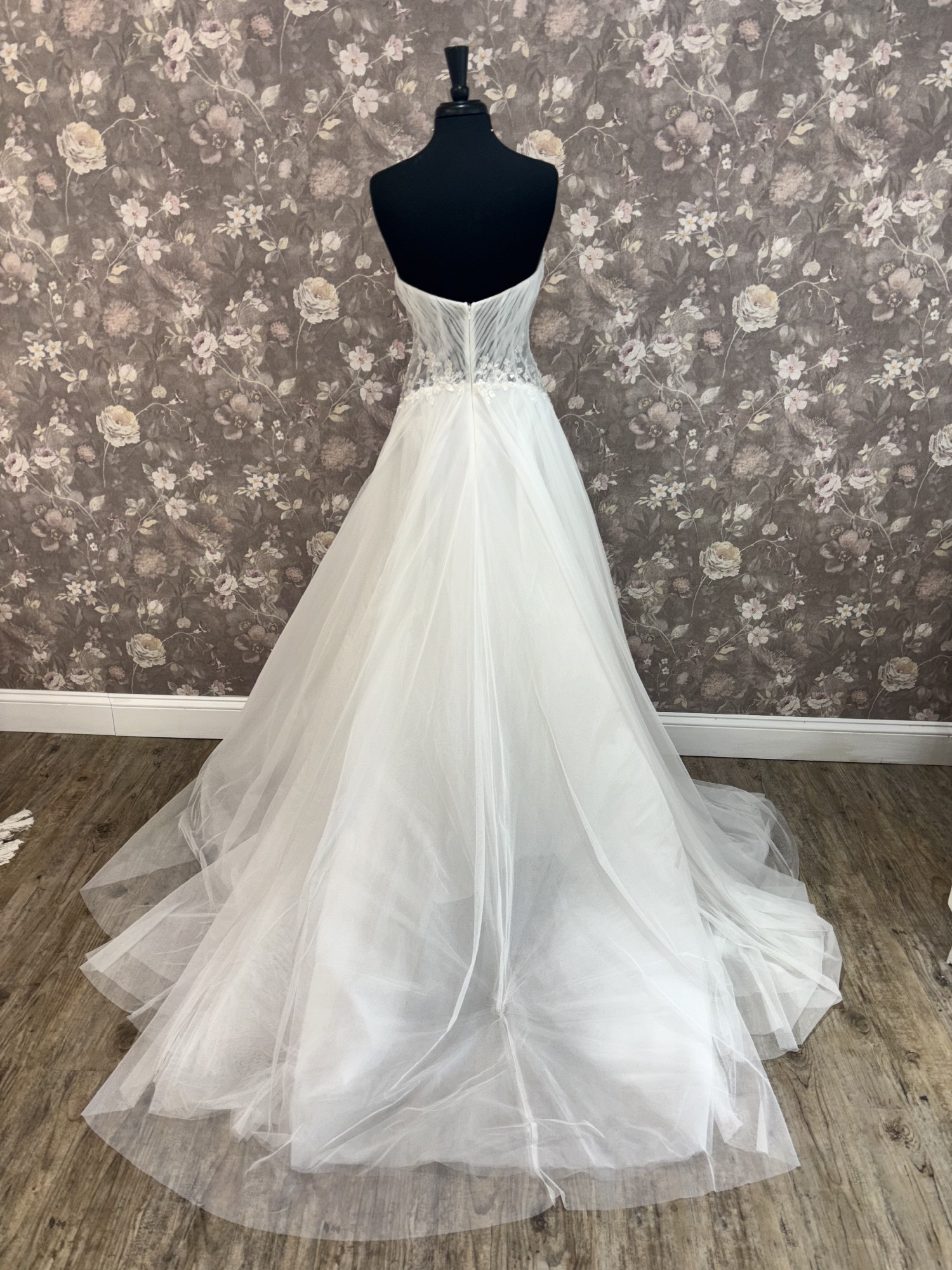 Our gowns have not been worn for a wedding, though they may have been tried on during appointments. While we maintain high standards for our samples, small imperfections—like loose buttons, missing beads, or zipper issues—can happen. These easy-to-fix details with the help of a seamstress mean amazing discounts! Interested in this gown? Chat or email us anytime for more info or extra photos.