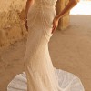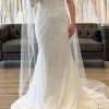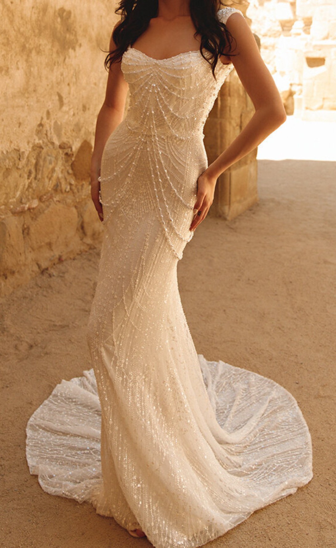 This gown is pure artistry. Intricately hand-beaded from bodice to hem, it features a sculpted mermaid silhouette that contours beautifully before flowing into a soft, dramatic train. The delicate draping pattern in the beadwork creates dimension and movement, catching the light in the most elegant, subtle sparkle.