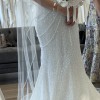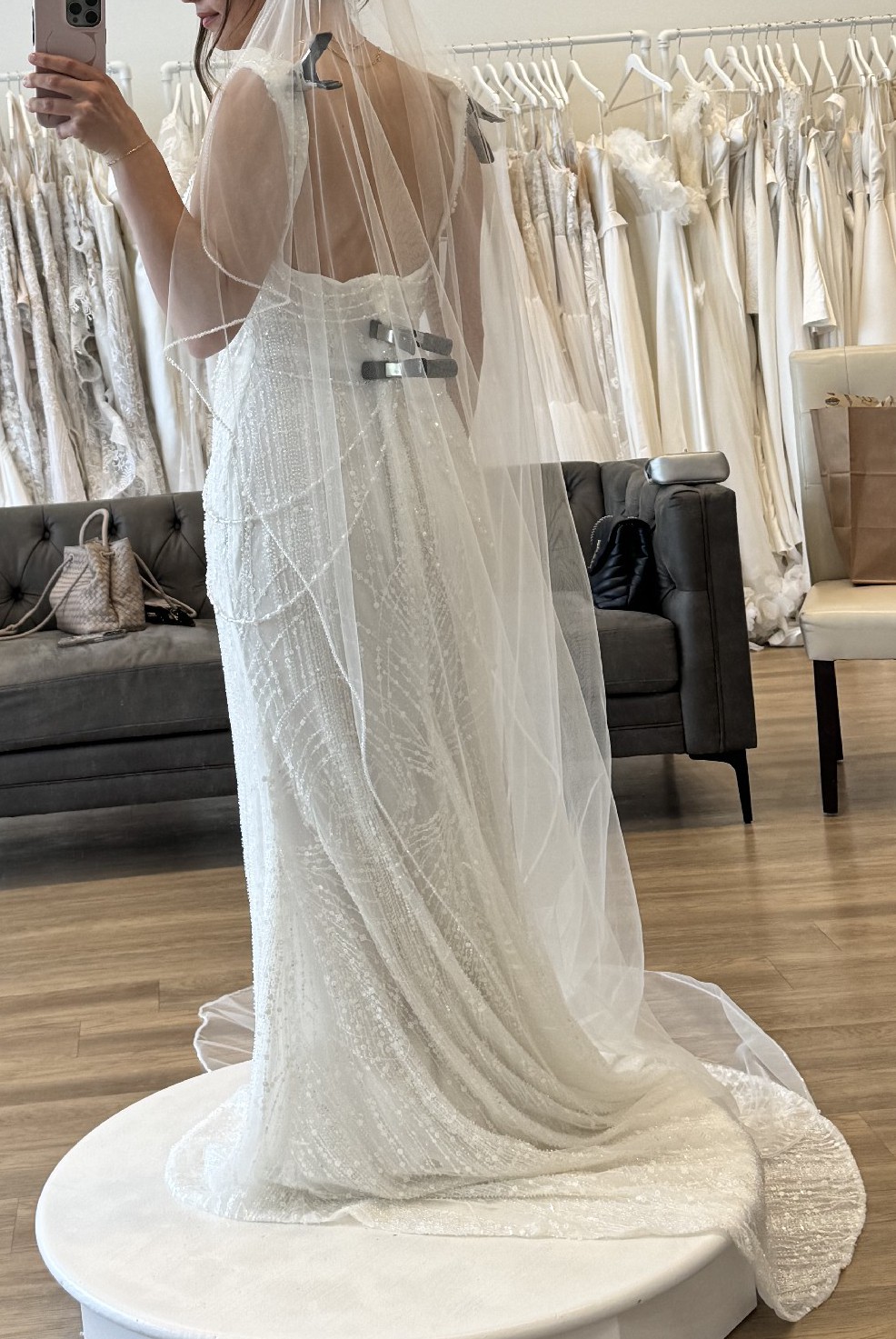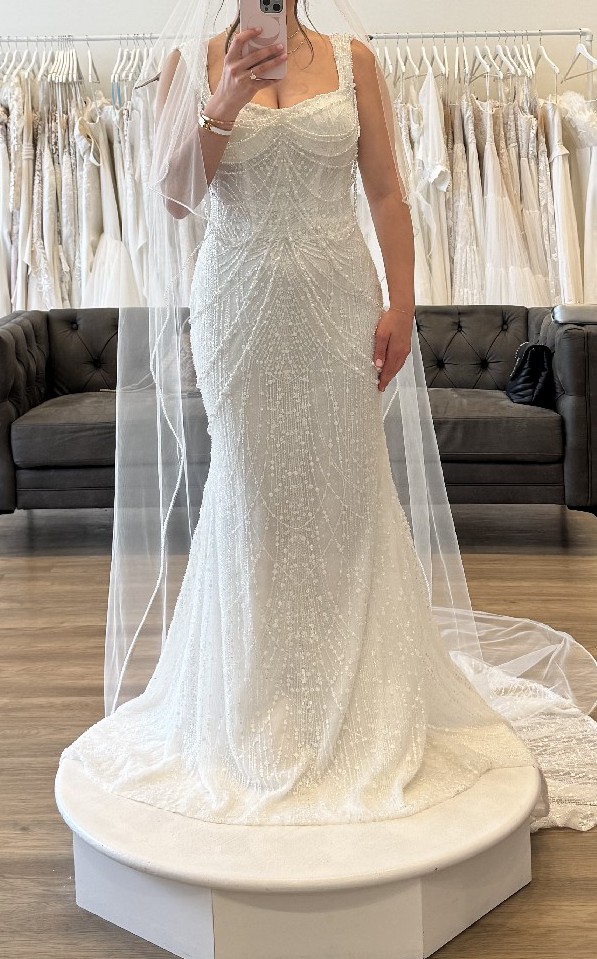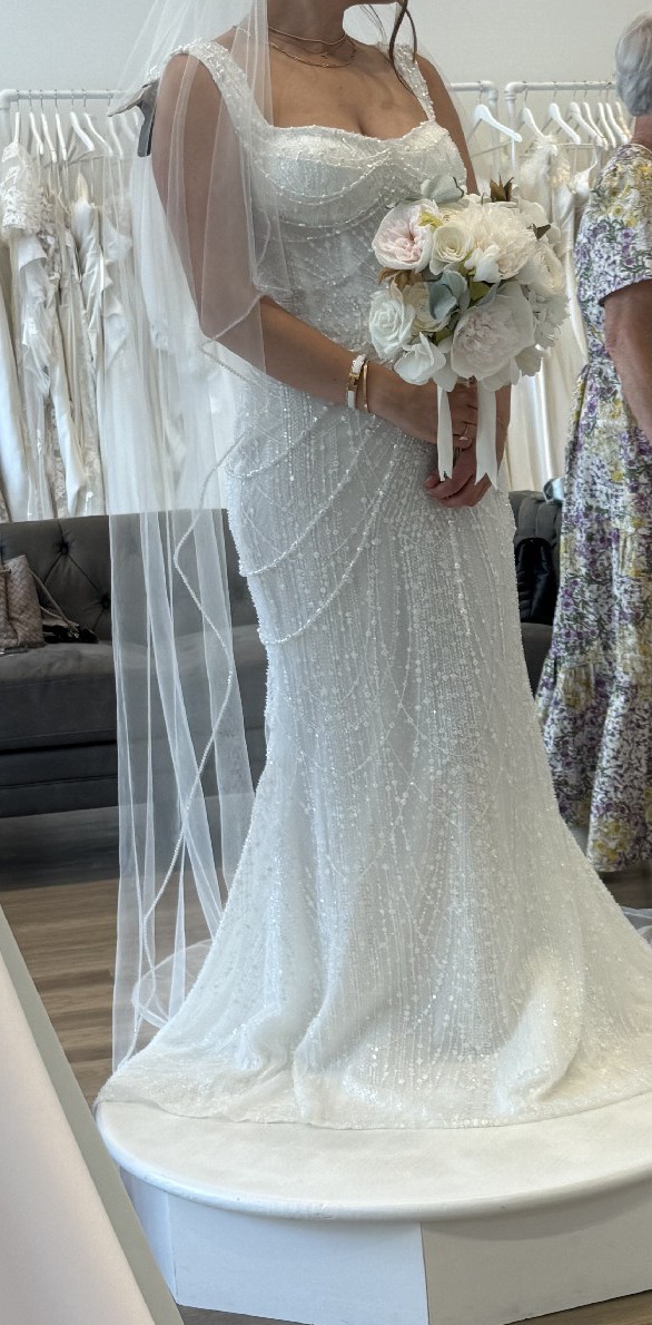 The boutique photos shown are of the sample try-on gown (some minor bead wear visible). The dress you will receive is brand new, custom made to my measurements, and has never been worn or removed from the garment bag. Alterations are still needed. All beadwork is pristine and perfectly intact. It has never been worn for a wedding.