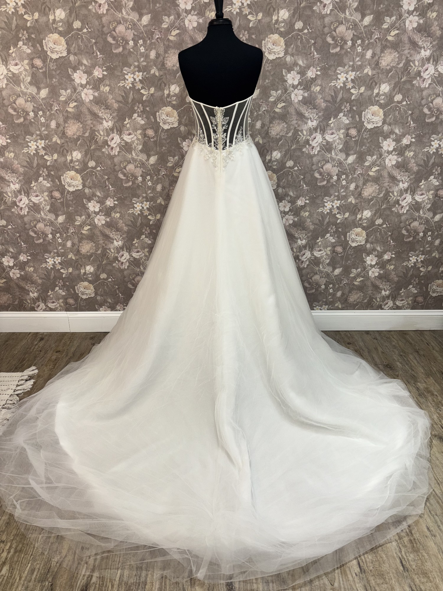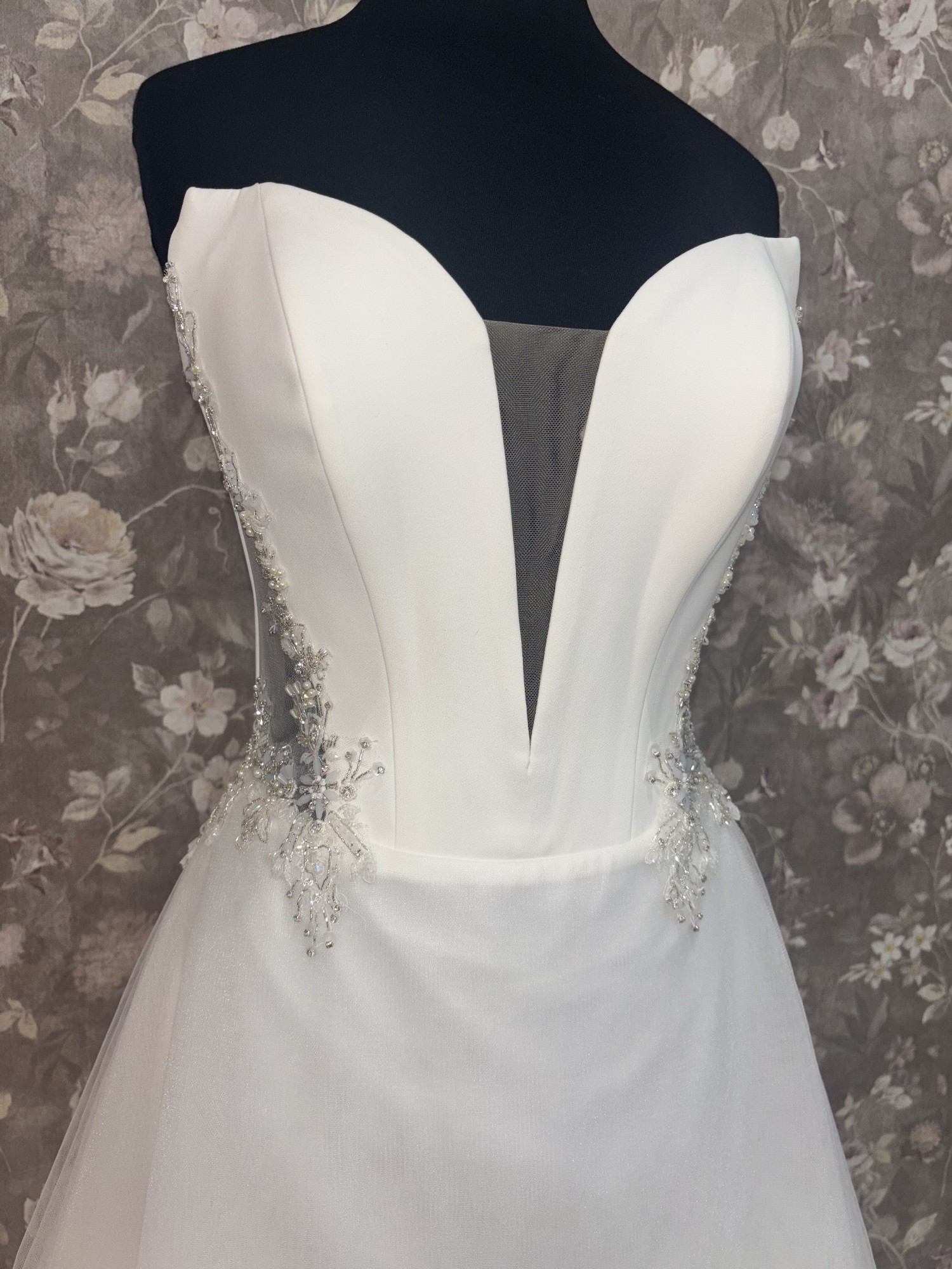 Our gowns have not been worn for a wedding, though they may have been tried on during appointments. While we maintain high standards for our samples, small imperfections—like loose buttons, missing beads, or zipper issues—can happen. These easy-to-fix details with the help of a seamstress mean amazing discounts! Interested in this gown? Chat or email us anytime for more info or extra photos.