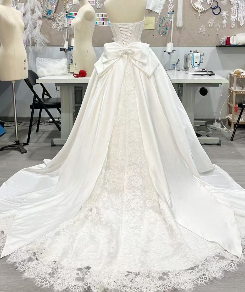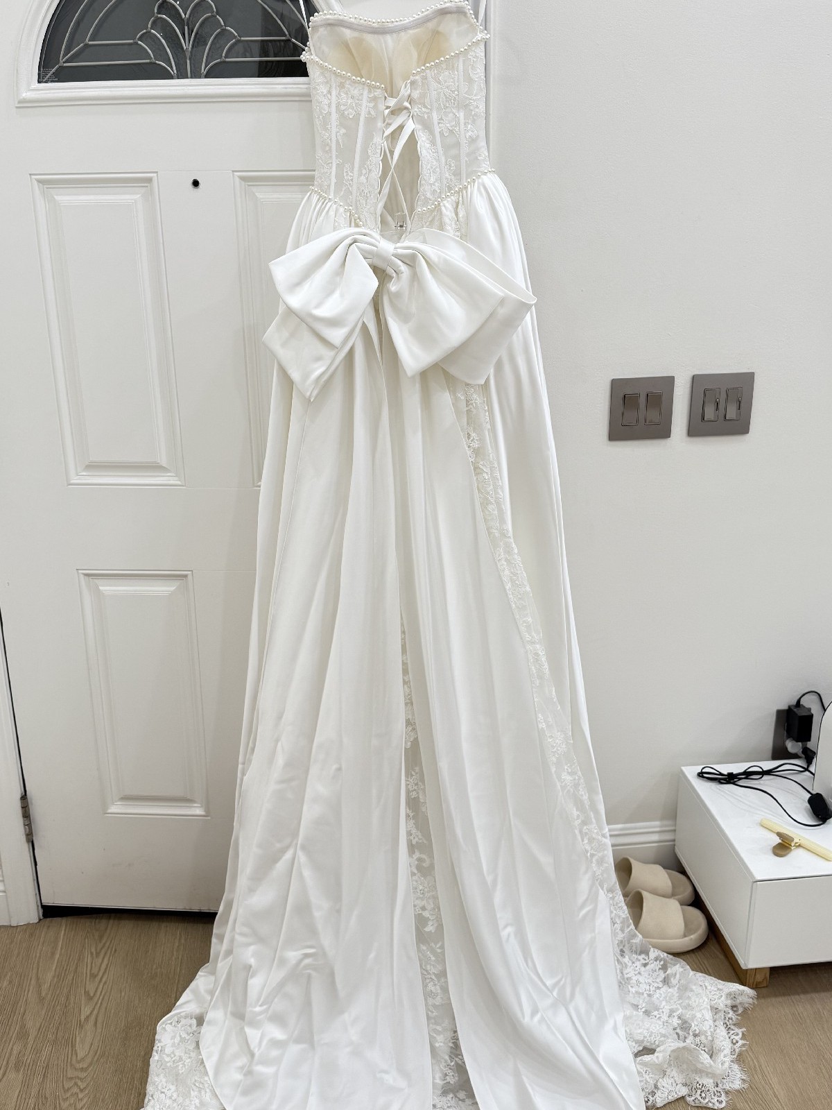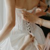 The dramatic ball gown skirt creates a timeless silhouette, while the gorgeous oversized bow at the back adds the perfect statement touch. The back is fully lace-up, allowing flexibility in fit and comfortably accommodating sizes 0–4.