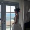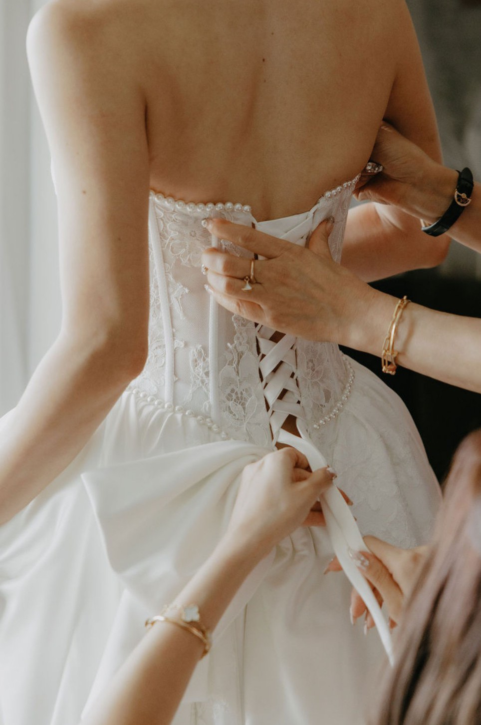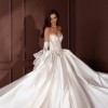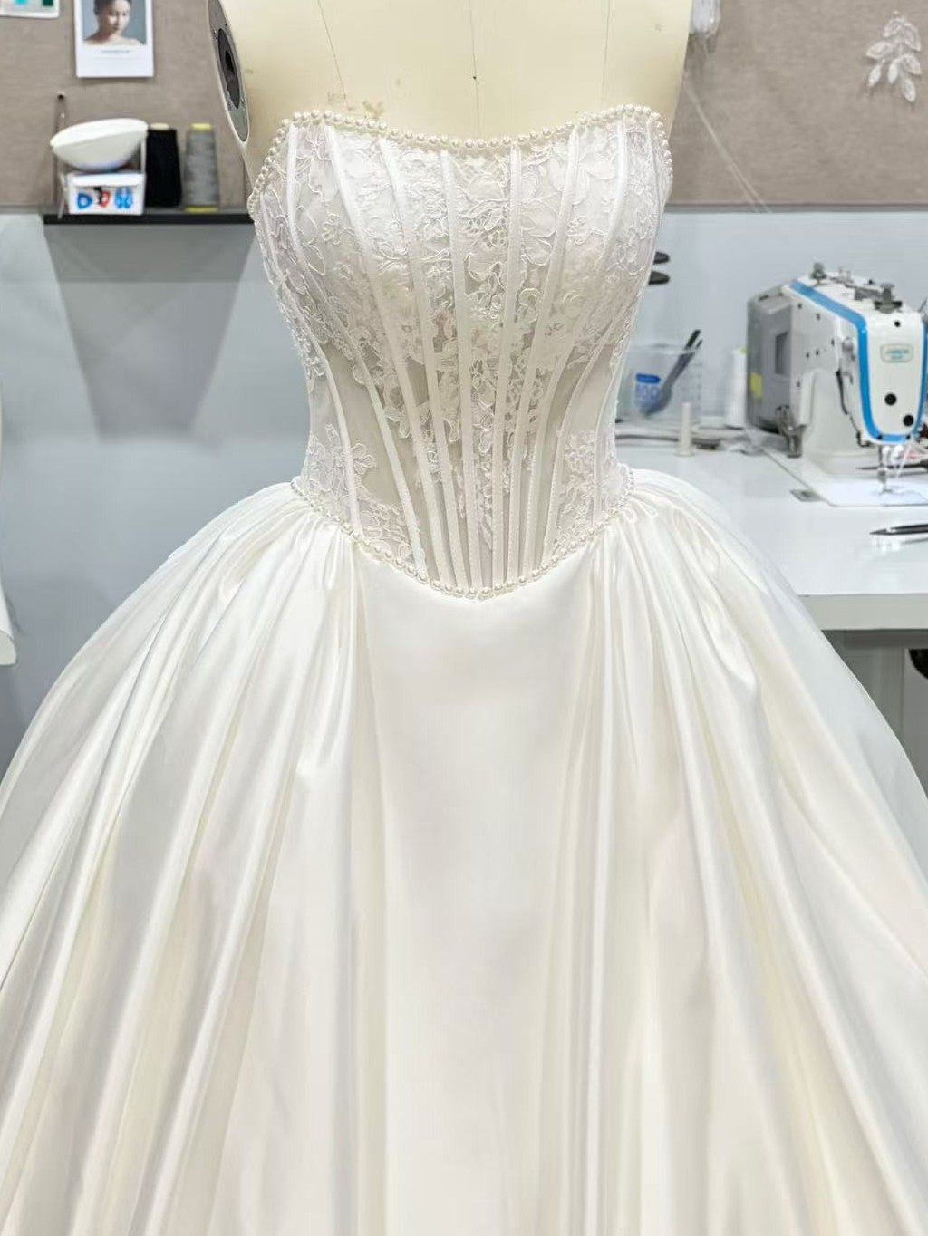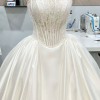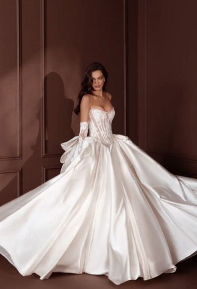 This absolutely dreamy Pnina Tornai–INSPIRED wedding gown is the perfect blend of romance and elegance. Designed in the most beautiful shade of silky satin, it features a structured corset bodice with delicate half-lace detailing and hand-sewn pearl accents along the neckline and waist for a subtle, luxurious sparkle.