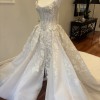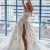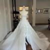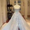 In one emphatic stroke, Laure makes an unforgettable statement, a strapless dream cut high on the decolletage, with a generous split skirt that cascades from the hips. The heavy white on white embroideries is focused on the bodice, drifting with perfect symmetry down the billowy skirt, which ends in perfect, snowy silk.