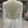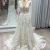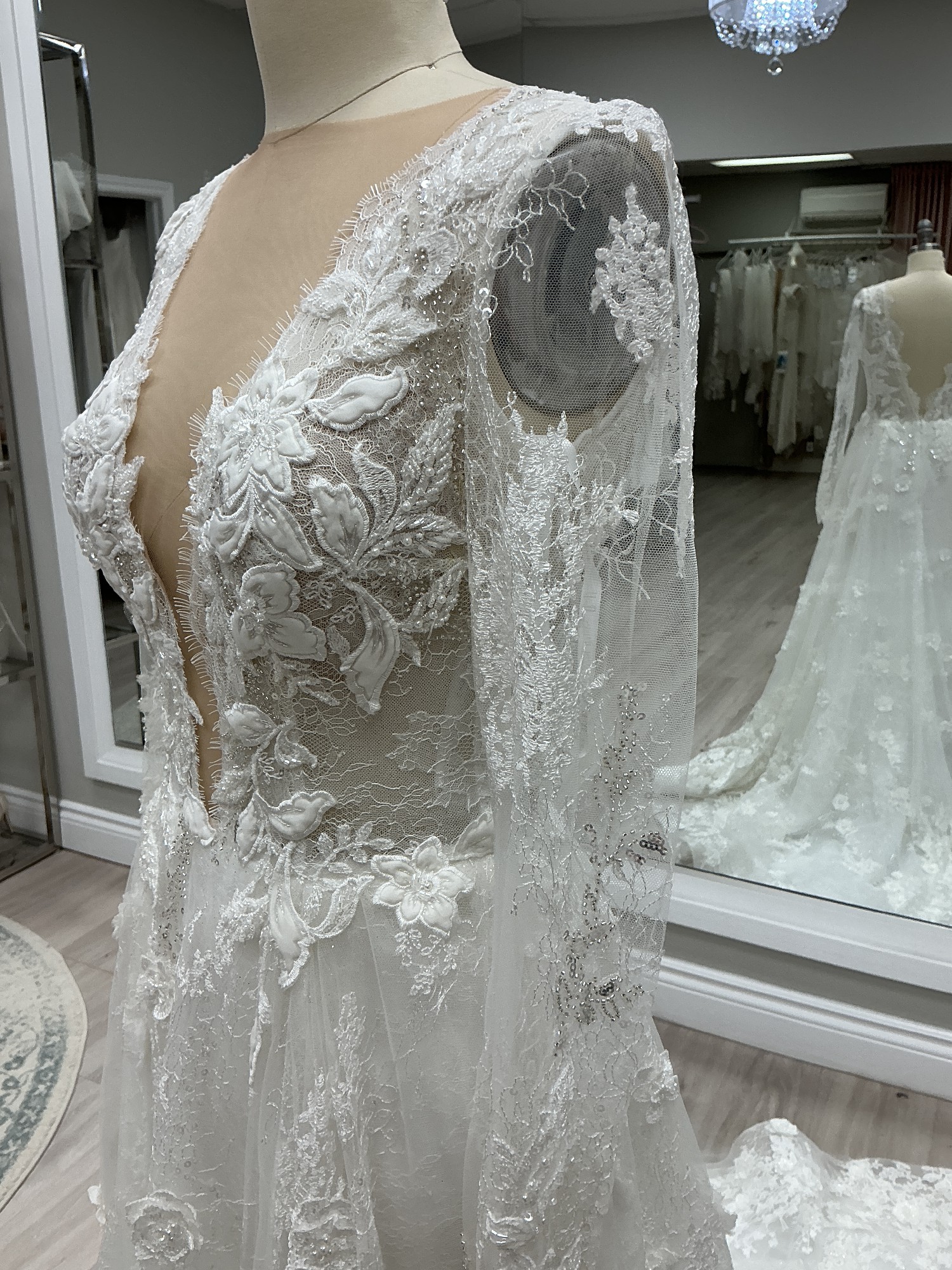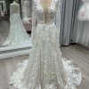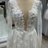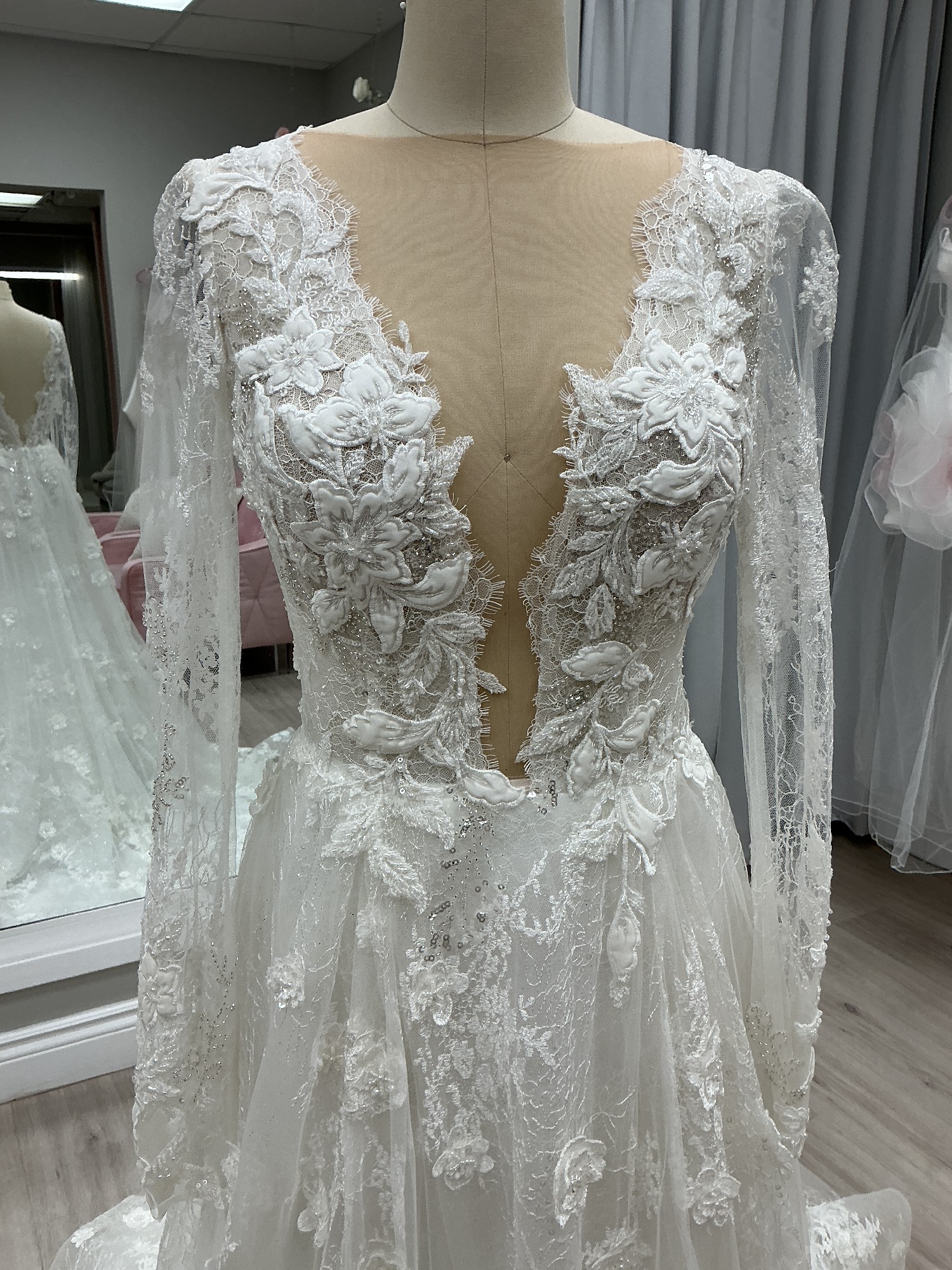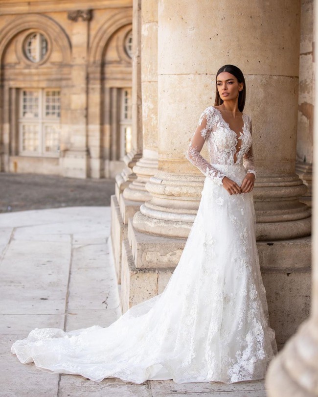 Soft A-line wedding gown designed for the bride who loves romantic elegance with refined detail. This beautiful design features long illusion sleeves, a flattering plunging neckline, and an open back for an effortlessly feminine silhouette. Crafted from delicate European exclusive beaded lace layered over soft Chantilly lace, the gown offers gentle movement and soft shimmer with every step.