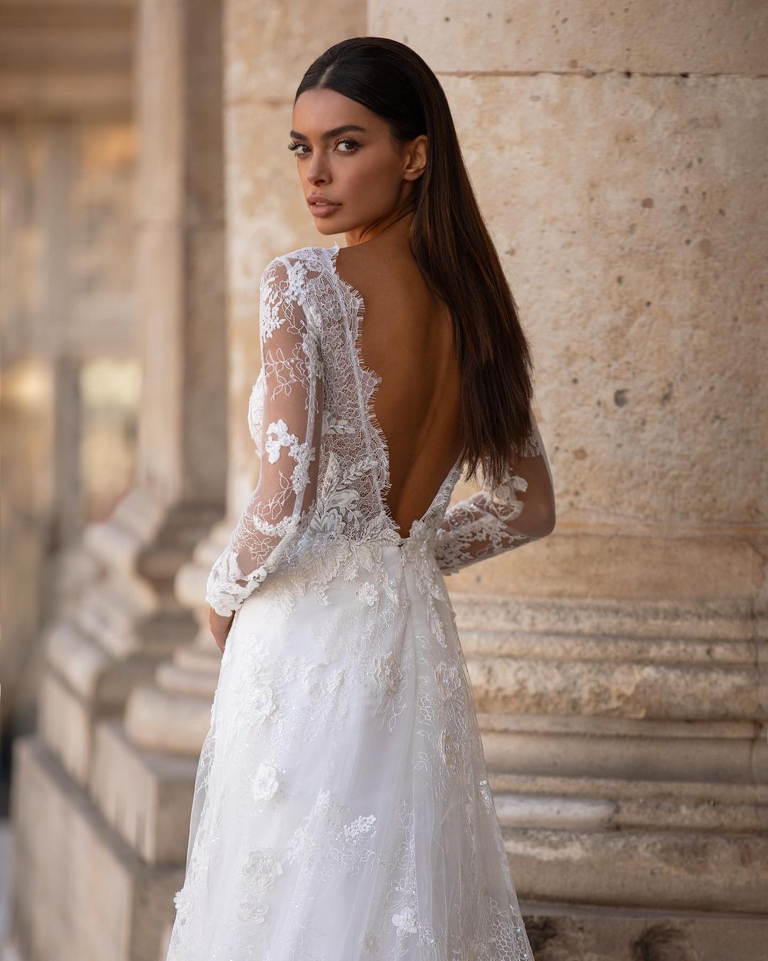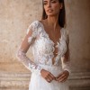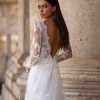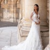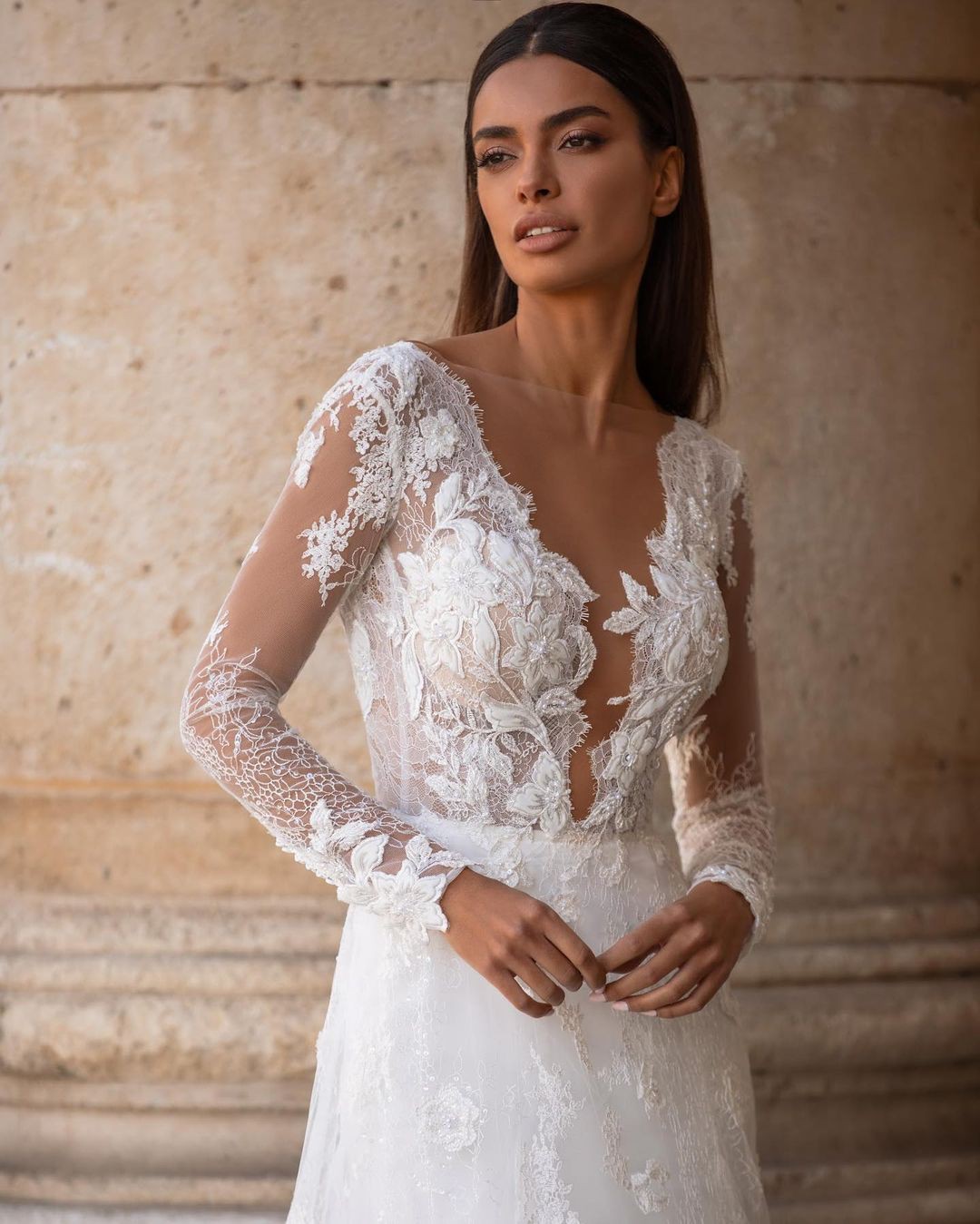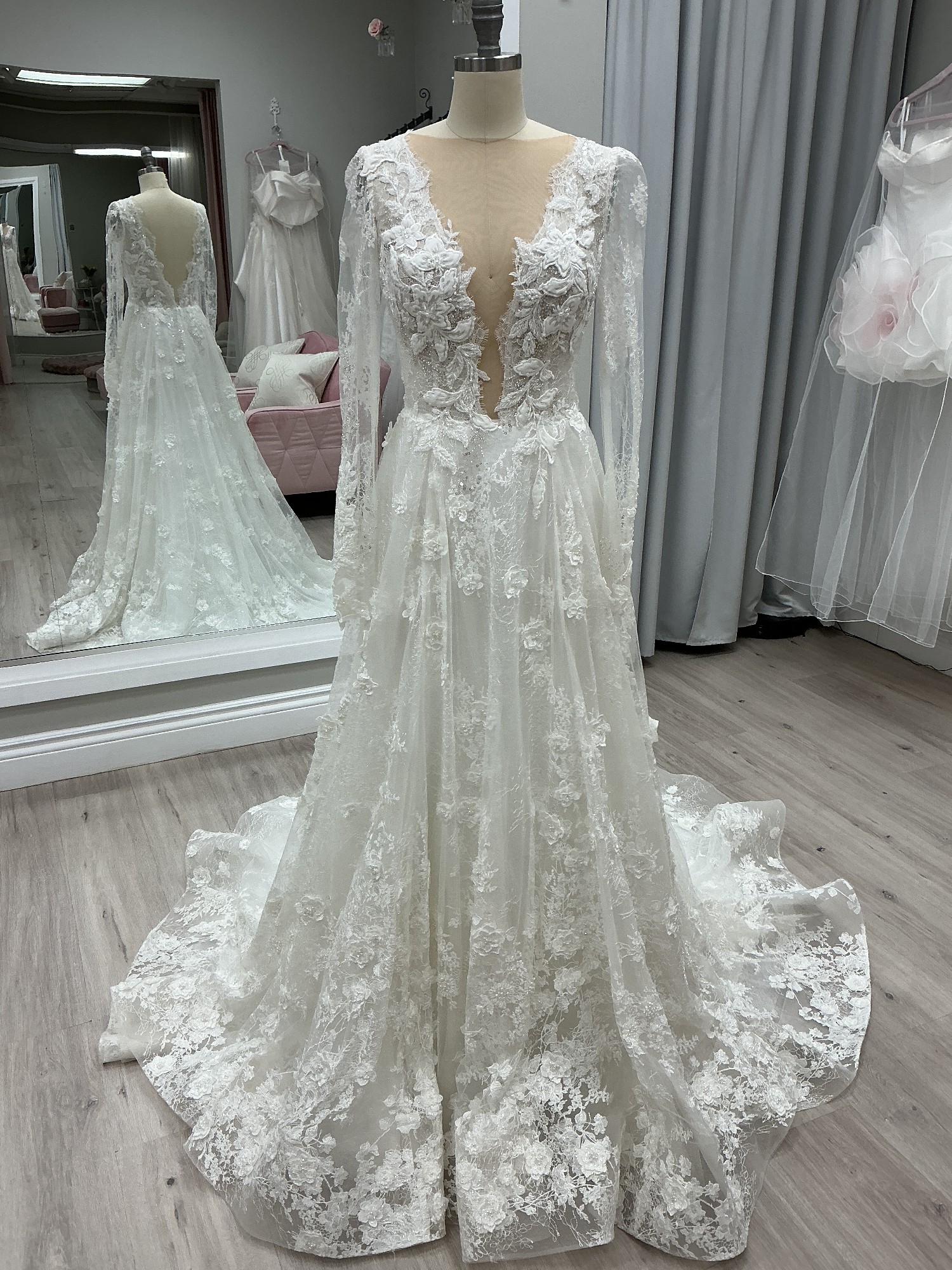 Soft A-line wedding gown designed for the bride who loves romantic elegance with refined detail. This beautiful design features long illusion sleeves, a flattering plunging neckline, and an open back for an effortlessly feminine silhouette. Crafted from delicate European exclusive beaded lace layered over soft Chantilly lace, the gown offers gentle movement and soft shimmer with every step.