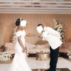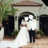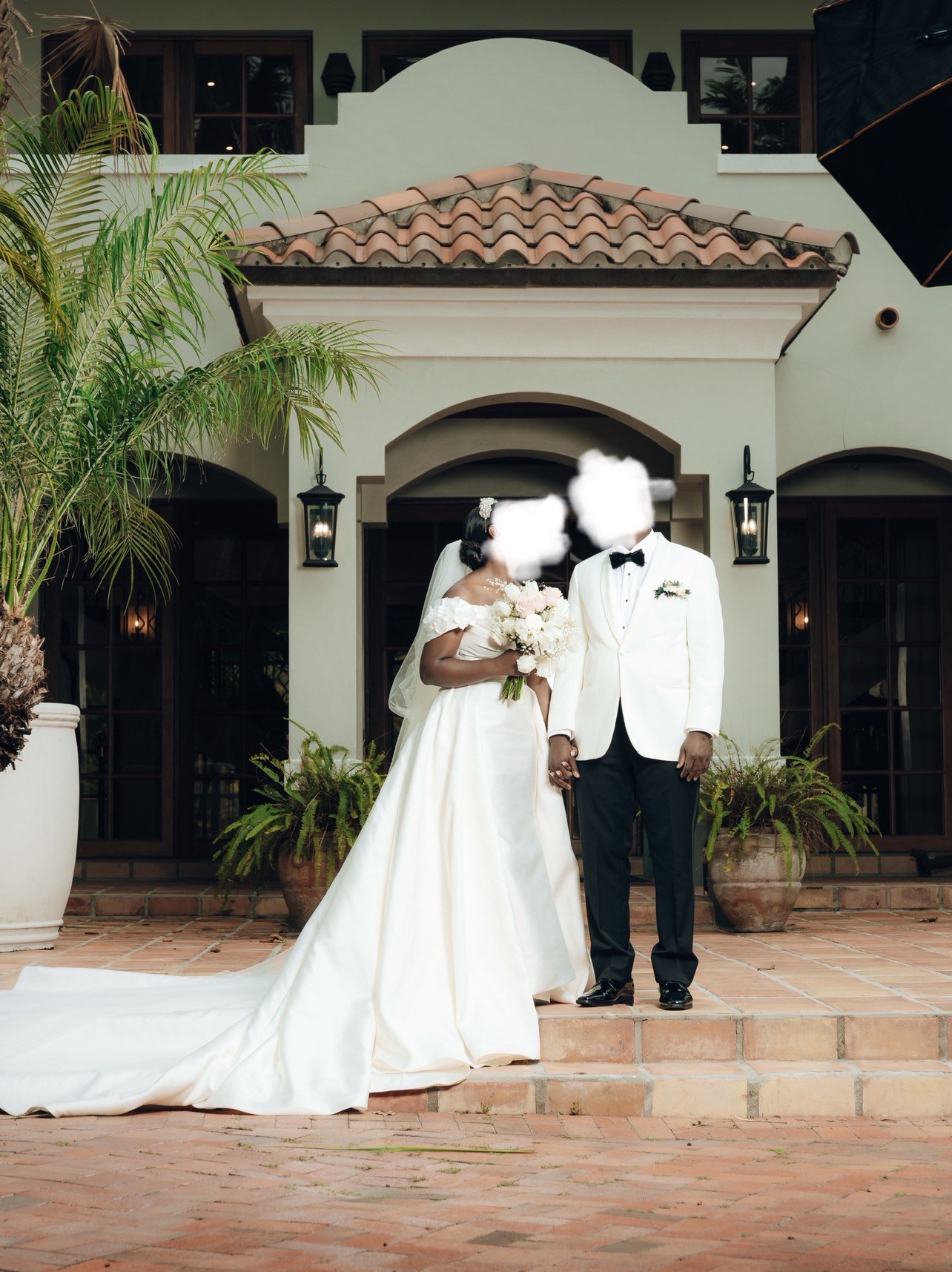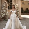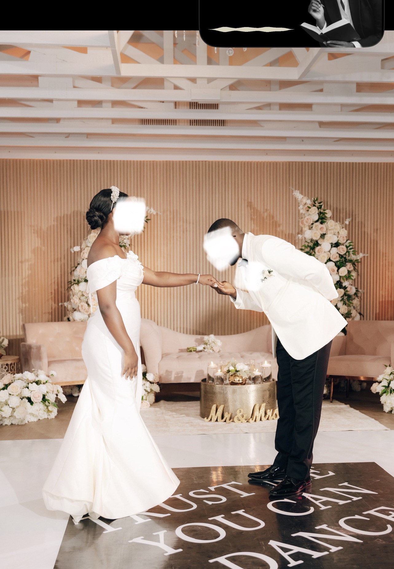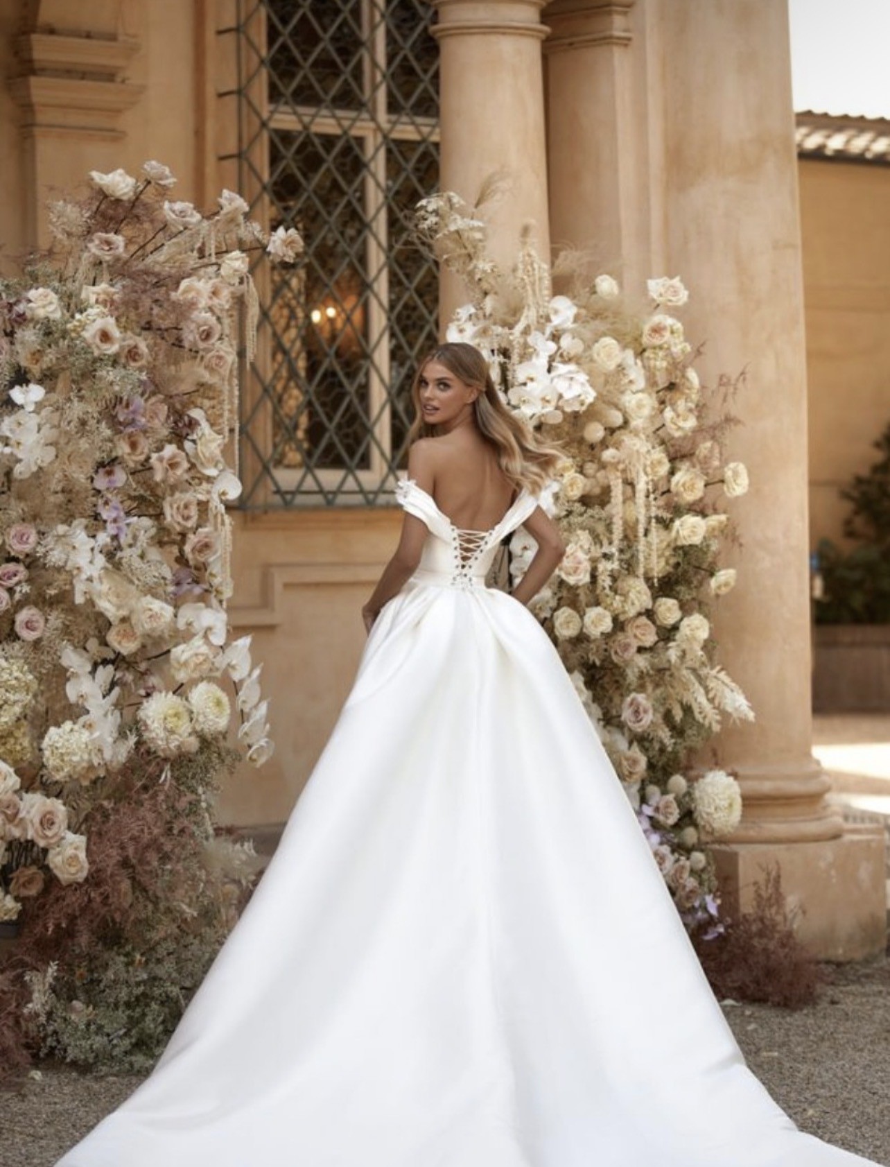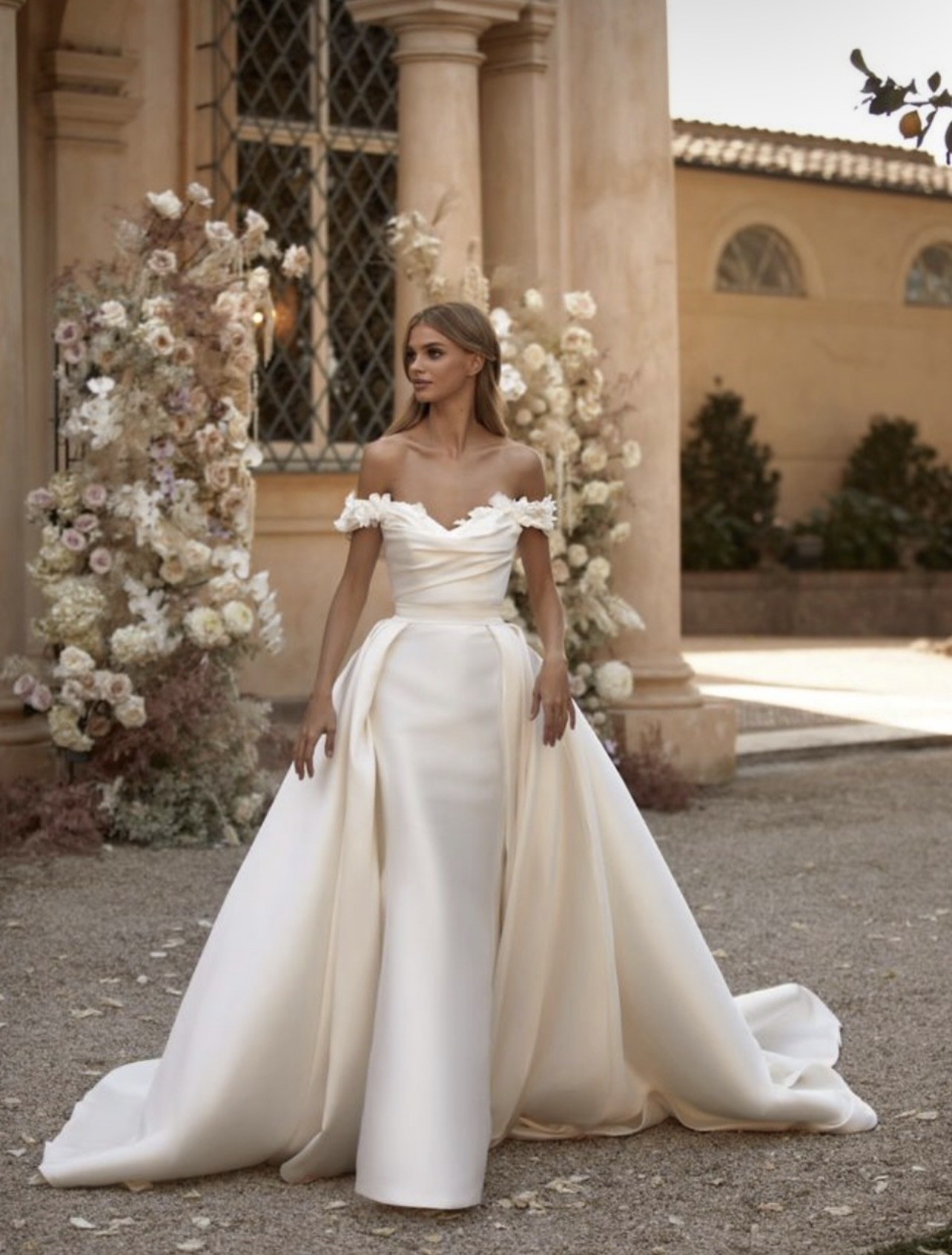 Off-shoulders ivory mermaid wedding gown made of mikado silk with a short train. Featuring a heart-shaped corset with hand made 3D flowers embroidery. It's very so slightly customised with very small pearls added inside the 3D flowers too. The dress comes with the gorgeous princess train Luciana, and the 2-tier cathedral veil that fits the length of the overskirt (ie. it's a very long veil) US 6 size for the detachable skirt The dress was professionally altered and shortened a few inches so I could dance comfortably without tripping. Please see photos for reference. Best fits someone 5’2” or below. The overskirt was not altered and features a corset back for adjustable fit.