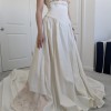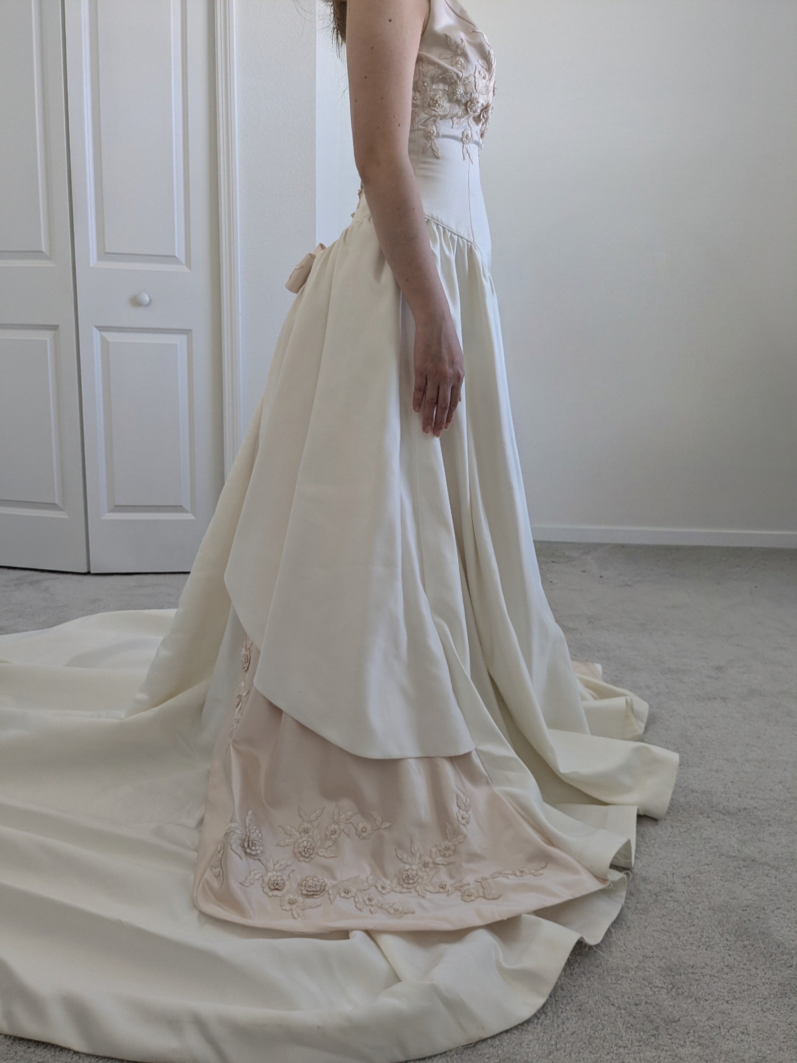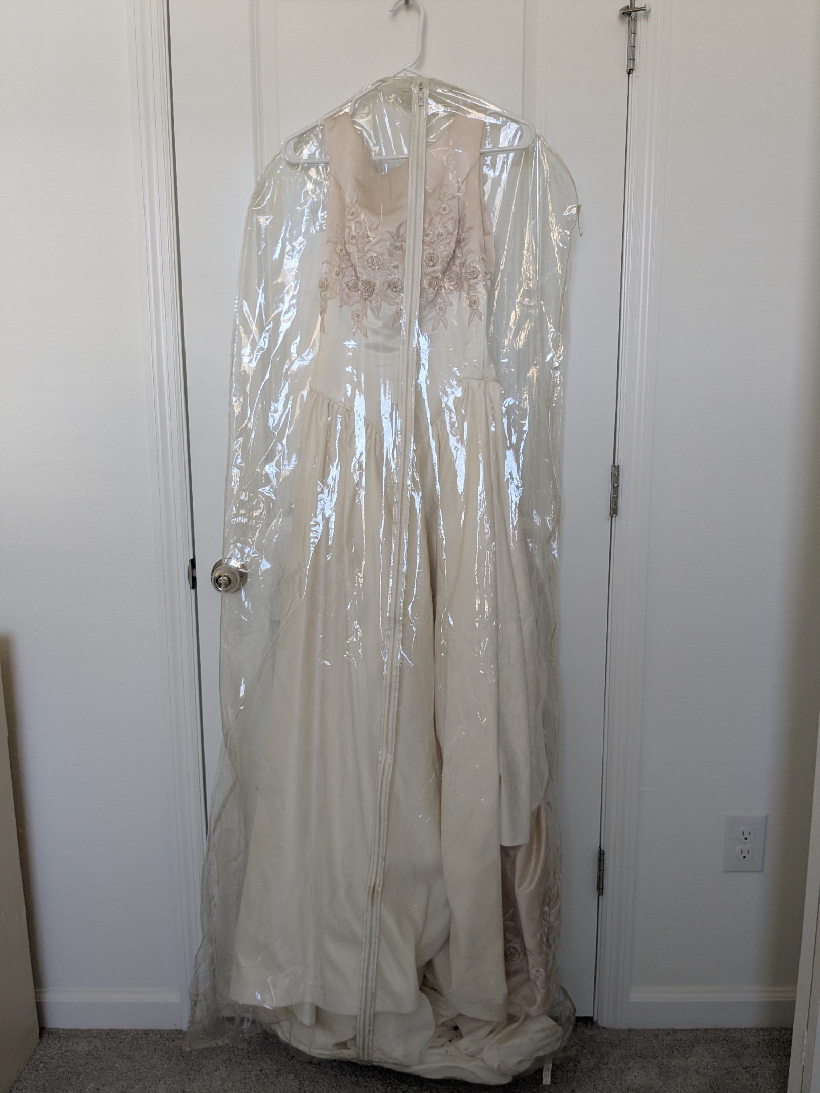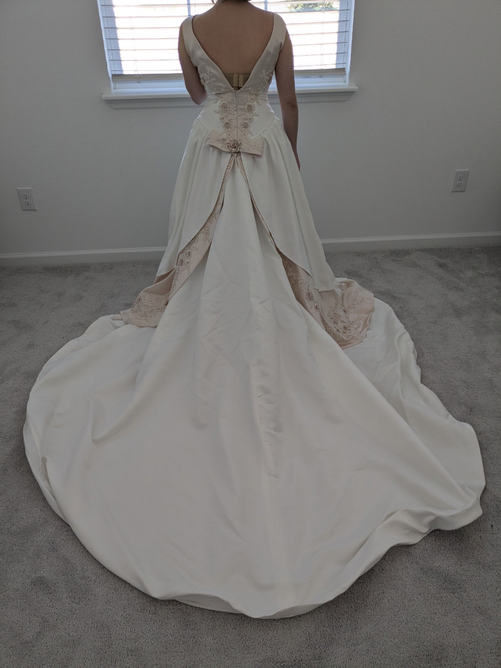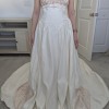 There are some marks along the front hem and train as shown in the video. Some threads are also loose, mostly along the hem of the gown. It is otherwise in good condition with no odors or rips as far as I can see. Comes with the storage bag and hanger. Open to negotiation.
