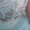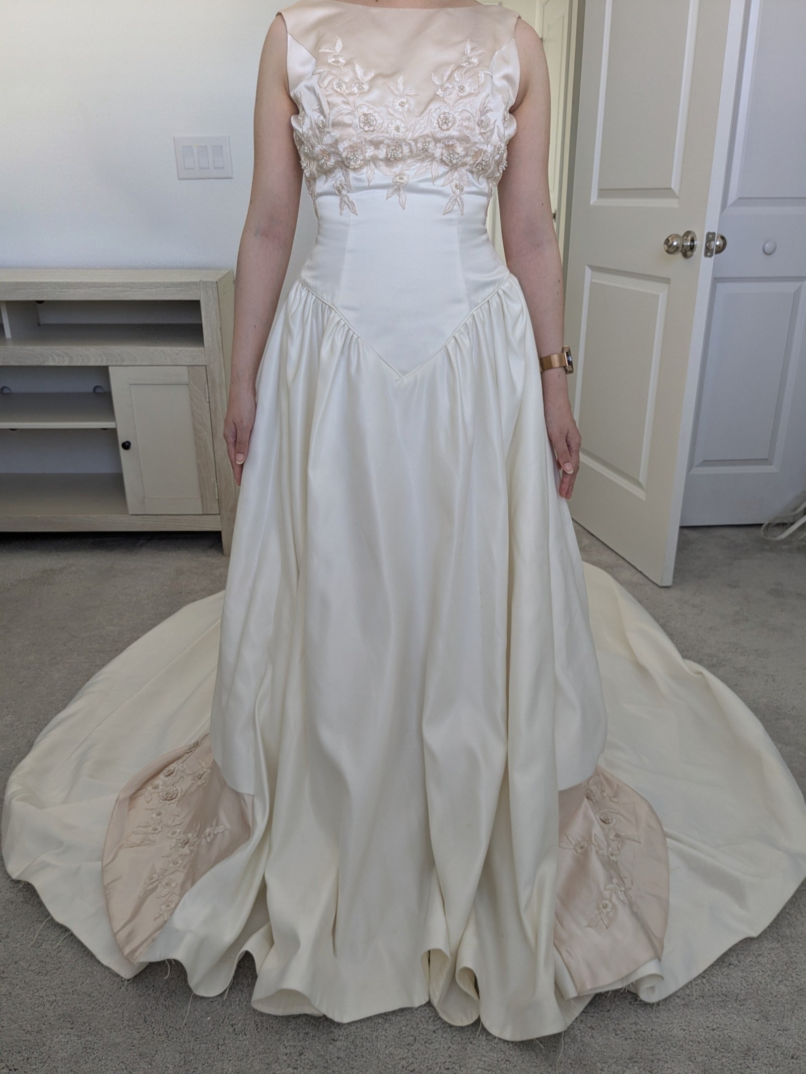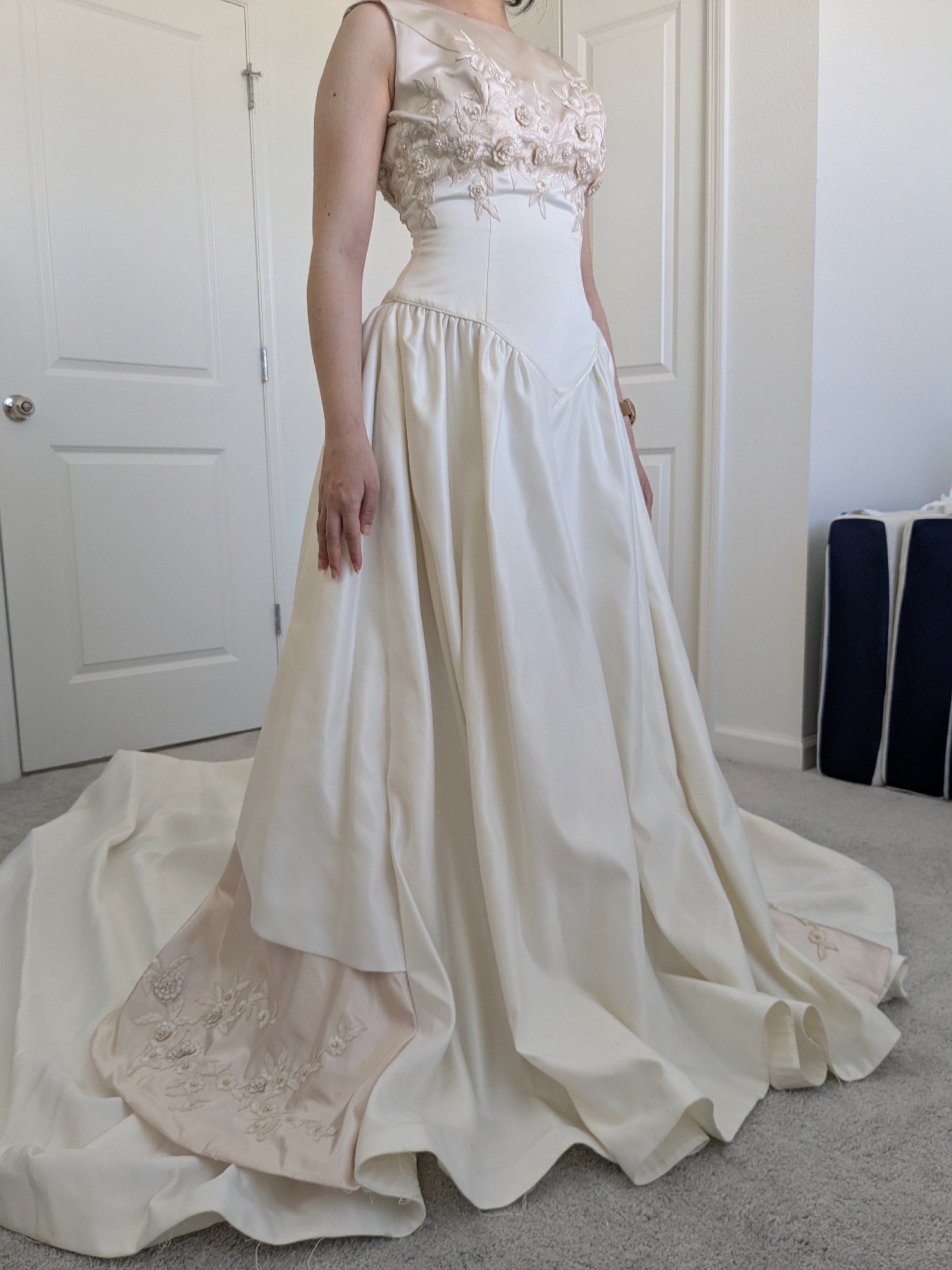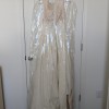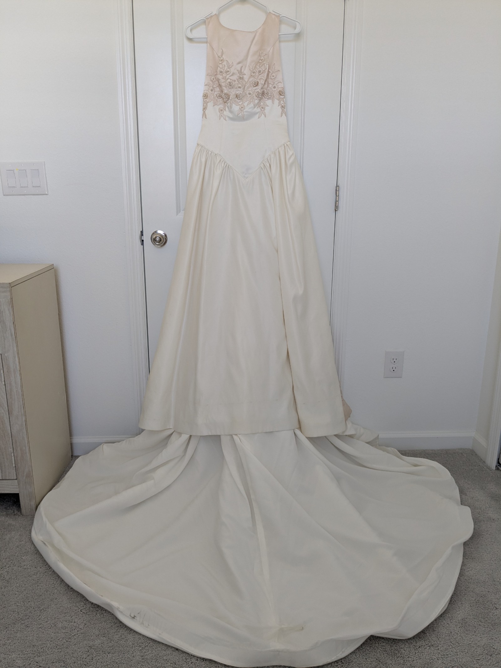 There are some marks along the front hem and train as shown in the video. Some threads are also loose, mostly along the hem of the gown. It is otherwise in good condition with no odors or rips as far as I can see. Comes with the storage bag and hanger. Open to negotiation.