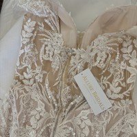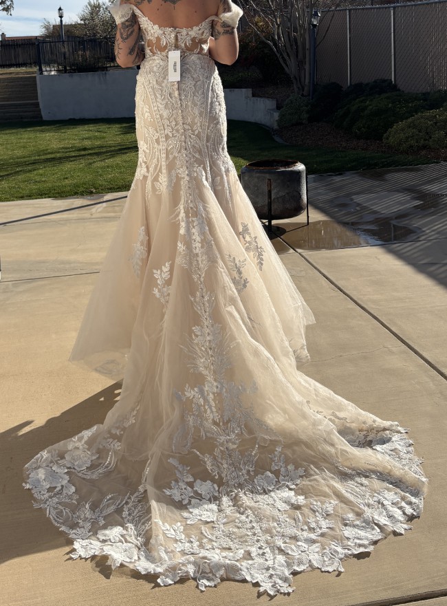 This dress is brand new and never been worn except to take the photos shown. Original tags are still in place. The bride found out 2 months after purchasing the dress that she was pregnant, and would no longer be able to fit the dress at the time of her wedding.