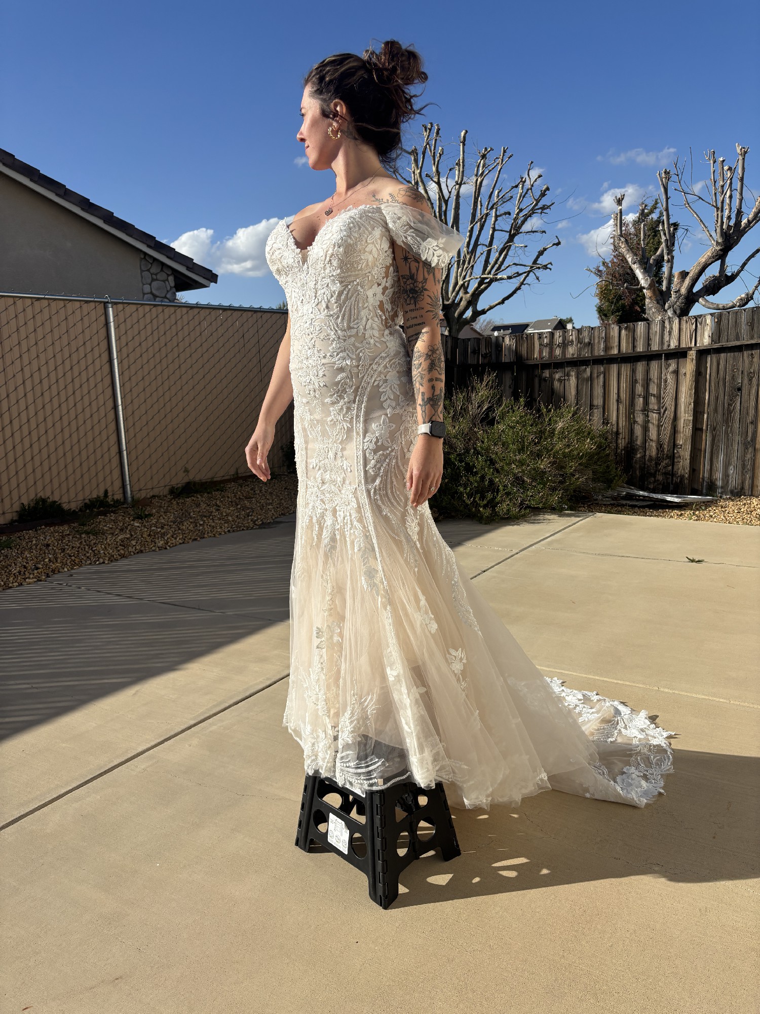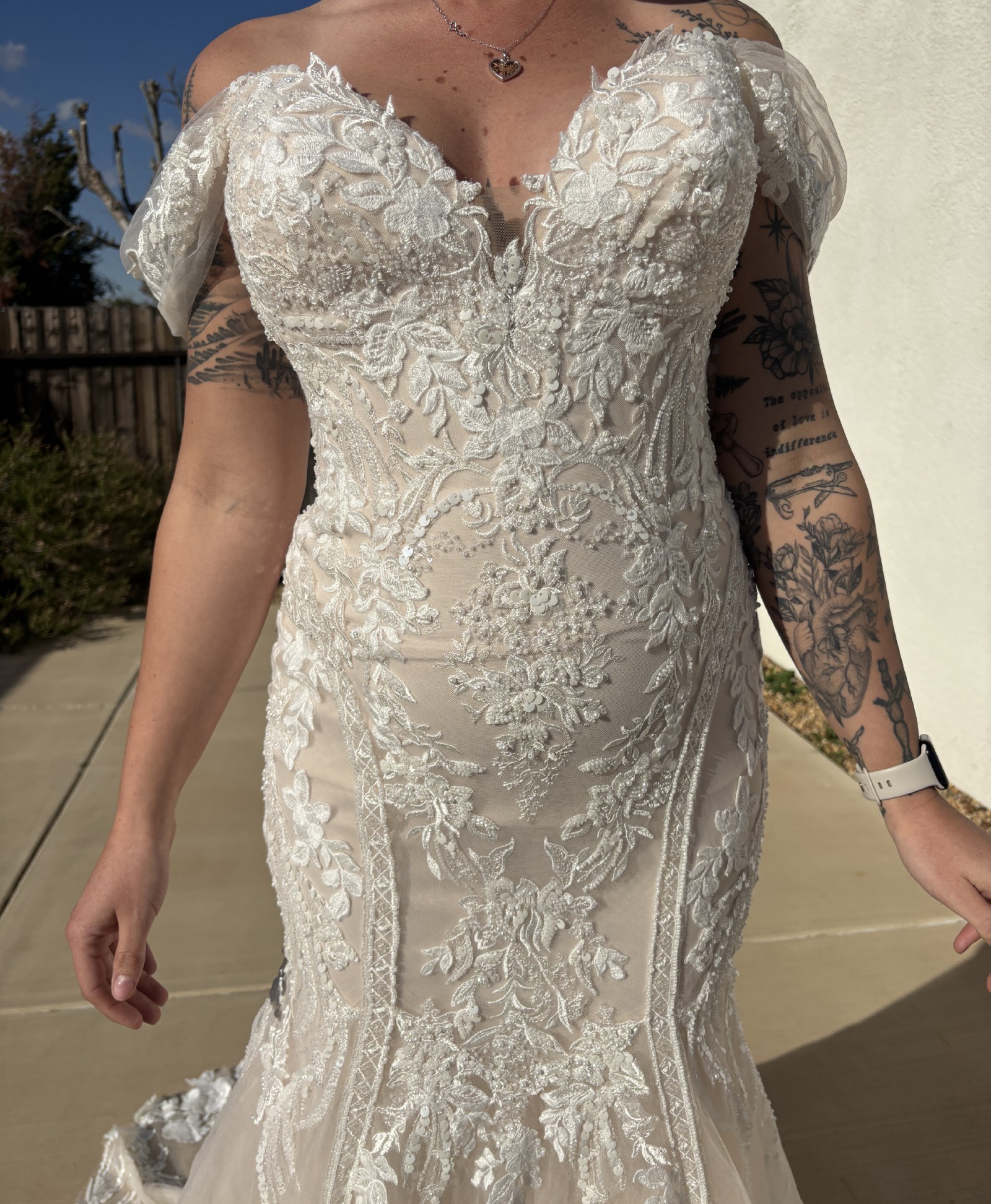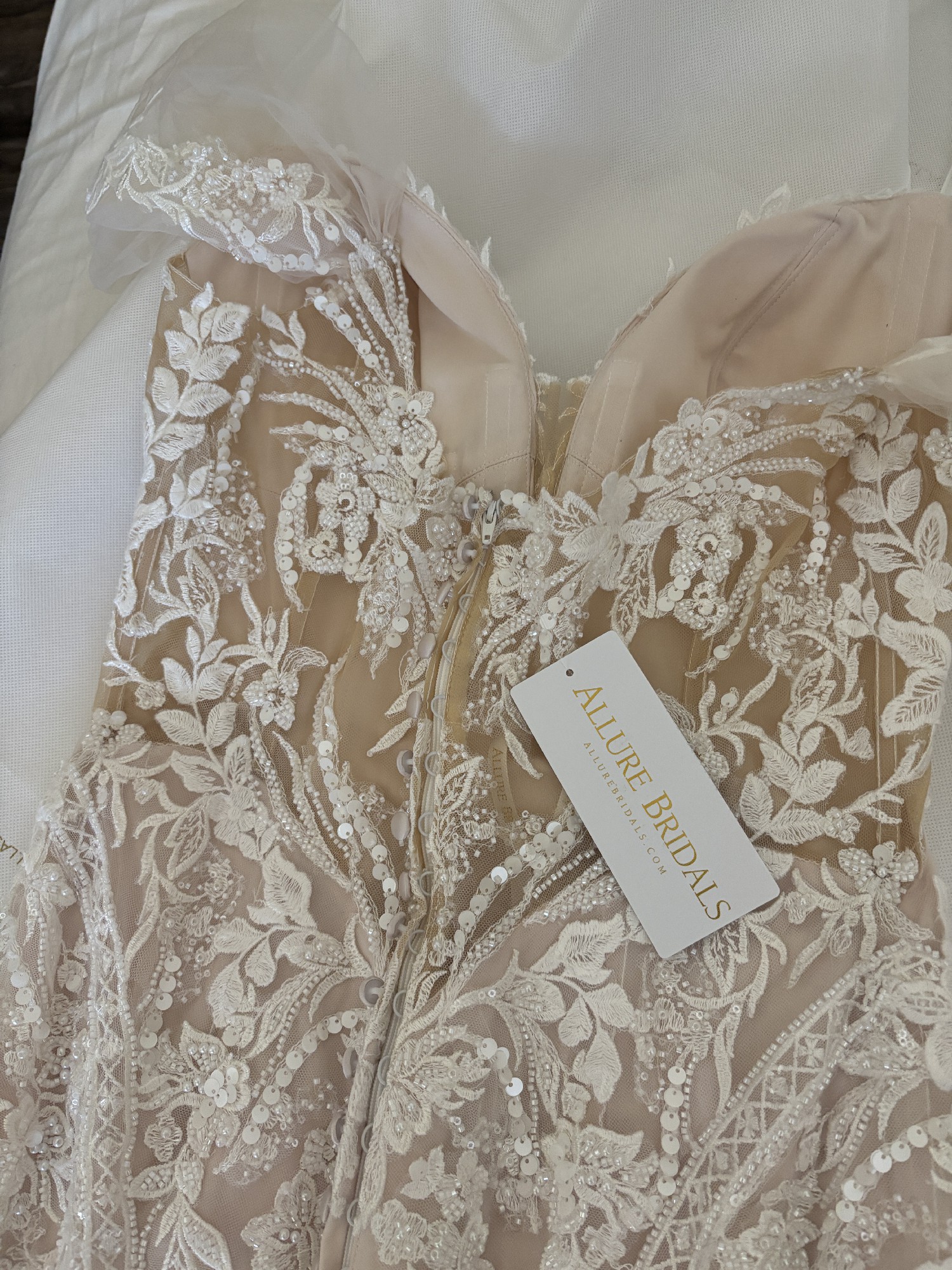 This Allure Bridals wedding dress is a stunning embodiment of romance and sophistication, perfectly designed for the bride who desires to make a memorable entrance on her special day. The exquisite fit and flare silhouette accentuates your curves, while the off-the-shoulder neckline adds a touch of timeless elegance.