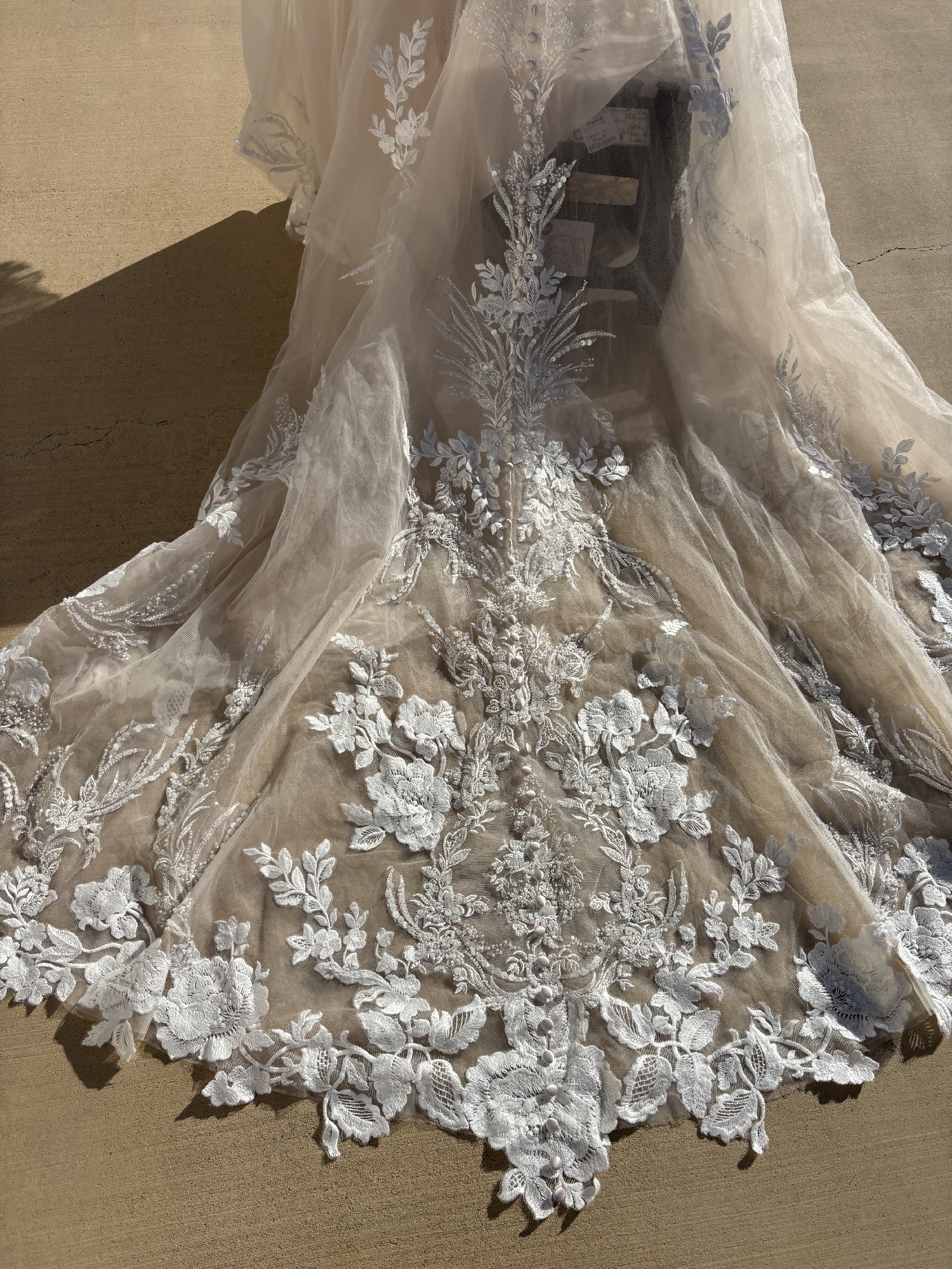 Draping gracefully to the floor, this floor-length gown is the perfect choice for any wedding theme, whether it's a grand celebration or an intimate gathering. Embrace your inner goddess and step into the spotlight on your wedding day with this enchanting designer masterpiece, destined to create unforgettable memories.