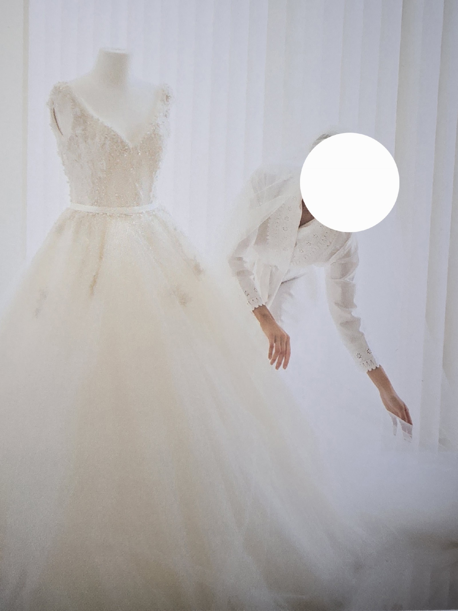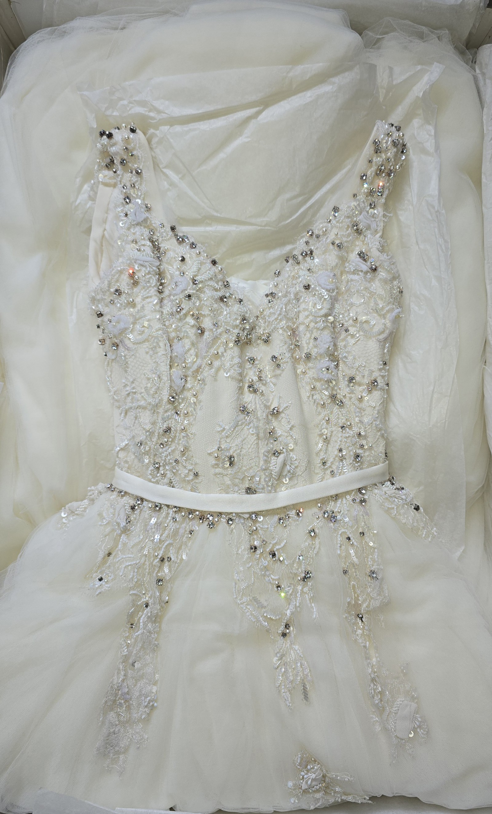 This custom made Leah Da Gloria wedding gown is a gorgeous one of a kind design, fit for a princess. The bodice includes a mixture of French and Italian lace, hand beaded using Swarovski crystals, pearls, sequins and beads. The bodice is fitted and beautifully flattering around the waist, and then comes out at the bottom in true ballgown style with layers of the softest and most beautiful tulle. It is truly classic and timeless. The dress is professionally dry cleaned and packaged in its own box (please see photos). Detachable bow for the back of the dress may have been misplaced by drycleaning company, as it isn't clearly visible as you open the box, but it might have been placed inside - the dress has not been touched since it was dry cleaned and packaged.