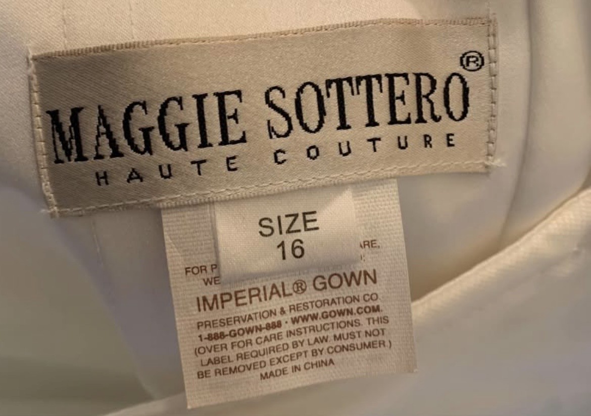 Beautiful authentic Maggie Sottero couture wedding gown in size 16. This gown features a fully beaded strapless bodice with structured corset back, flattering dropped waist, and gathered skirt. Classic romantic silhouette with timeless sparkle.