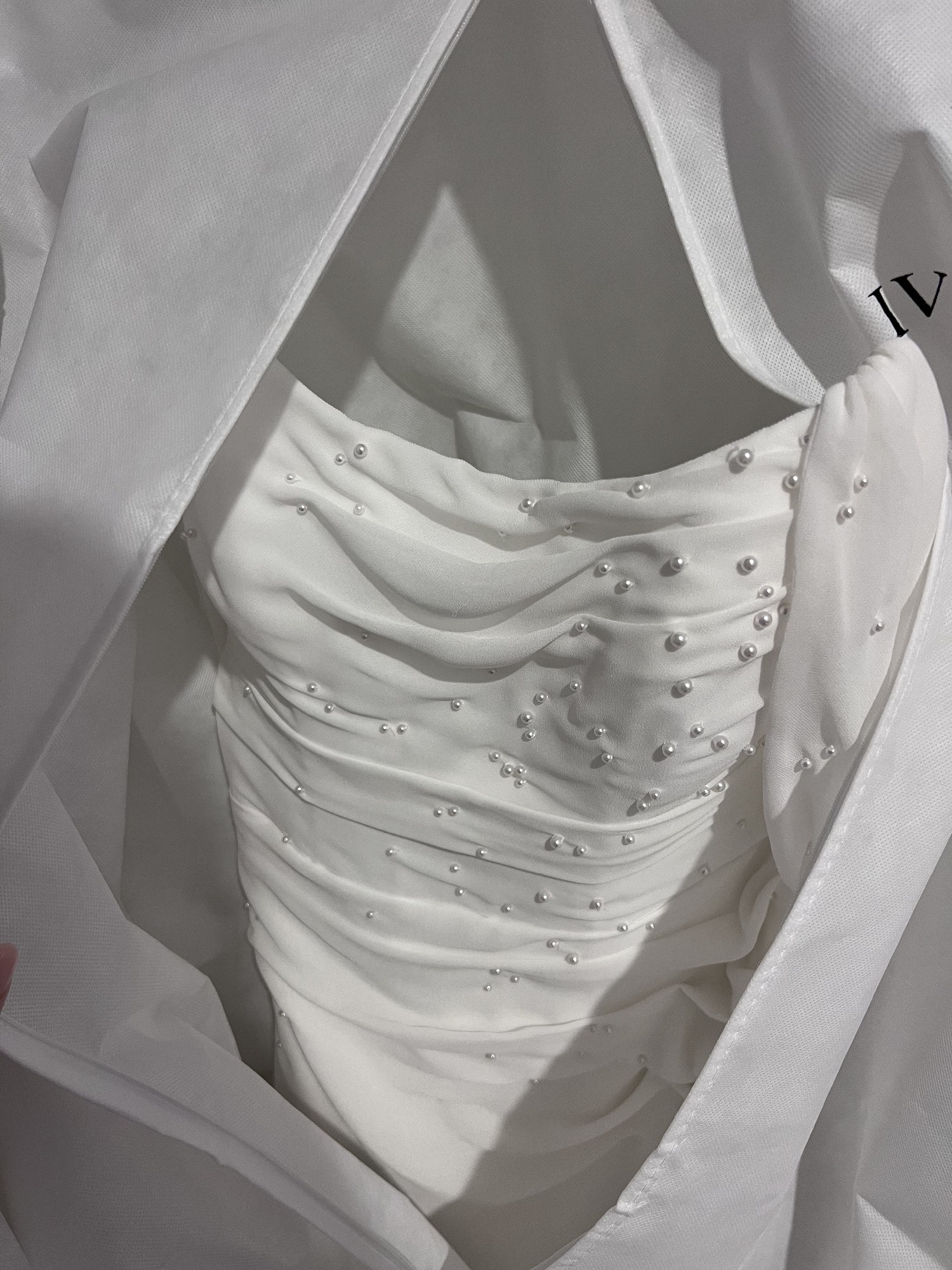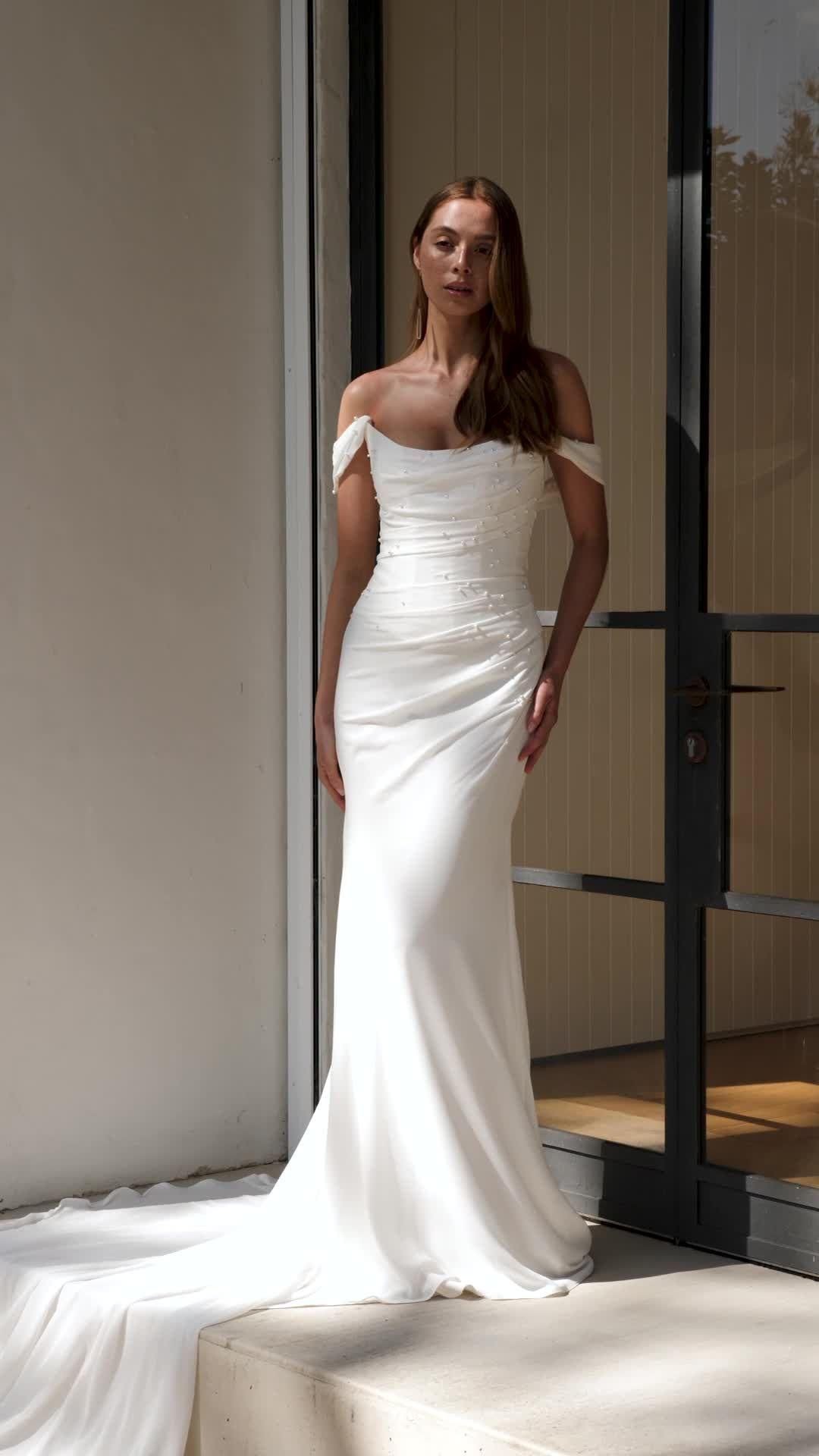 Sophistication, timelessness, and true love. The Snowberry gown embodies divine femininity with a drop waist draped Chiffon corset finished with a scattering of hand-sewn opulent pearls. The attention to detail and craftsmanship dedicated to this gorgeous gown will leave you feeling lavished and adored.