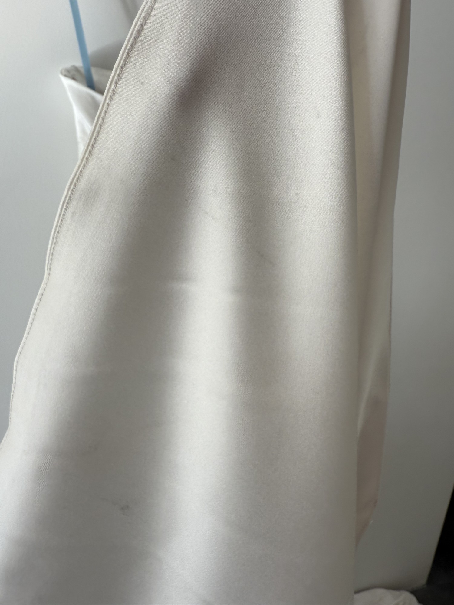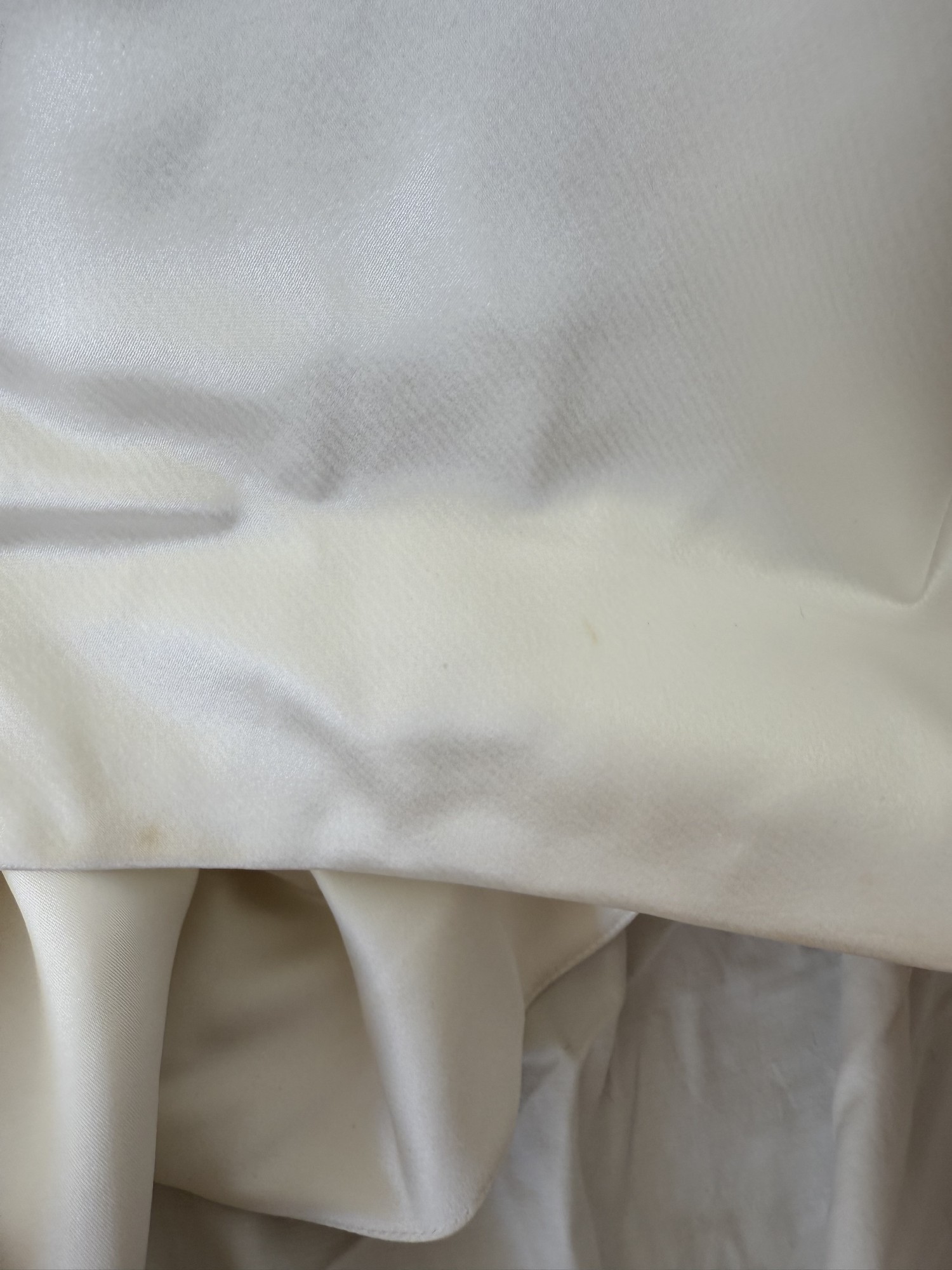 Worn once and dry cleaned straight afterwards. Some minor markings on parts of the hem of the dress and bottom of the train, hence the price. These may be able to come out with further dry cleaning or be cut off with hem alterations.