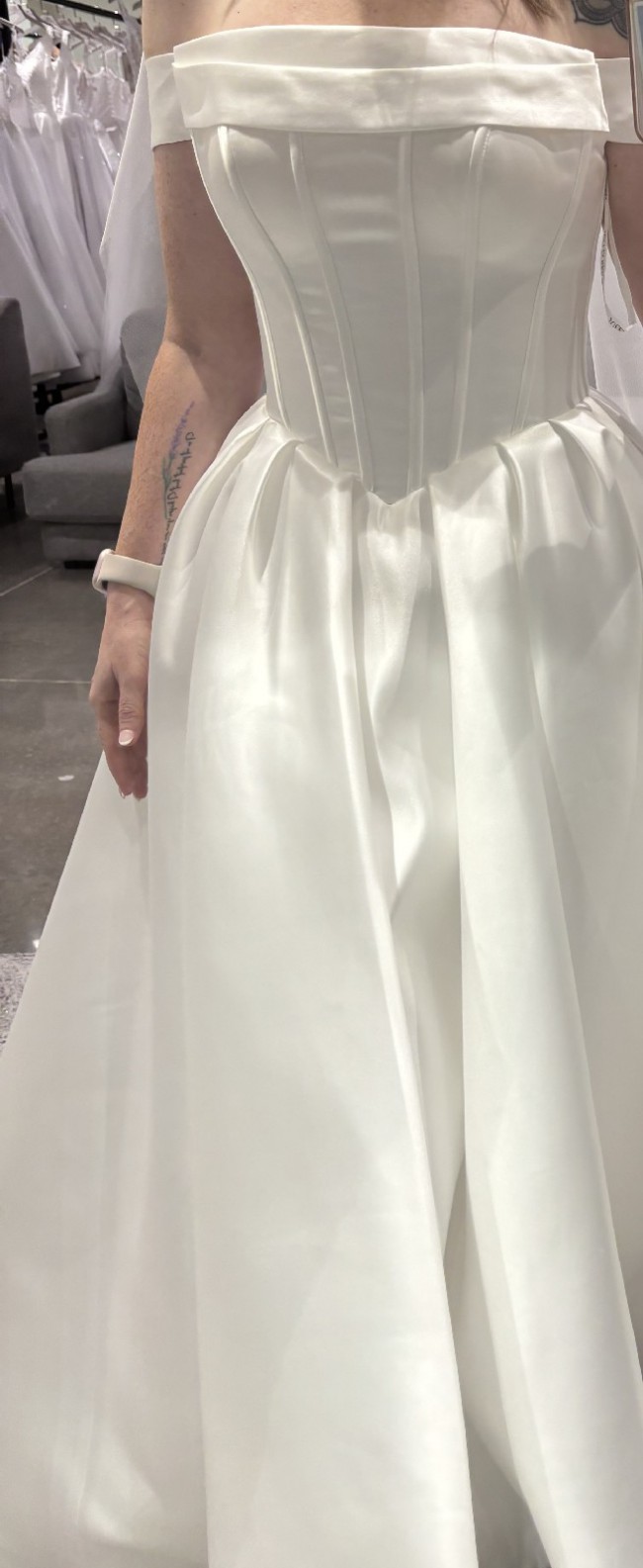 Brand New, change of mind due to having a destination wedding and the dress will be too heavy for the climate overseas.. regretful sale!