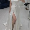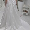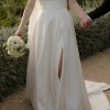 The low back gives an alluring edge, complemented by a stunning high slit that adds a dash of drama and playfulness to the overall look. This gown flows gracefully, effortlessly capturing the spirit of a modern bride while still embracing timeless elegance.