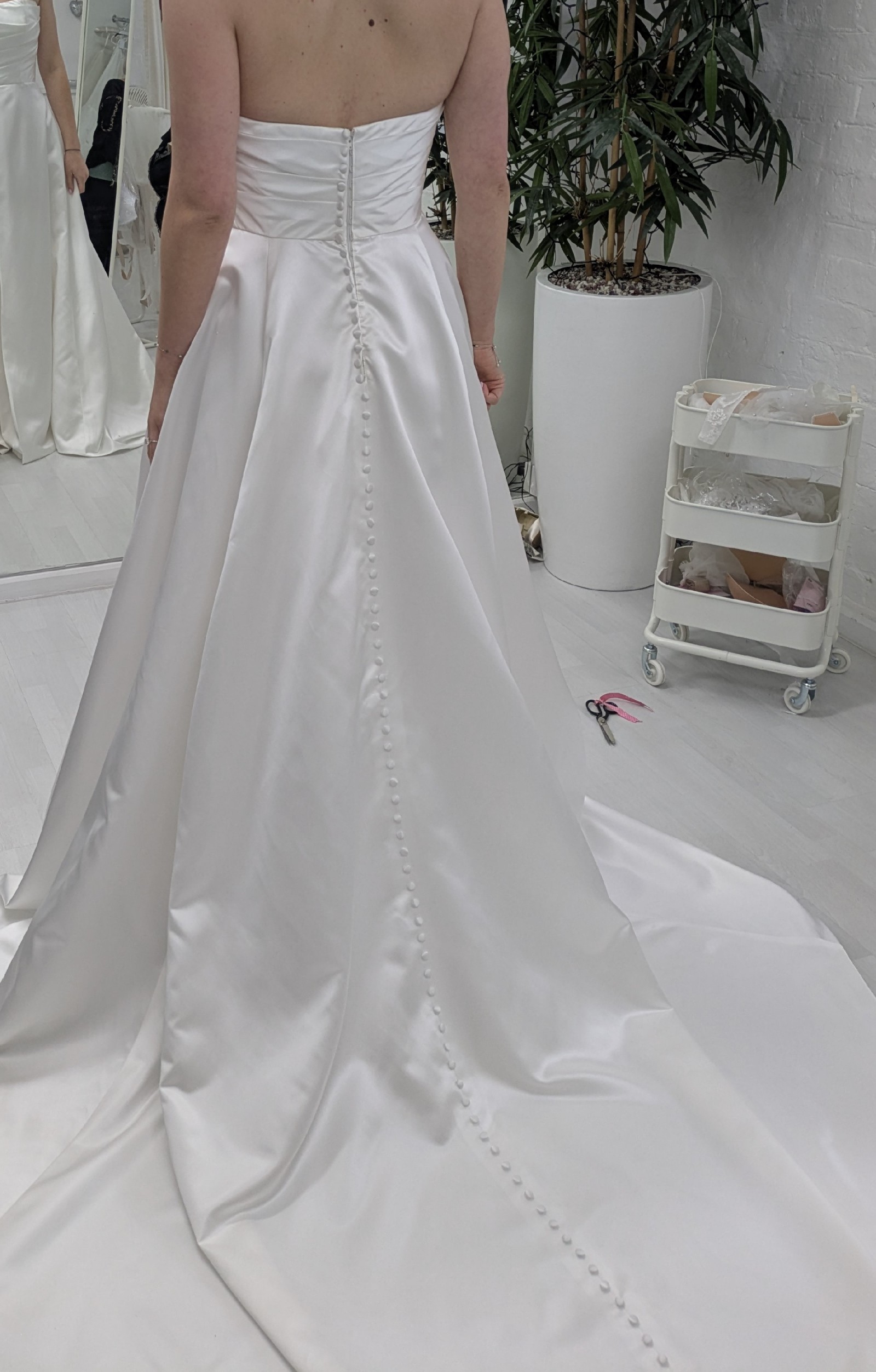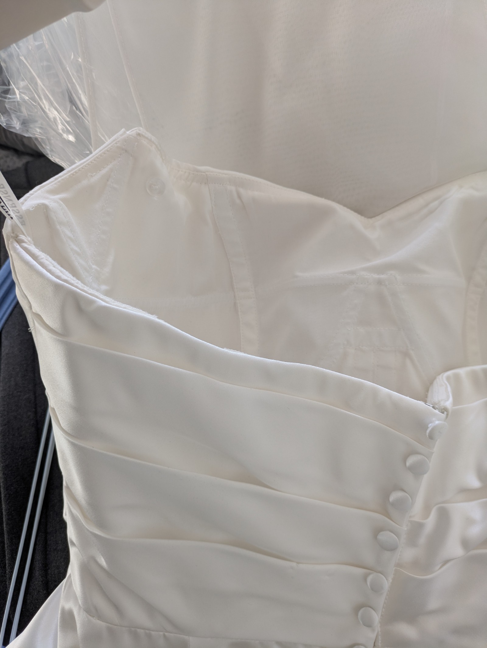 This Essense of Australia D3794 wedding dress was the embodiment of my dream day. The moment I slipped it on, I knew it was the perfect fit, with an elegant A-line silhouette that accentuated my figure beautifully. The curve neckline adds a touch of romantic sophistication, while the strapless design allows for ease of movement as you dance the night away.