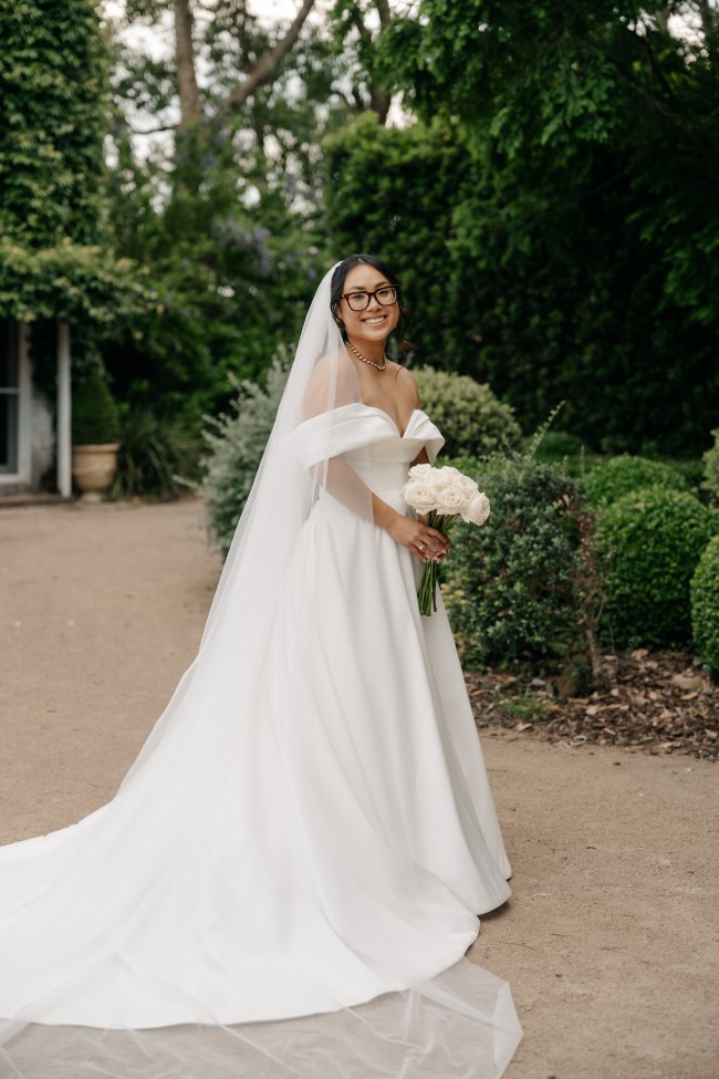 This stunning Athos dress by Pronovias is a true embodiment of elegance and romance. As soon as I slipped it on, I felt like a vision of bridal beauty. The off-the-shoulder neckline frames the shoulders beautifully while adding a hint of allure, making it both classic and timeless. The A-line silhouette gracefully flows to the floor, creating a figure-flattering shape that is both comfortable and enchanting.